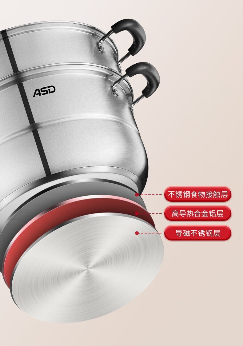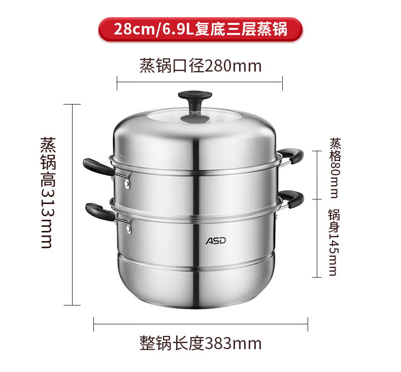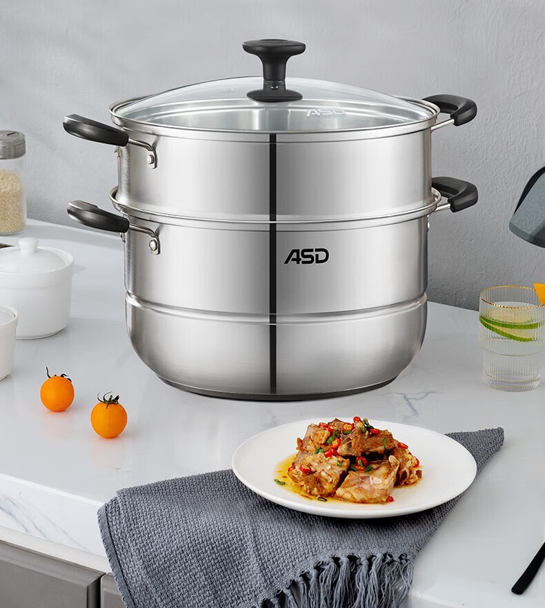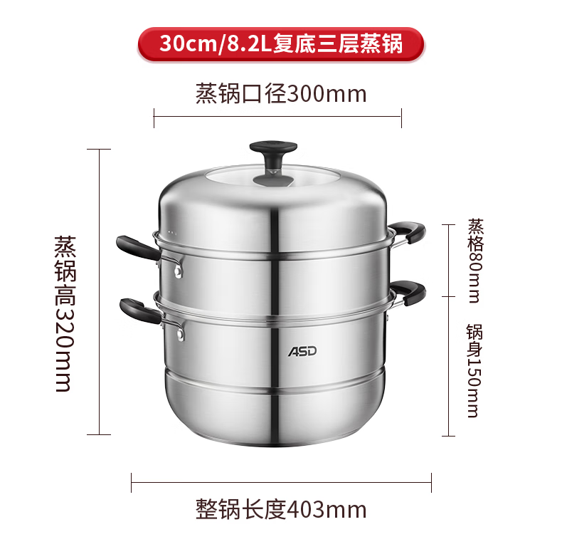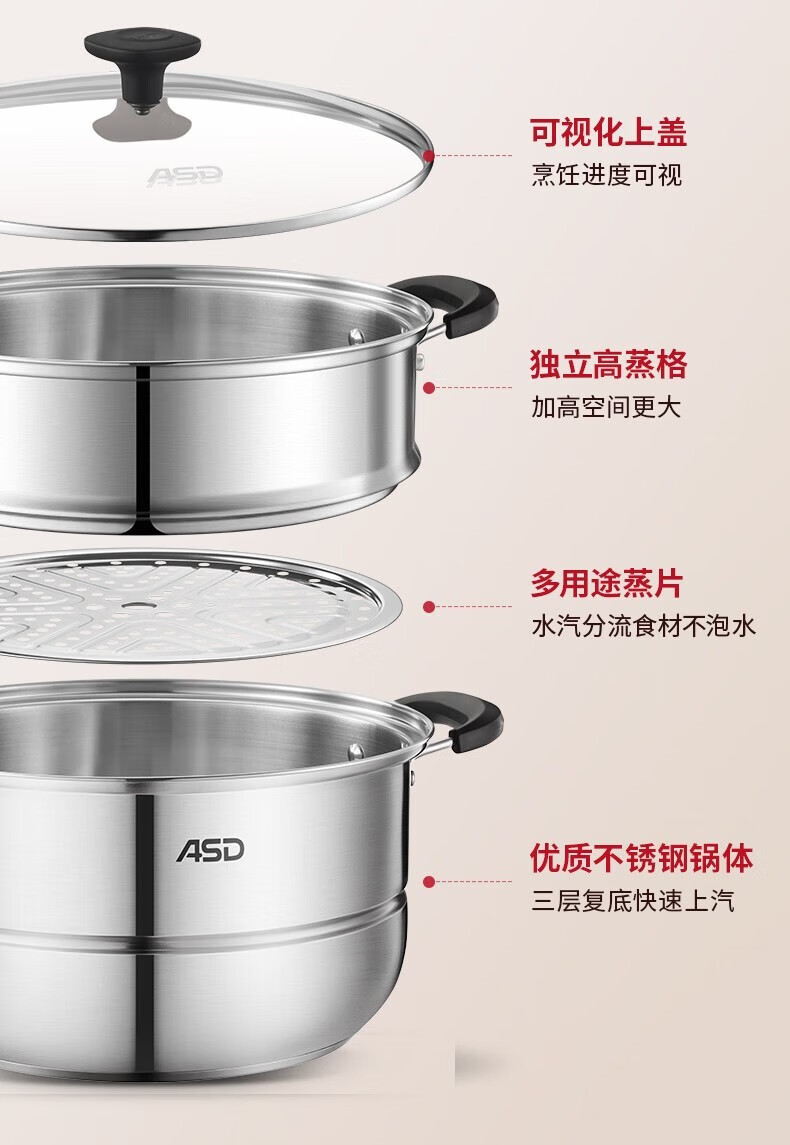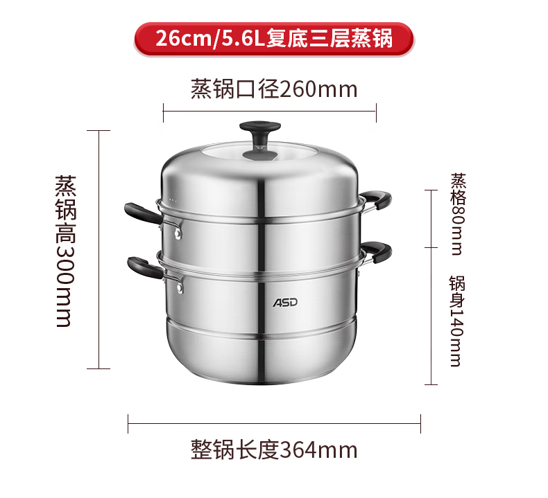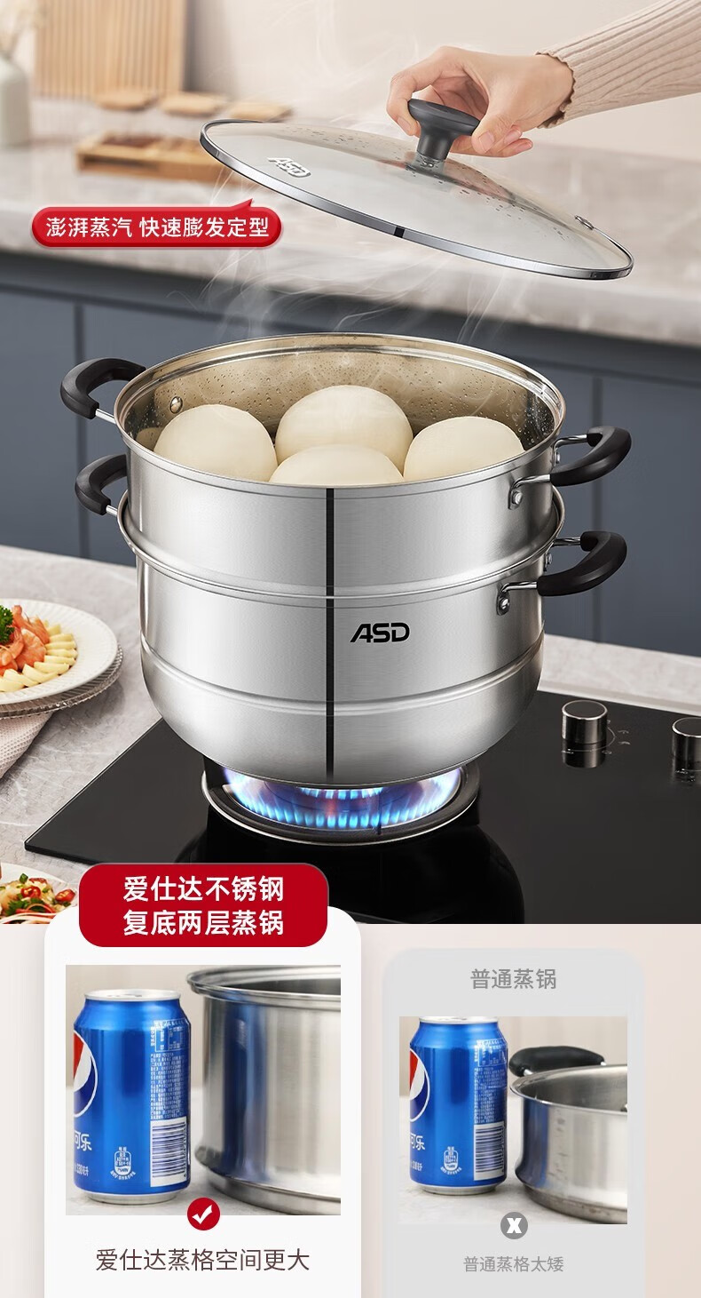 ASD Steamer Stainless Steel Steamer Thickened Bottom with Steamer Grate Universal Induction Cooker Gas Open Flame Three-layer Steamer (Half Glass Cover) 26cm