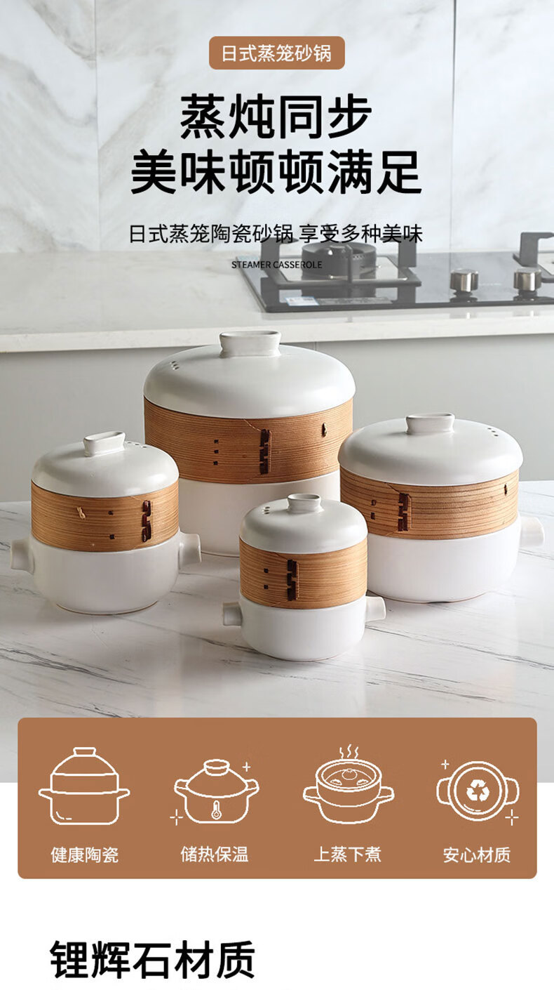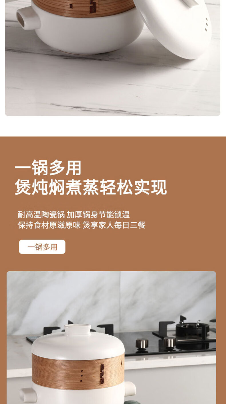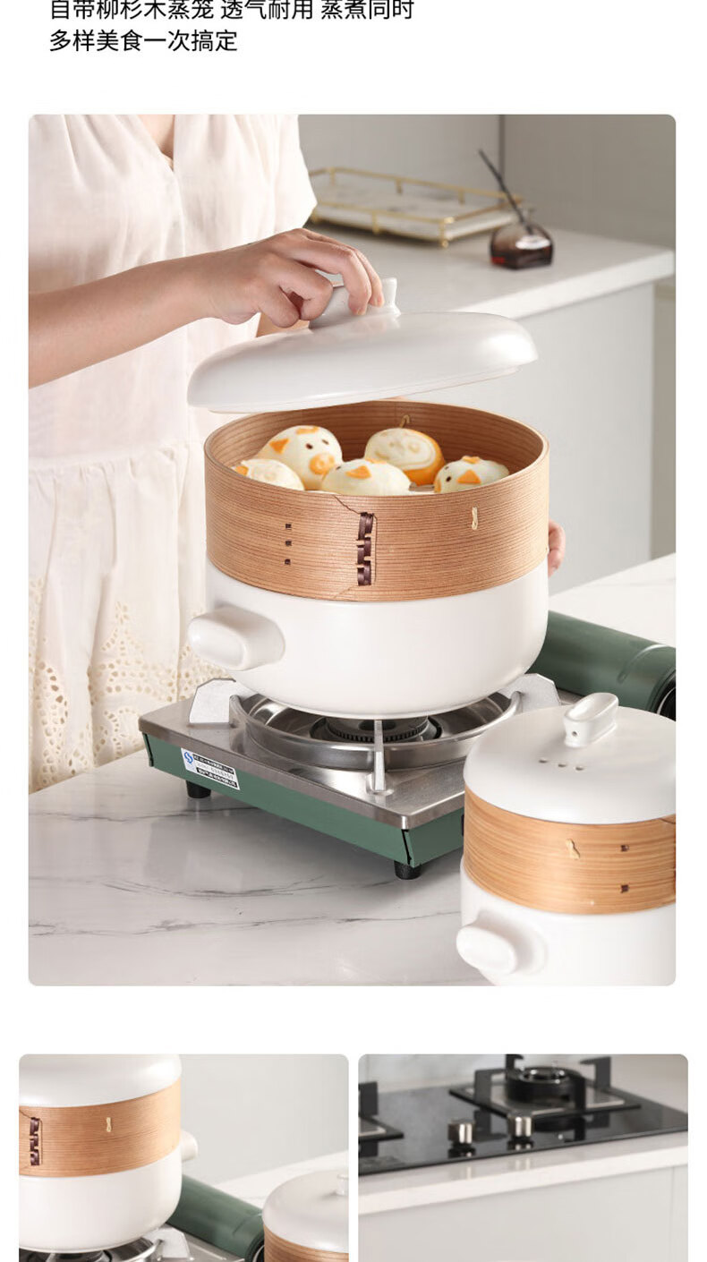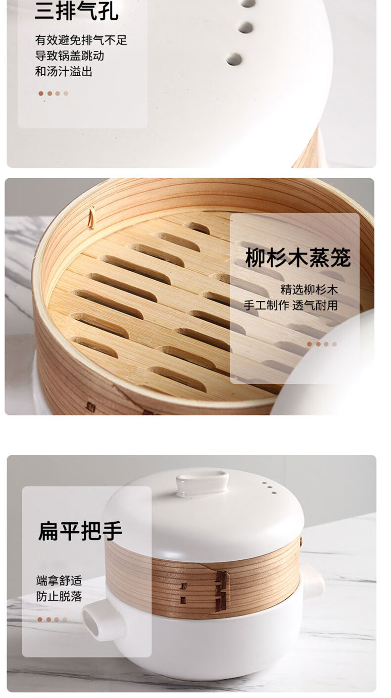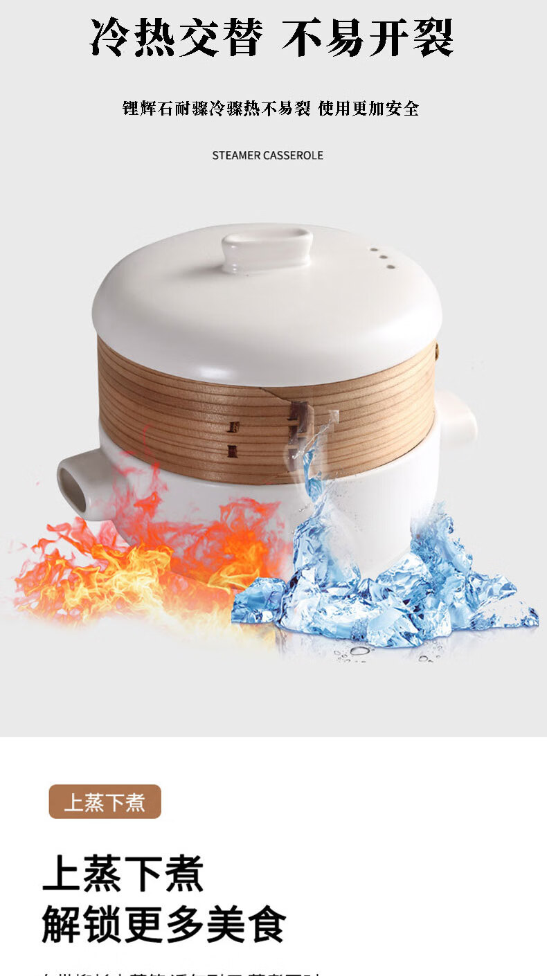 Fengshang Steamer Pot Ceramic Pot Steamer Integrated Multifunctional Pot Steamer Home Breakfast Steamed Egg Soup Double Layer 2L White + Steamer 2 Layers 20.5cm