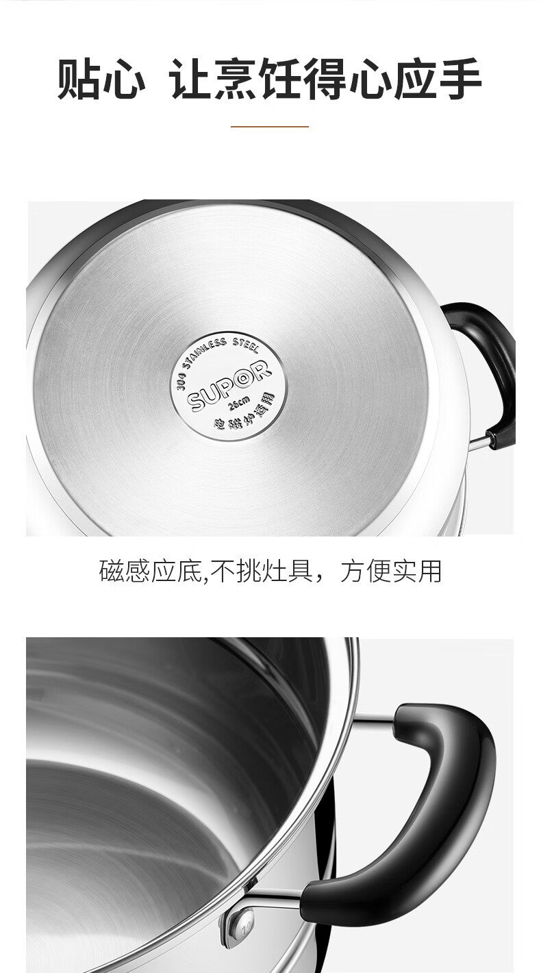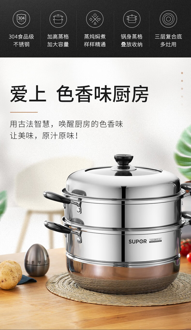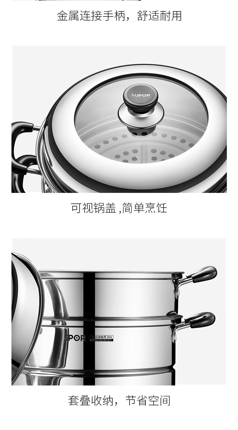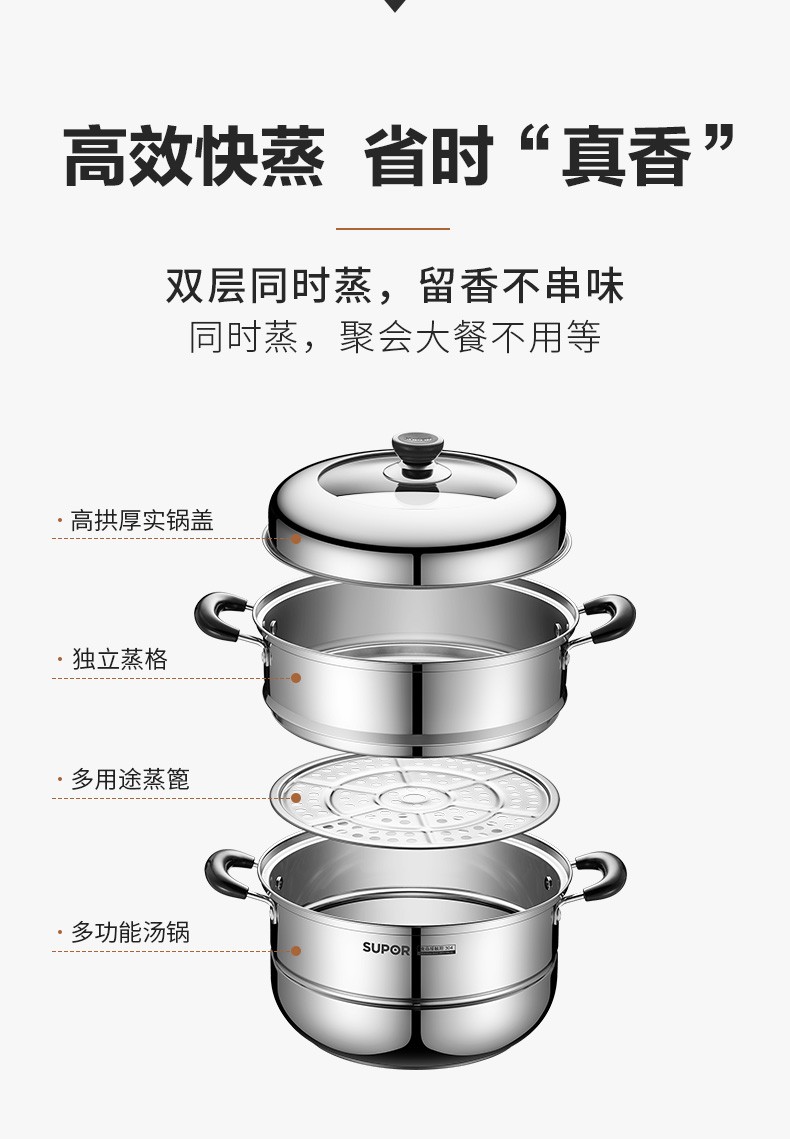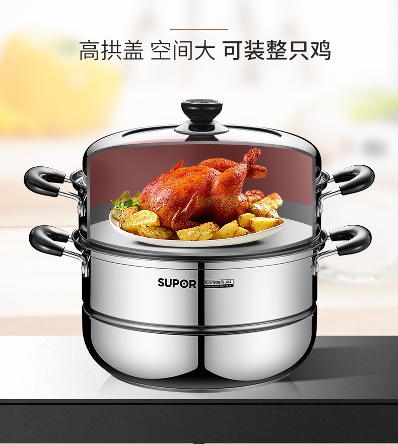 SUPOR steamer 304 stainless steel household high arch cover steamer two-layer double-layer thickened bottom gas induction cooker universal pot 30CM with dish clamp + steaming cloth