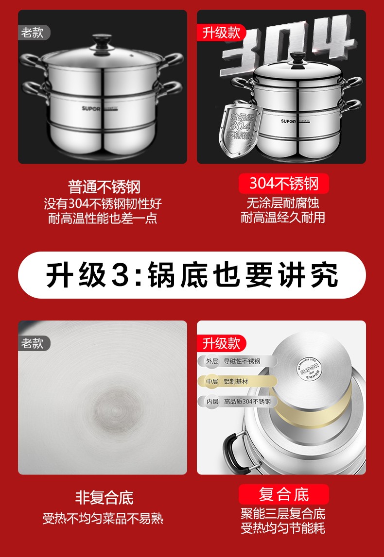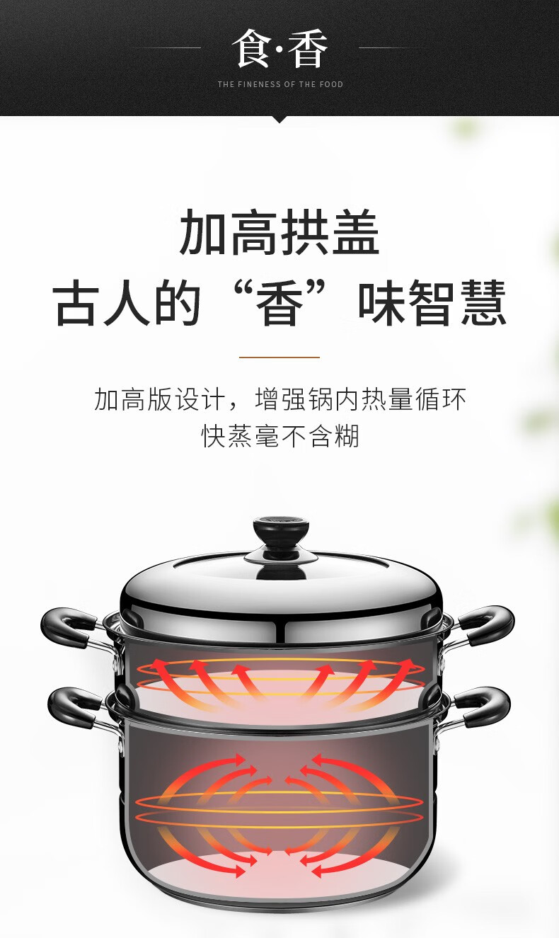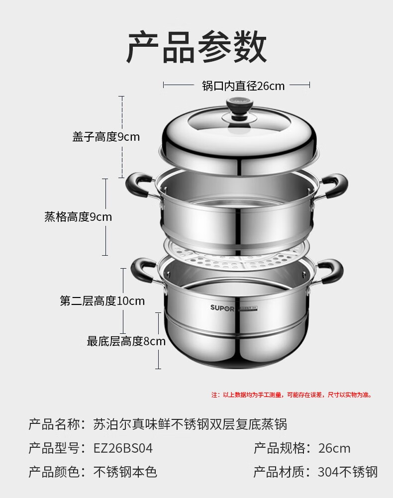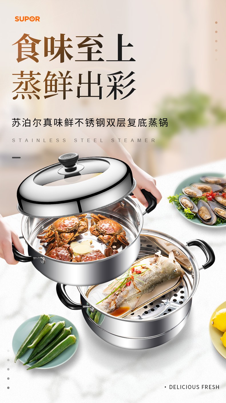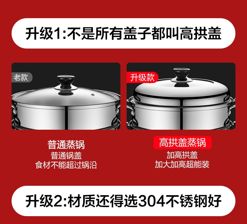 SUPOR steamer 304 stainless steel household high arch cover steamer two-layer double-layer thickened bottom gas induction cooker universal pot 30CM with dish clamp + steaming cloth