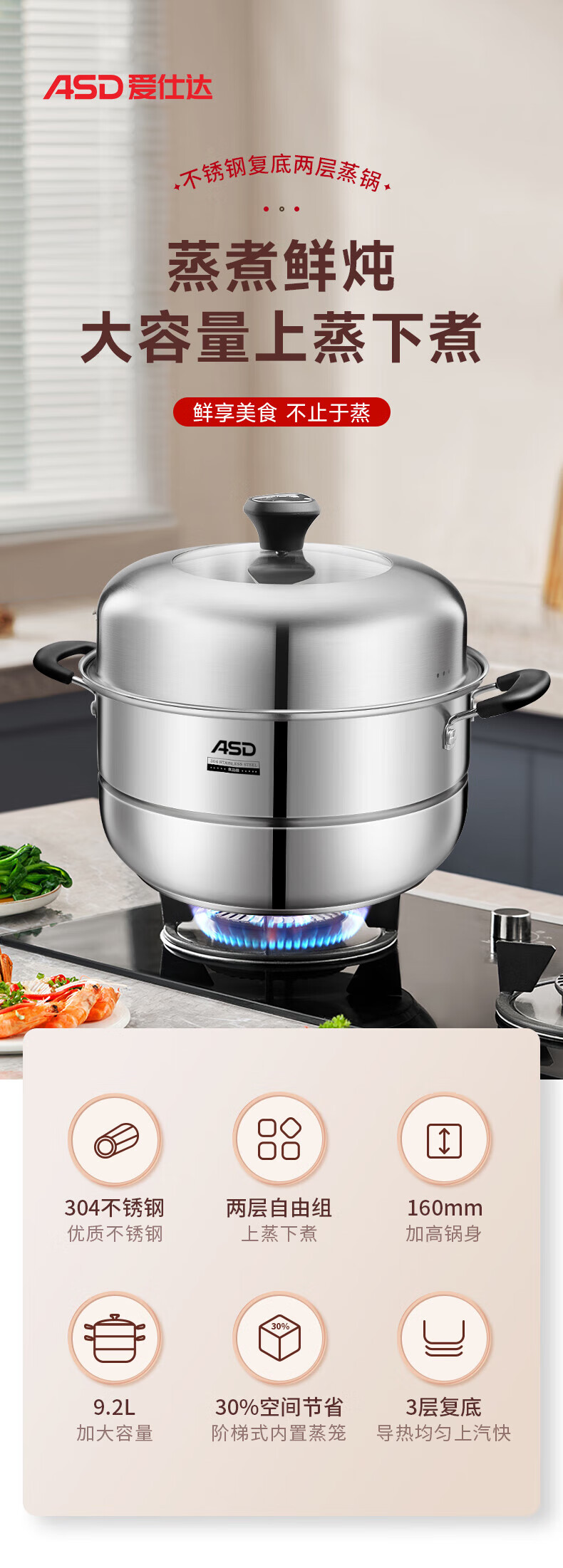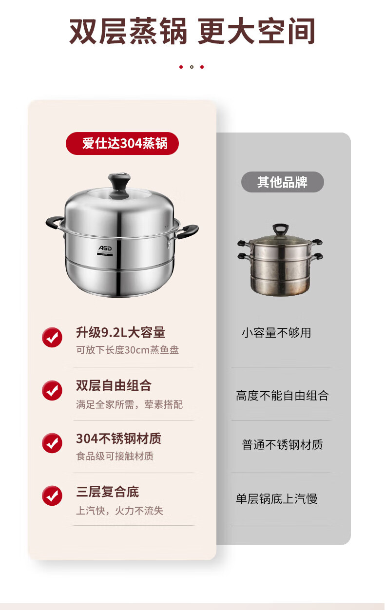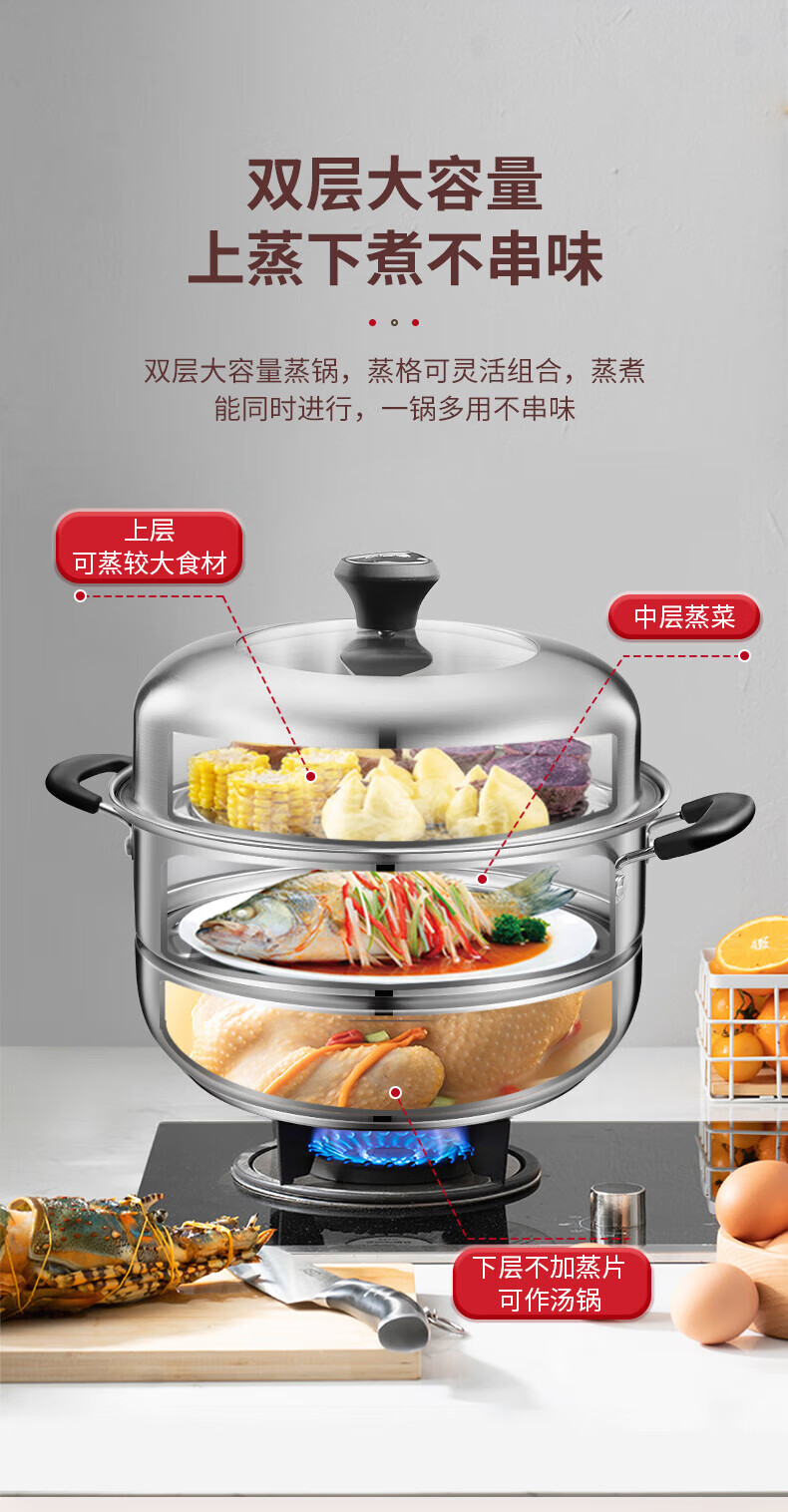 ASD steamer steamed buns double-layer 304 stainless steel soup pot multi-layer multi-purpose pot ZS26C5J/28/32 thickened 9.2L 28cm