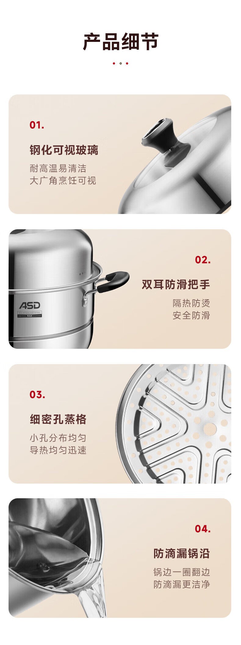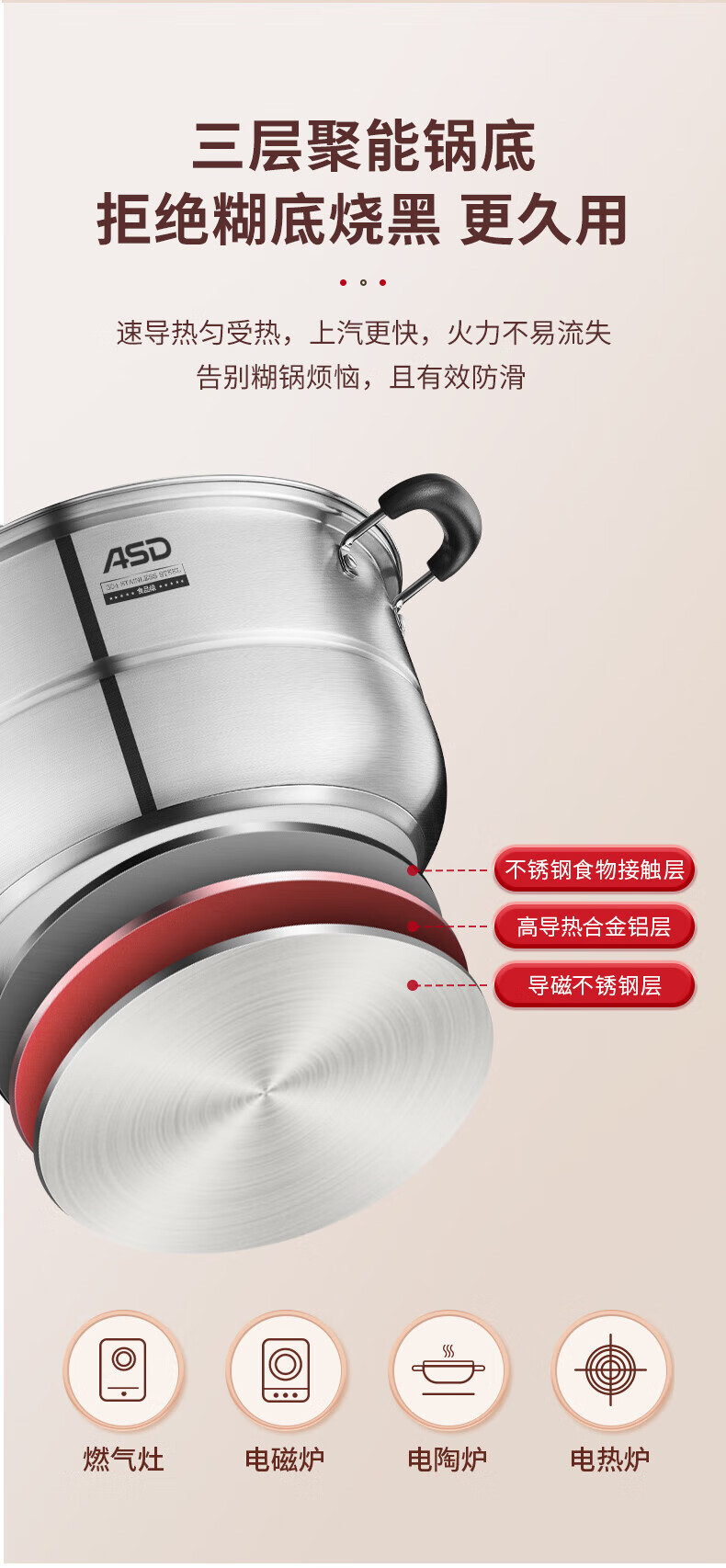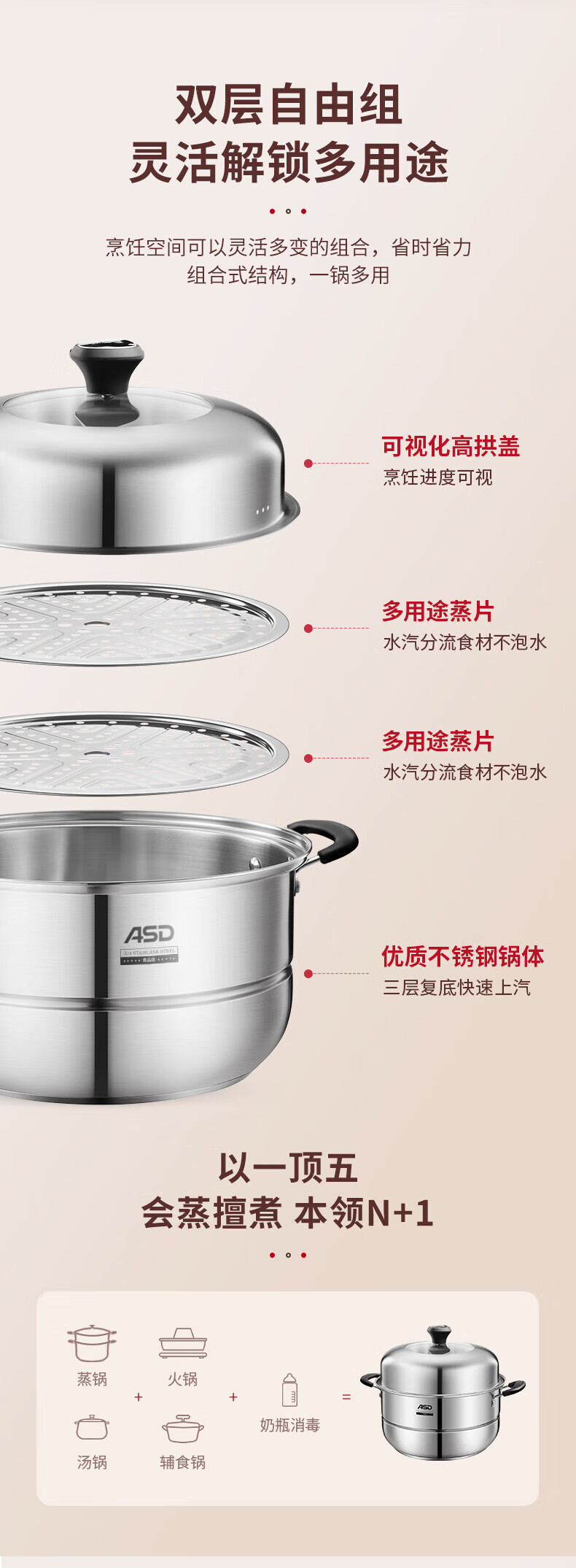 ASD steamer steamed buns double-layer 304 stainless steel soup pot multi-layer multi-purpose pot ZS26C5J/28/32 thickened 9.2L 28cm