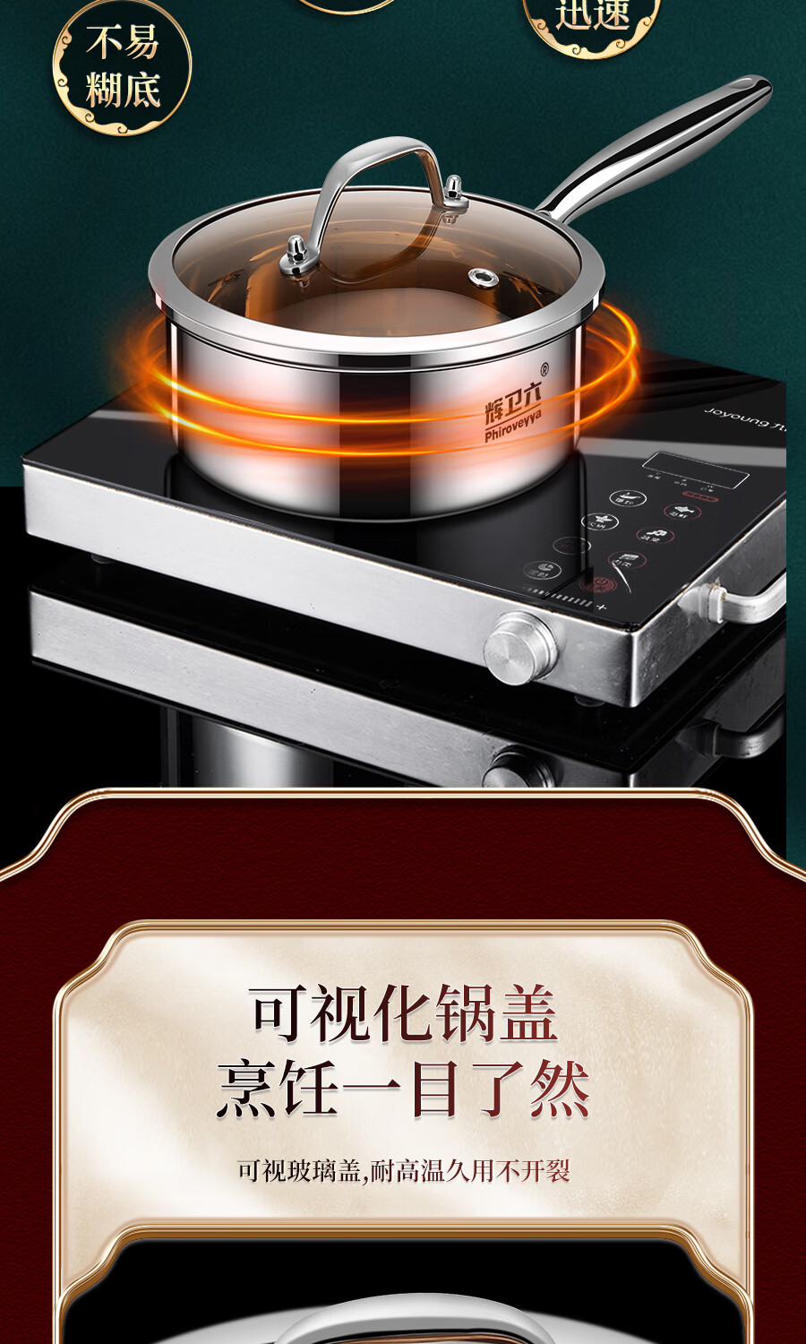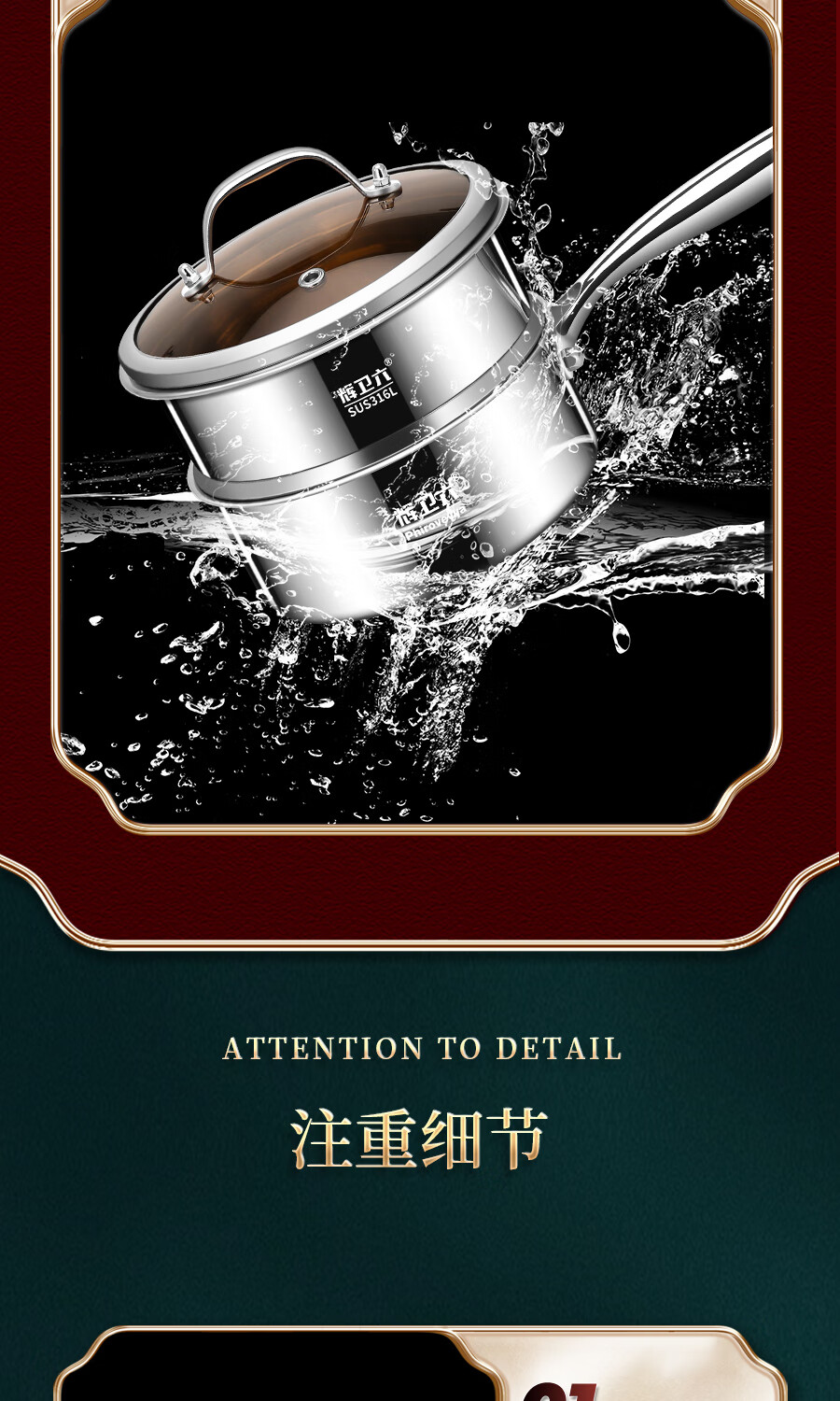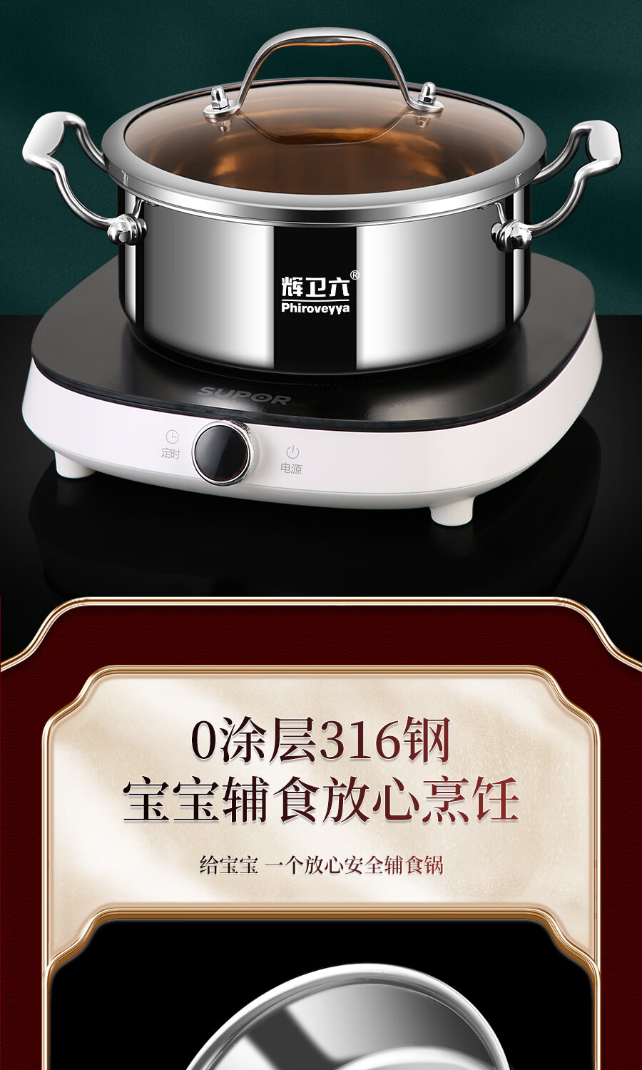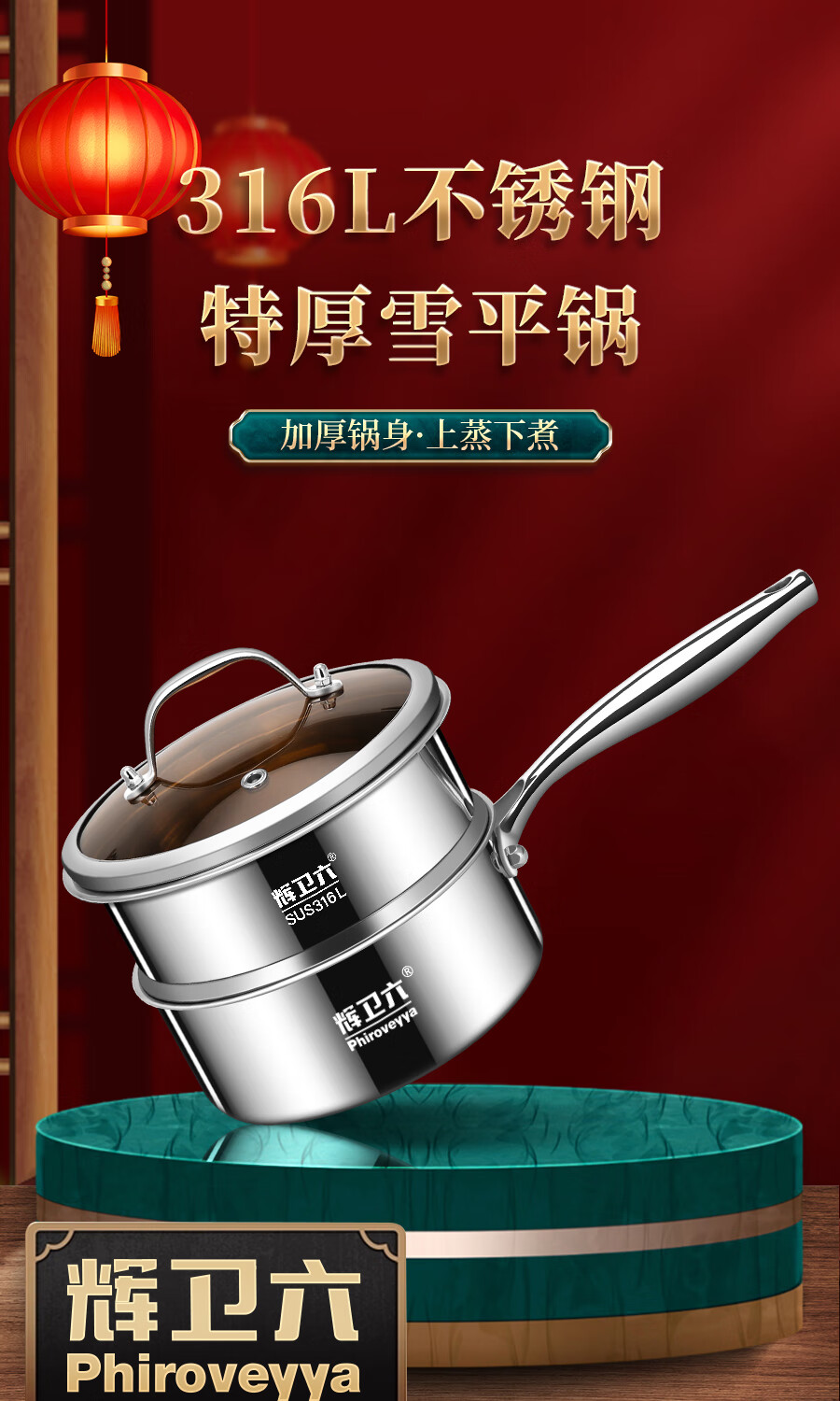 Huiweiliu 316L stainless steel milk pot, snow flat pot, cooking noodles, household uncoated food supplement pot with cage, small soup pot, single handle, single pot + steaming grid 18cm