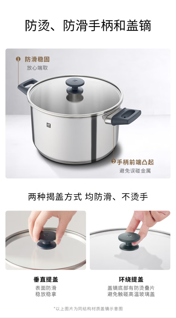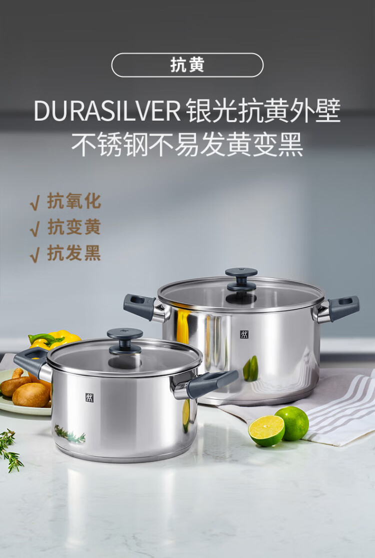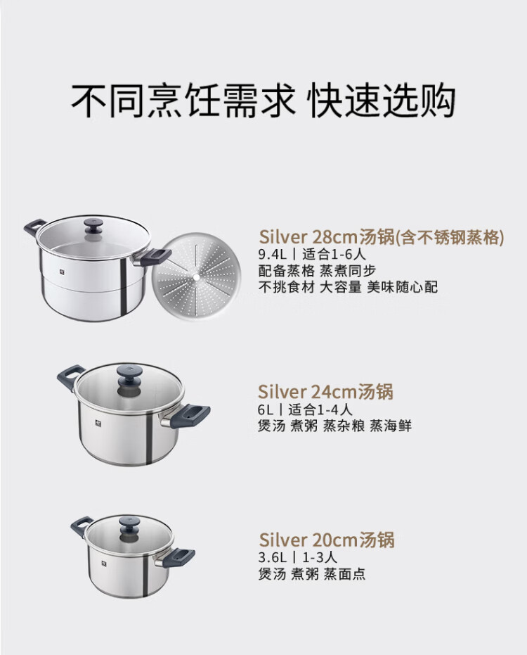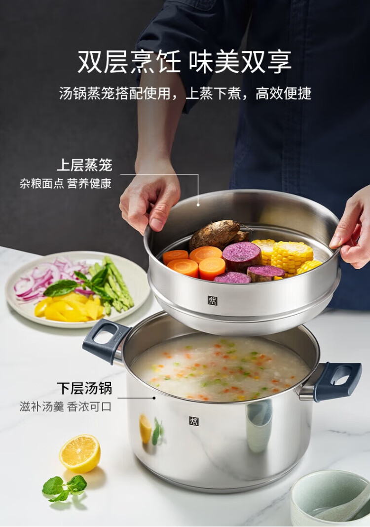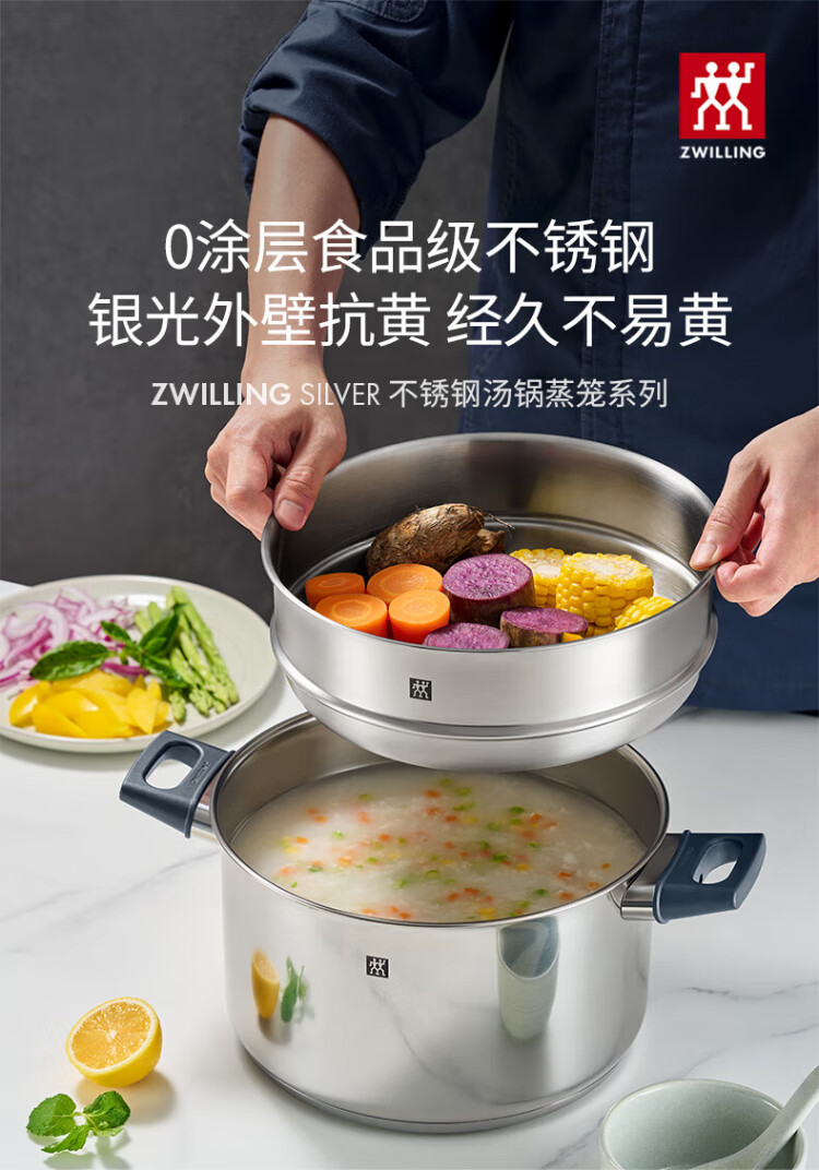 ZWILLING stainless steel soup pot steamer 0 coating household double-ear stew pot anti-yellowing noodles and porridge Silver series SILVER series soup pot + steamer 2 layers 20cm