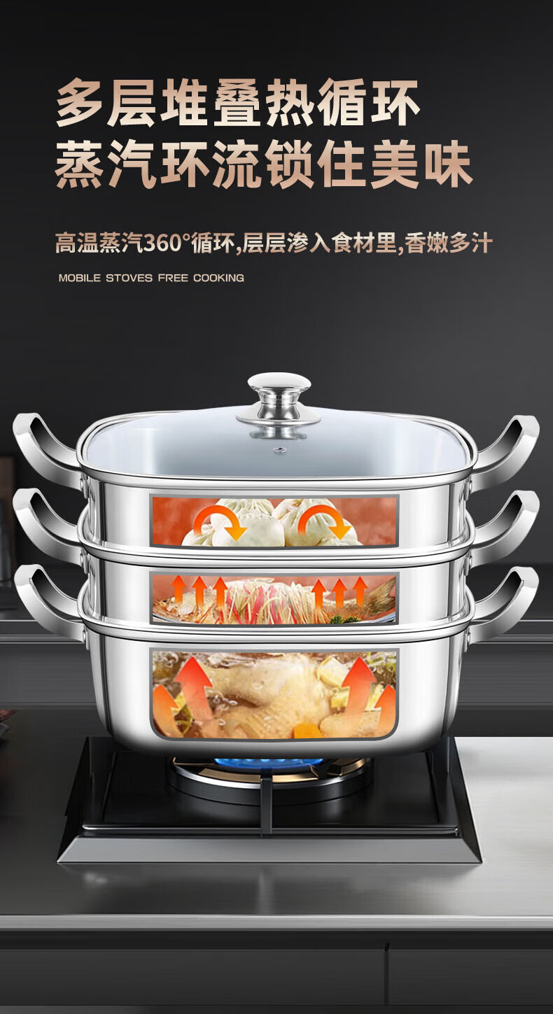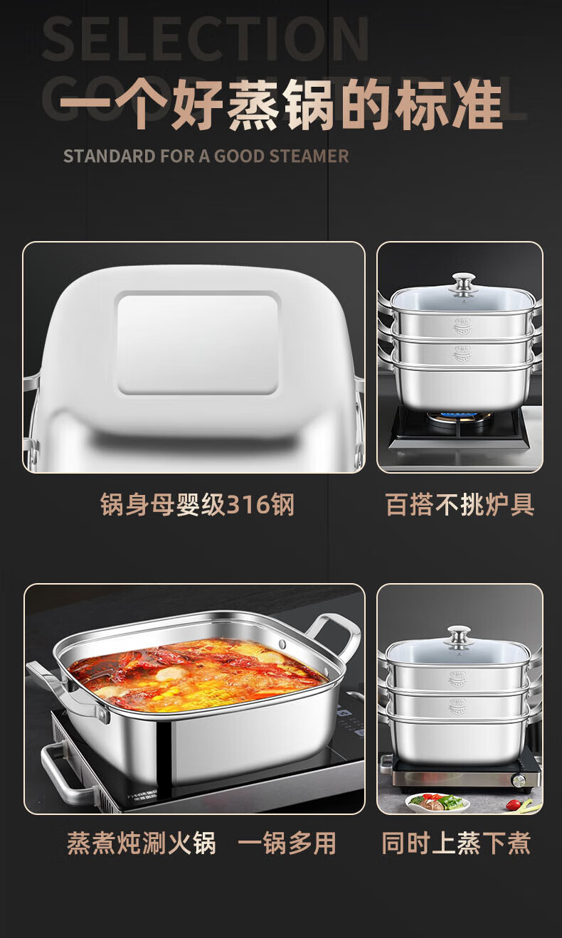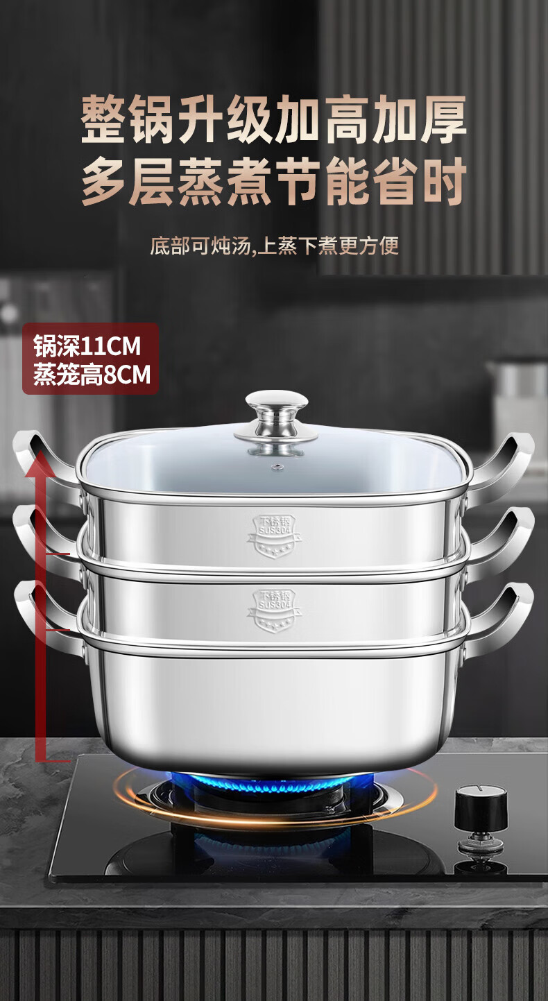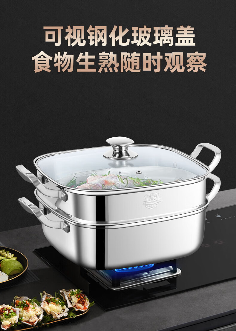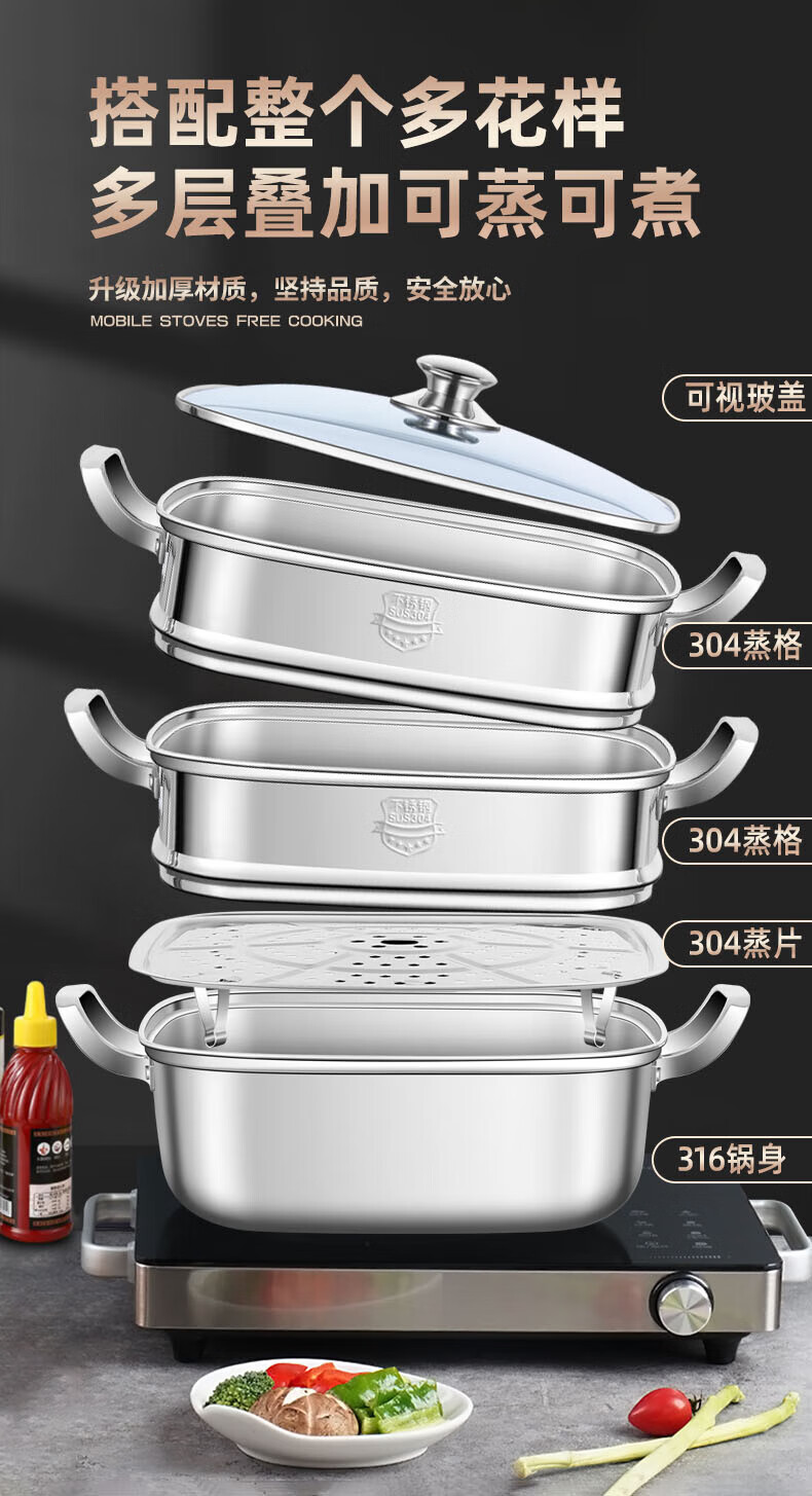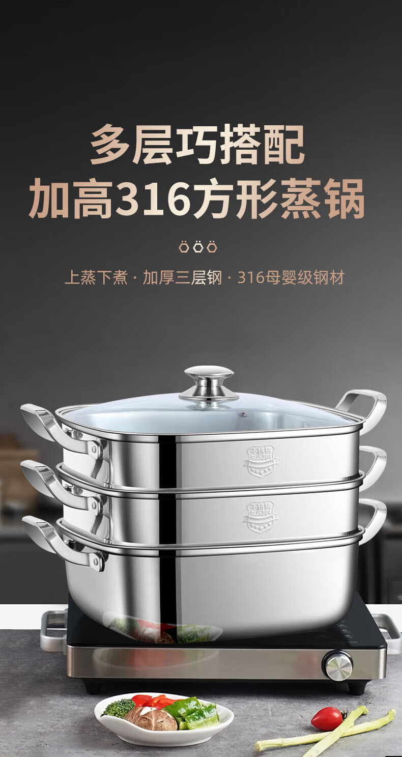 Ningbinde household 316 stainless steel square steamer thickened multi-layer steamer drawer multi-functional gas induction cooker universal 316 stainless steel 3 layers 30cm