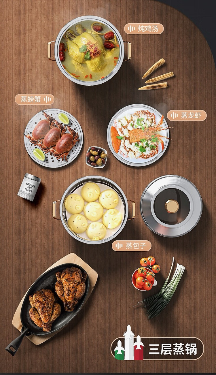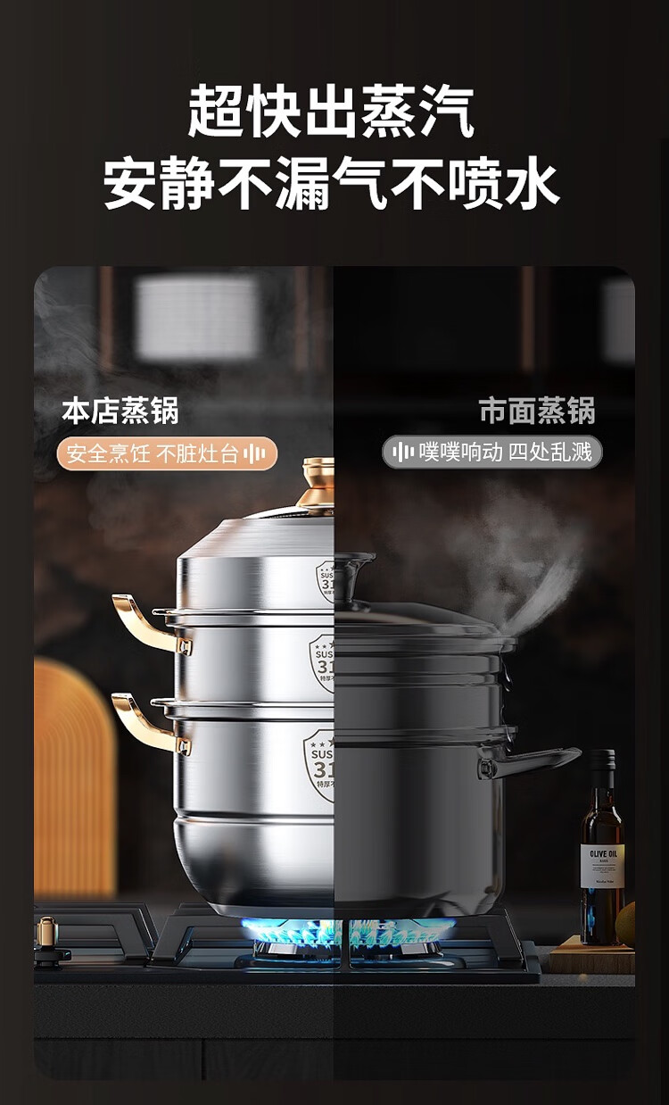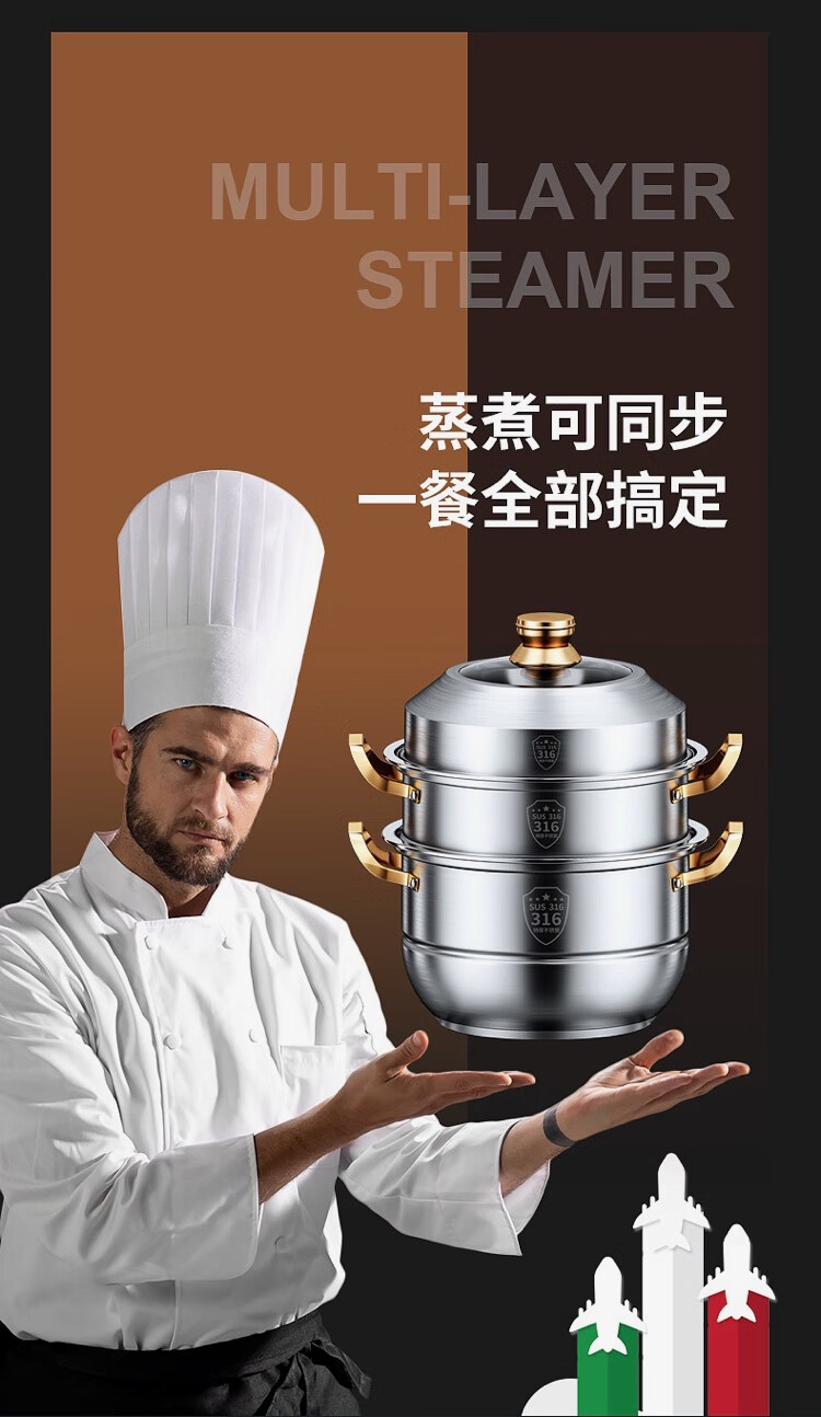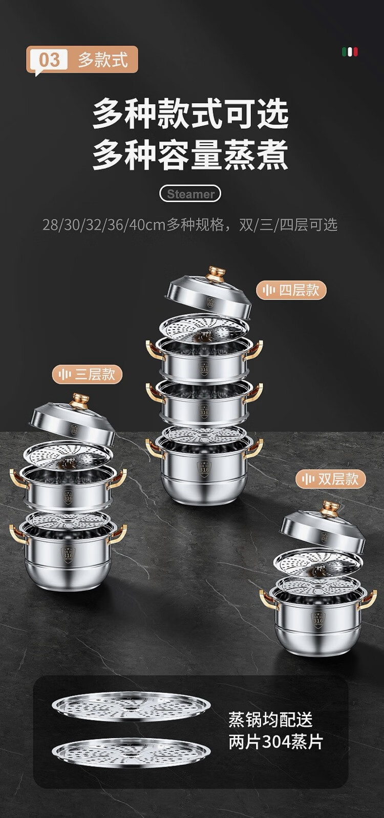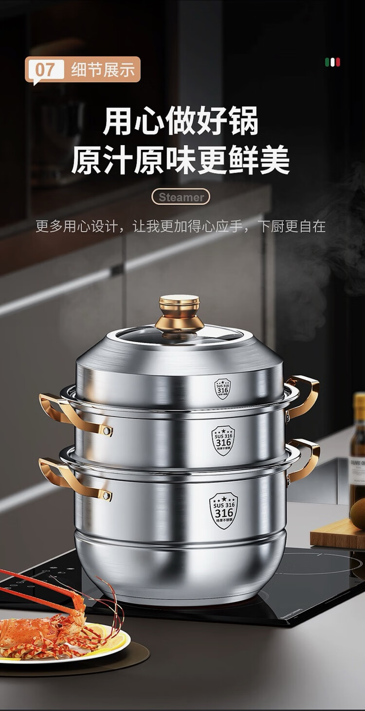 Steamer 316 stainless steel household food-grade thickened cage multi-layer large-capacity steaming integrated gas induction cooker 304 steaming sheet 316 extra thick bottom three-layer steaming 32cm