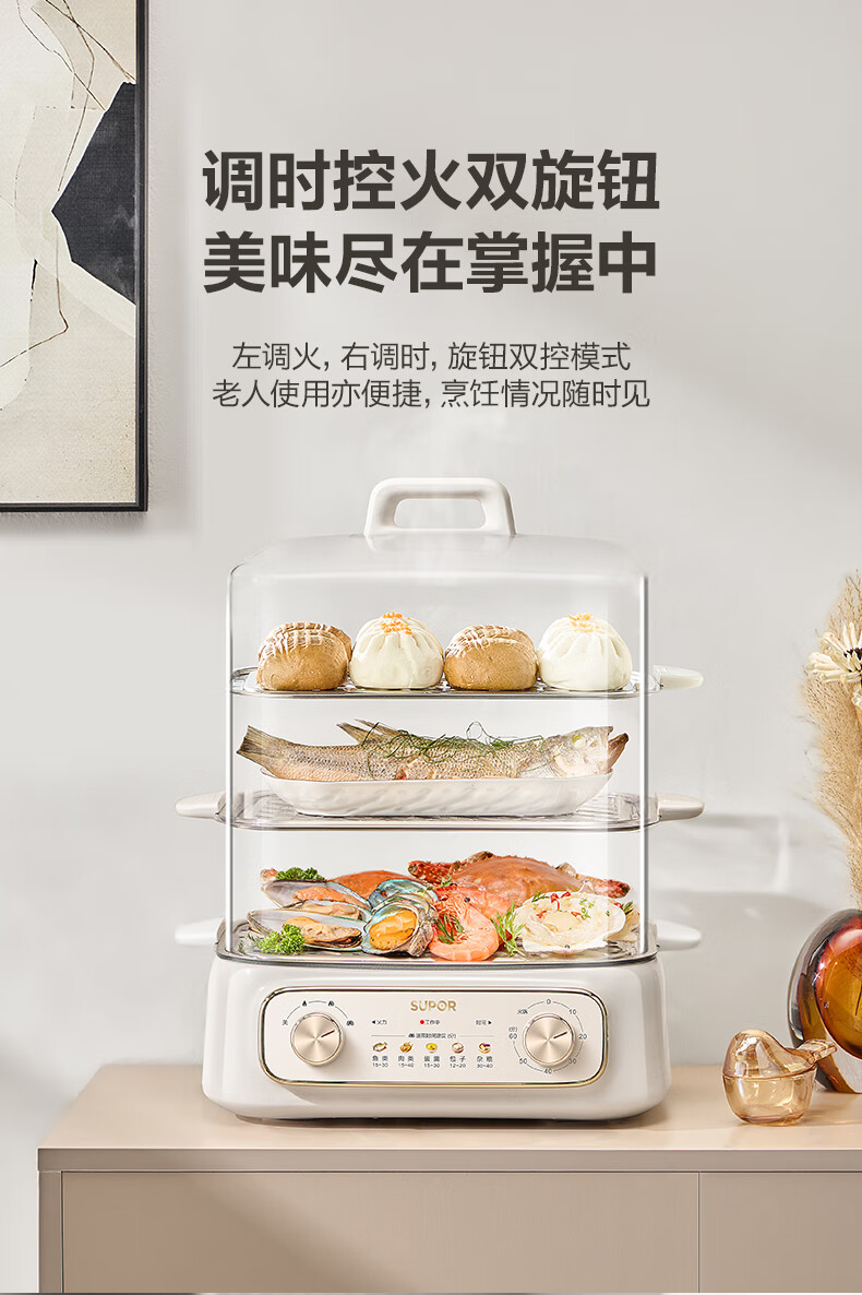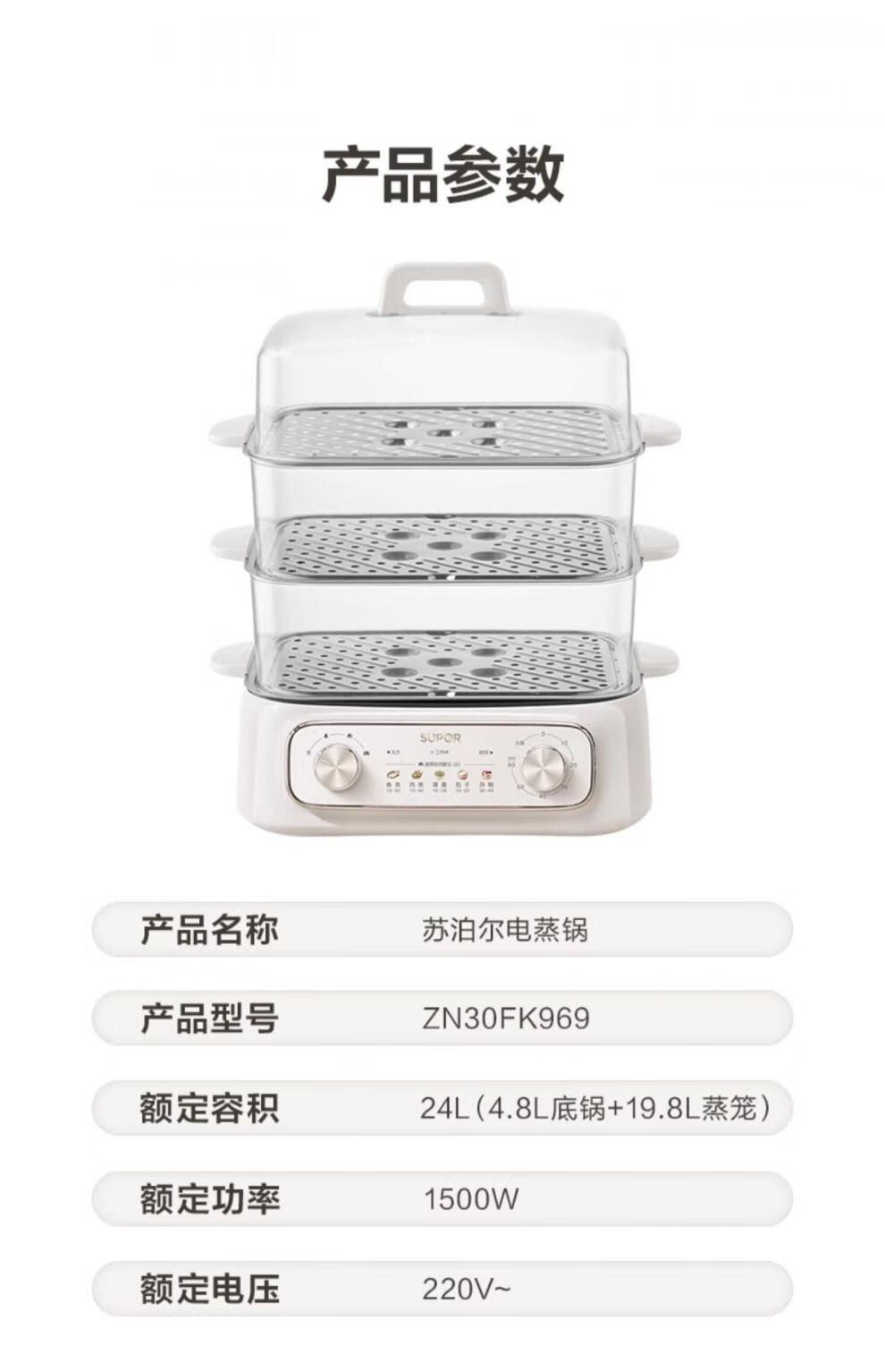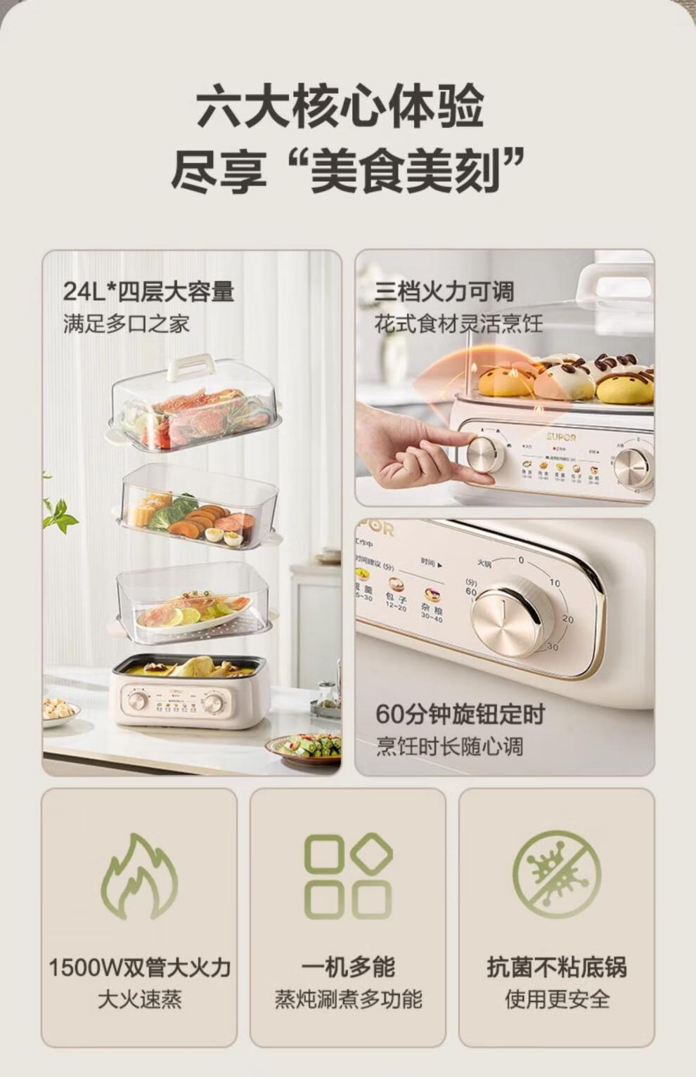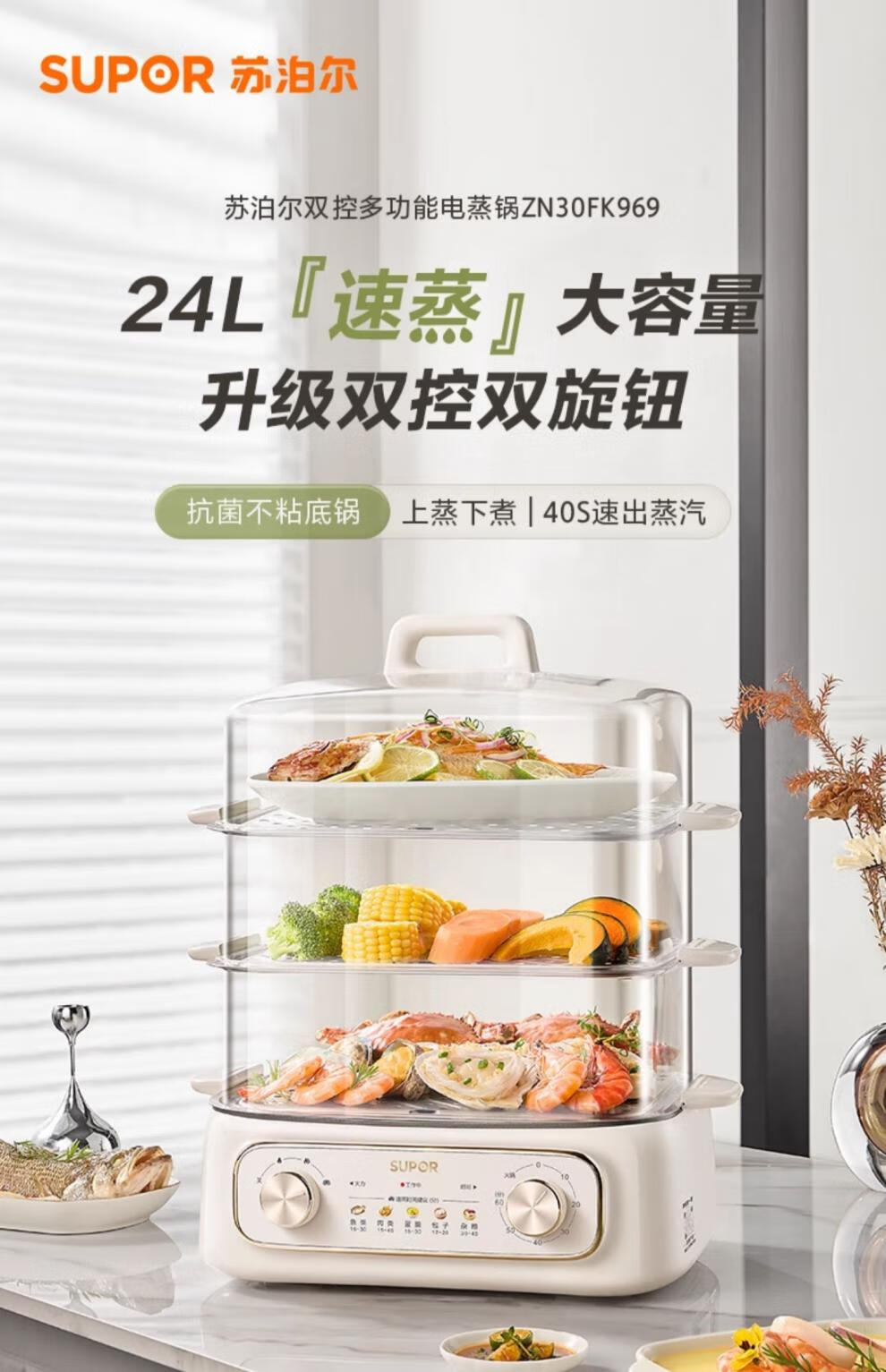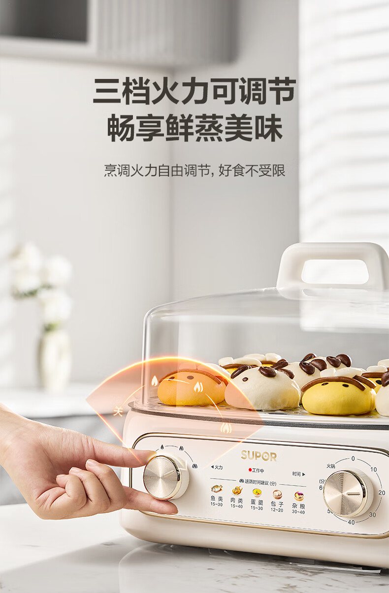 SUPOR electric steamer multi-functional household three-layer breakfast machine multi-layer electric hot pot cooking pot steaming oven all-in-one machine white upgraded model with steamer paper - 50 sheets 23cm 3 layers