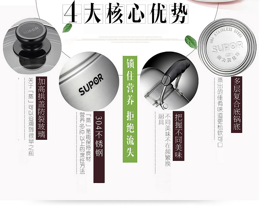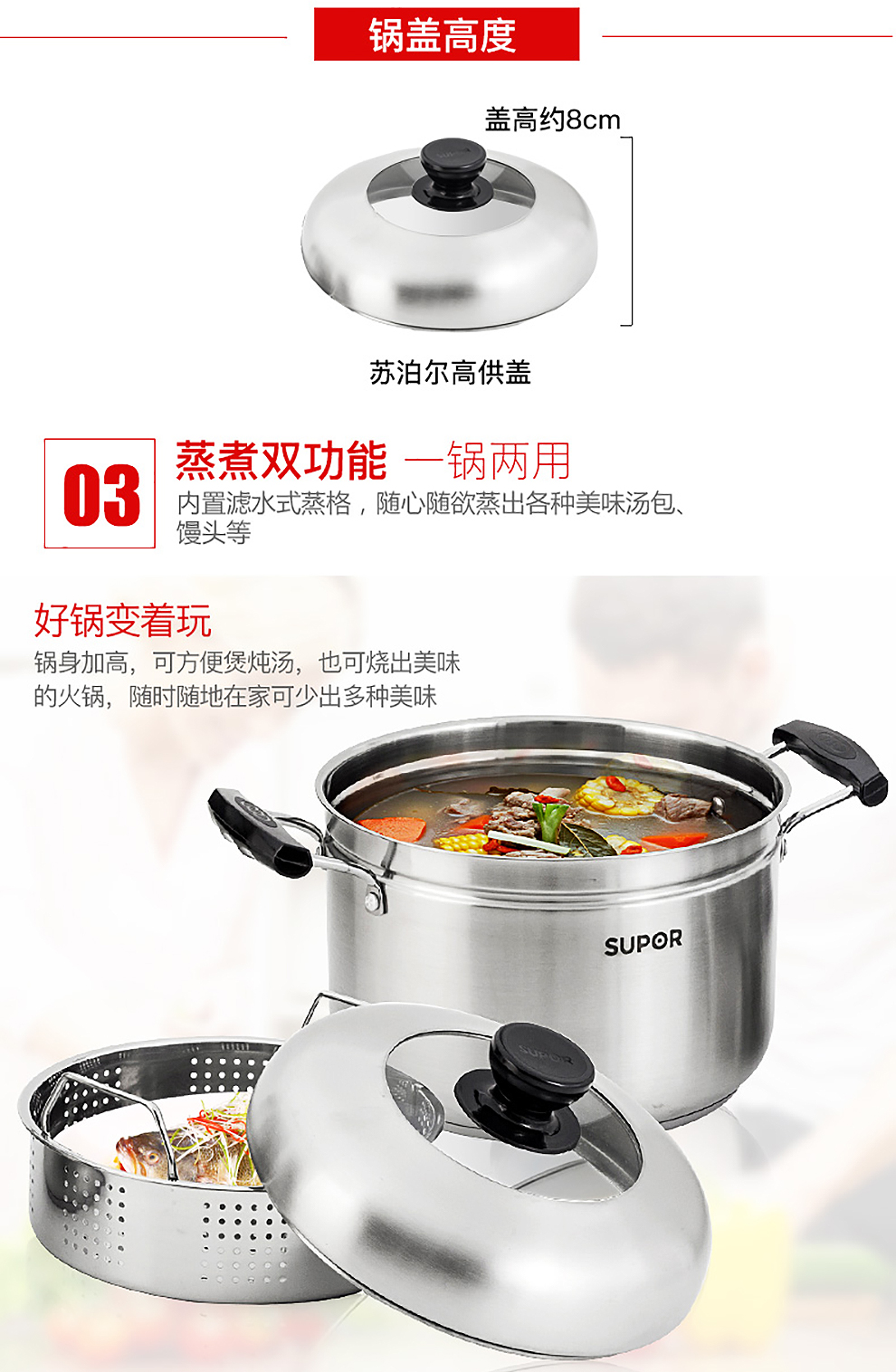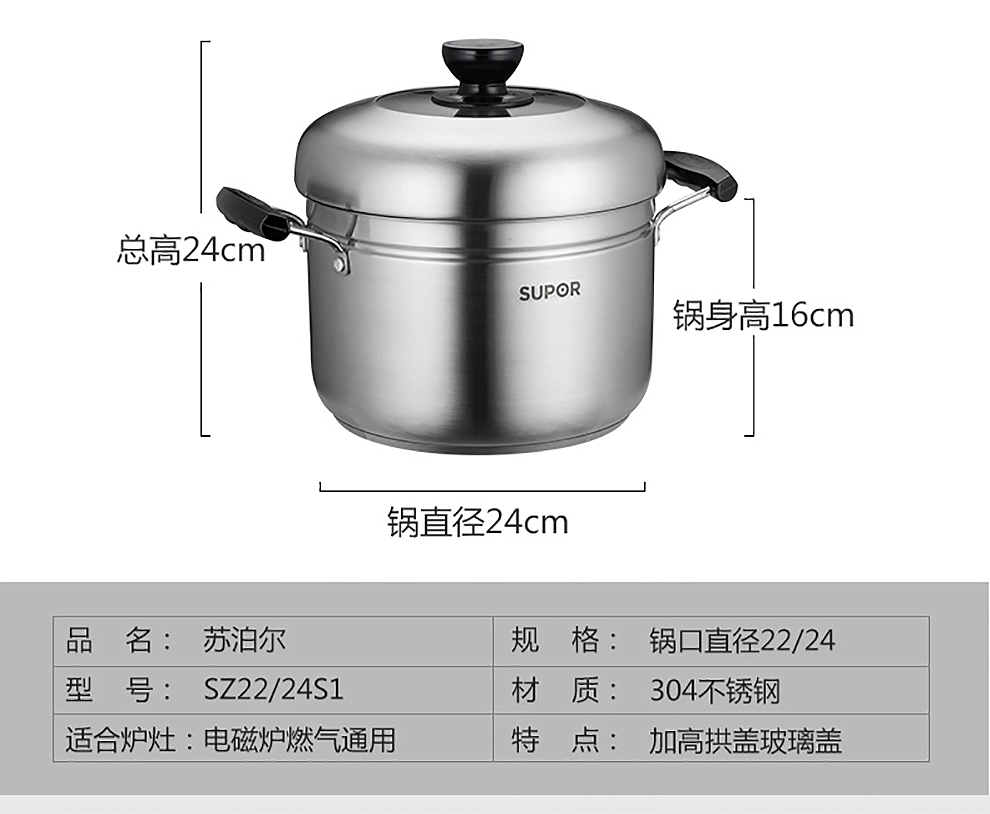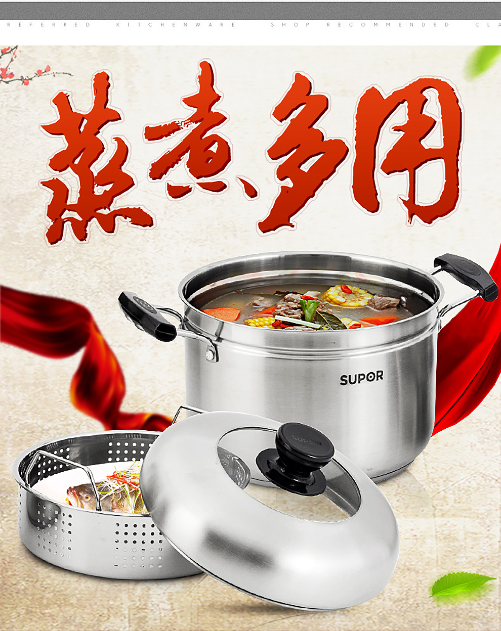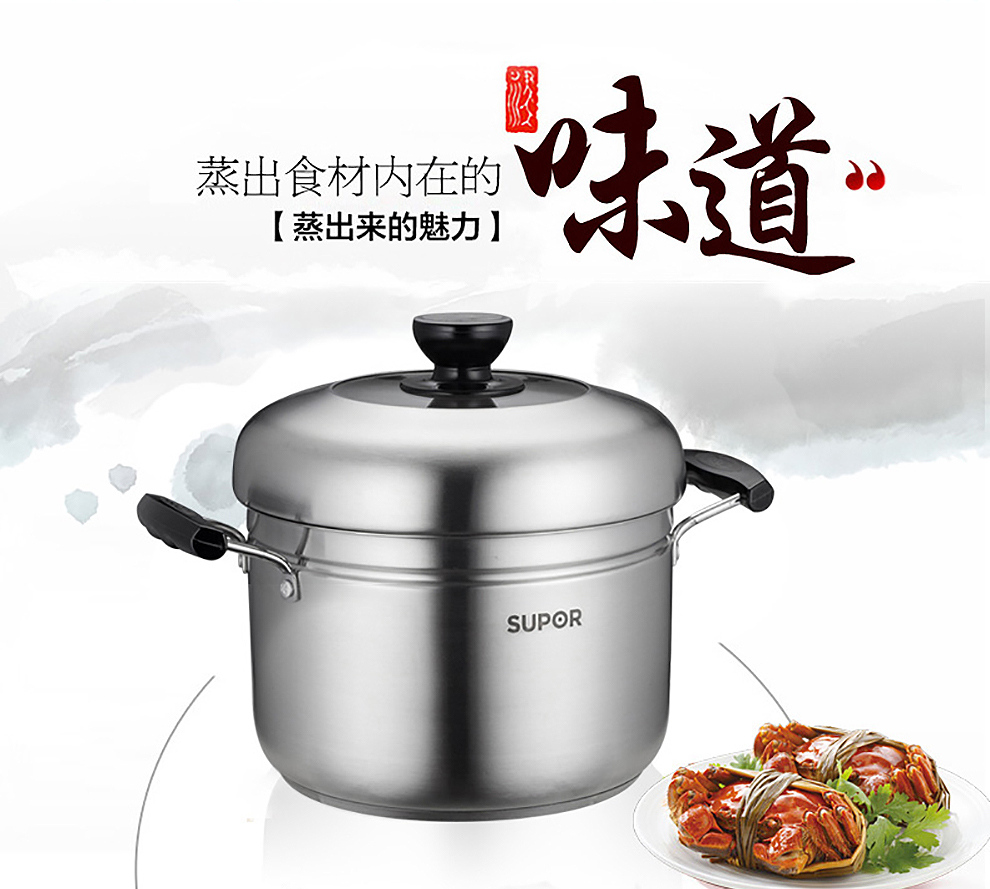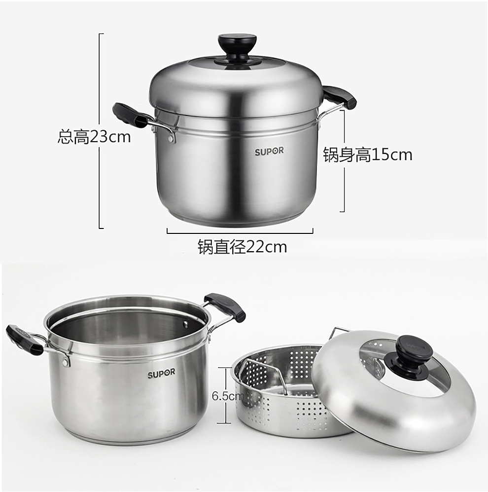 SUPOR steamer thickened 304 stainless steel two-layer steamer steaming multi-purpose pot multi-bottom induction cooker gas universal steamer + steaming cloth + dish clip 1 layer 24cm