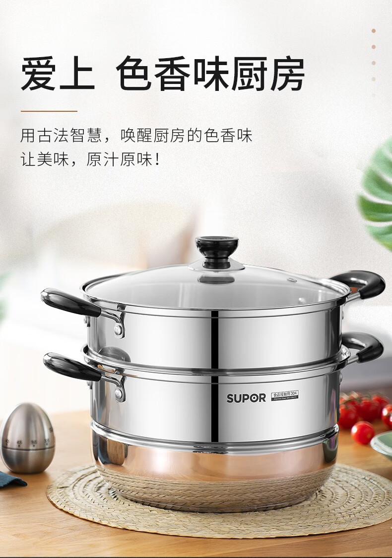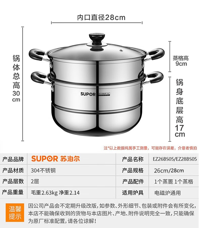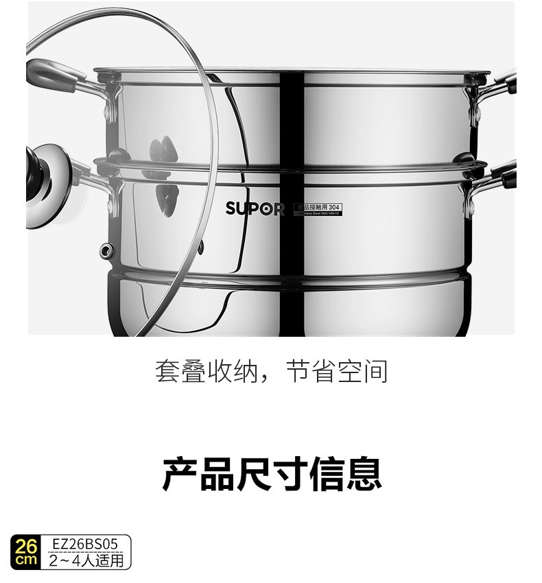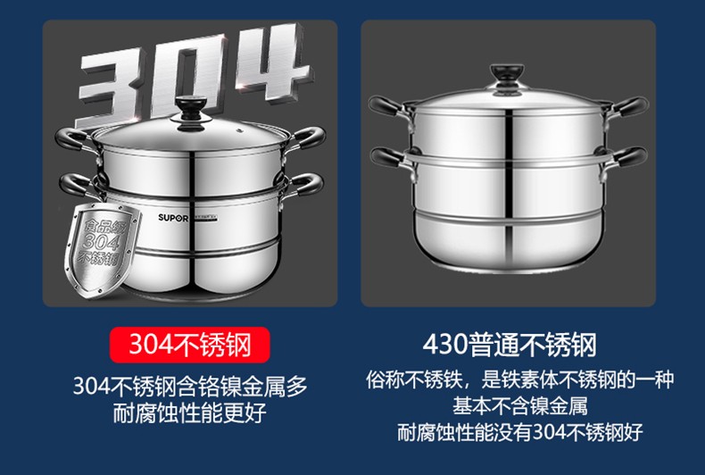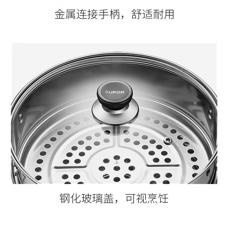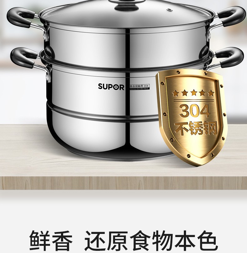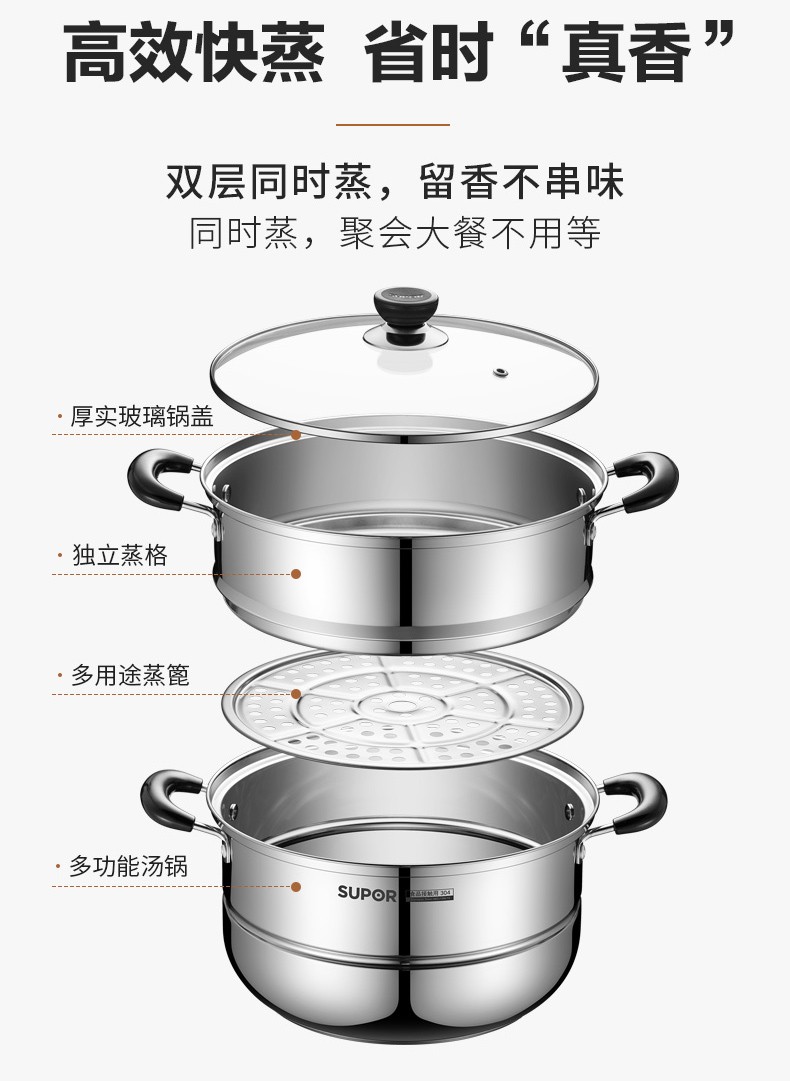SUPOR steamer 304 stainless steel double-layer thickened large-capacity household double-bottomed two-layer steamer induction cooker gas universal pot steamer free steaming cloth 2 layers 28cm