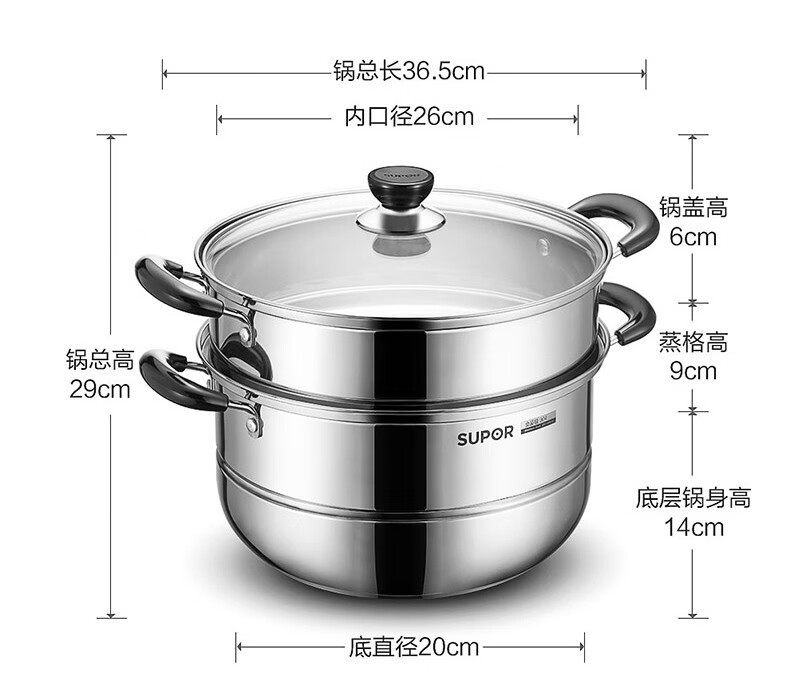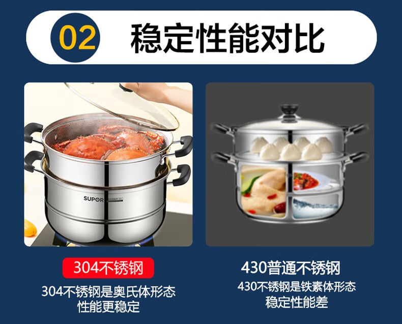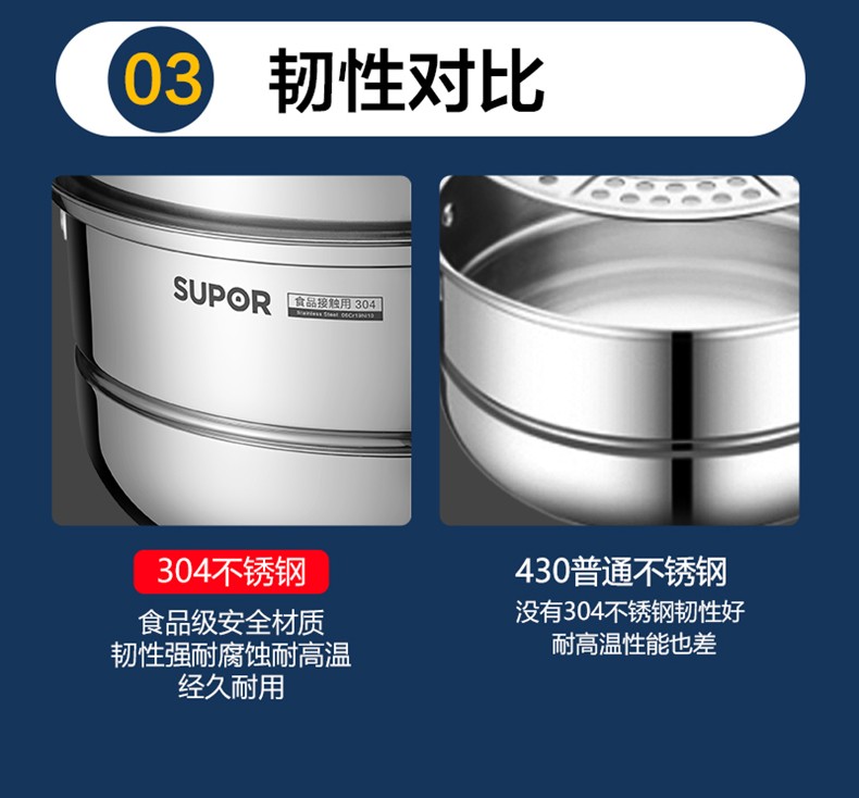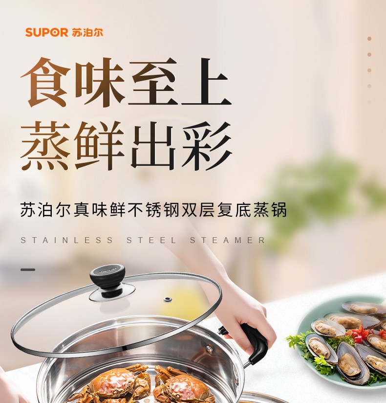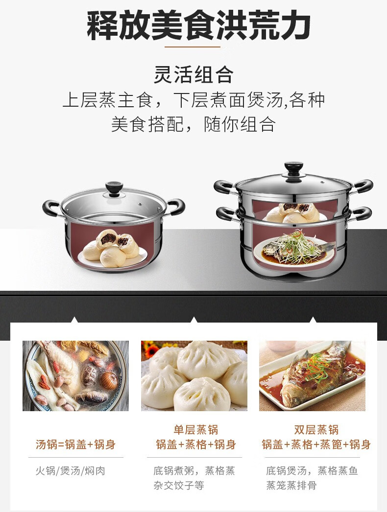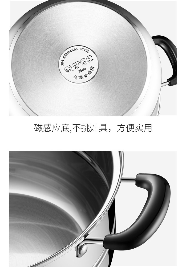 SUPOR steamer 304 stainless steel double-layer thickened large-capacity household double-bottomed two-layer steamer induction cooker gas universal pot steamer free steaming cloth 2 layers 28cm