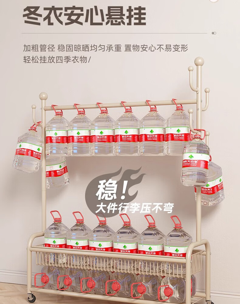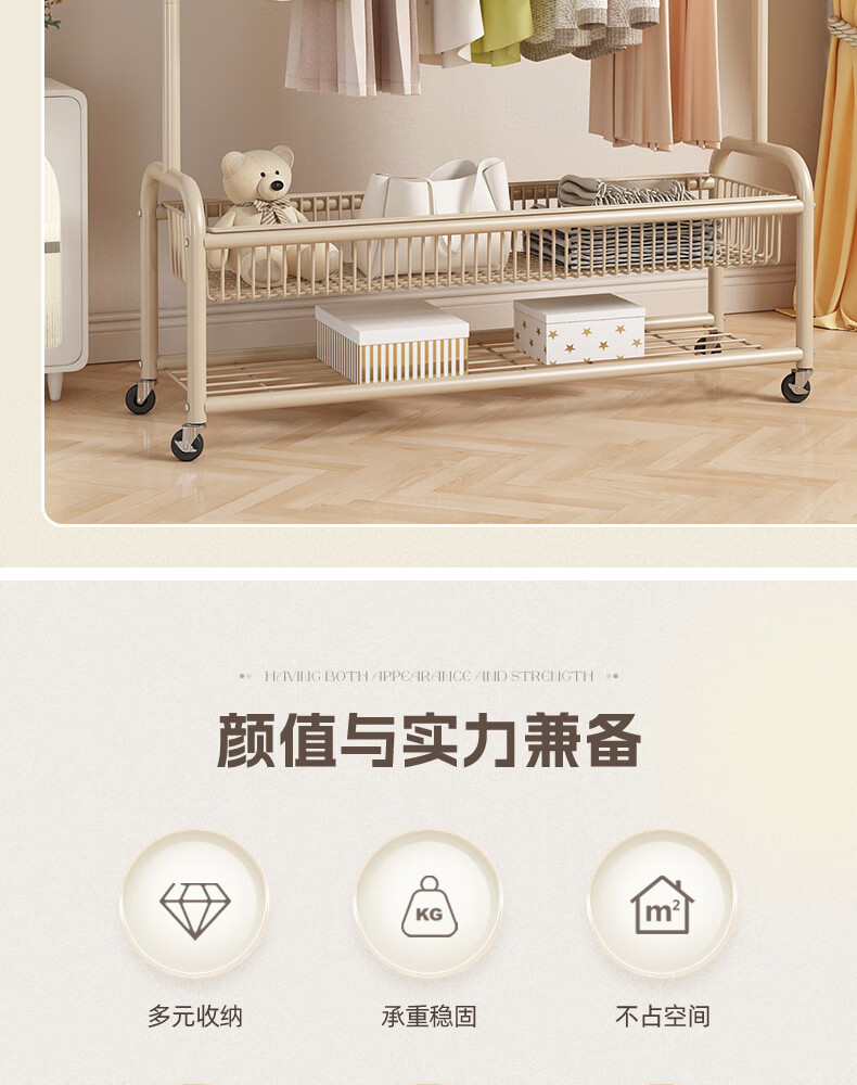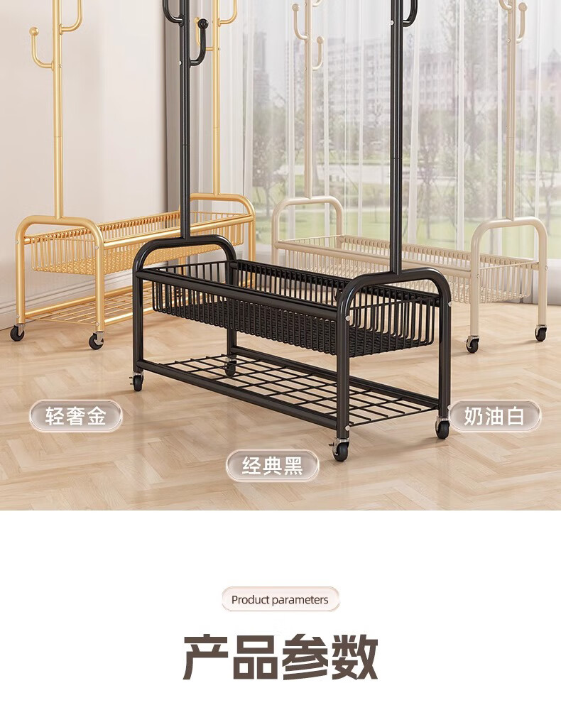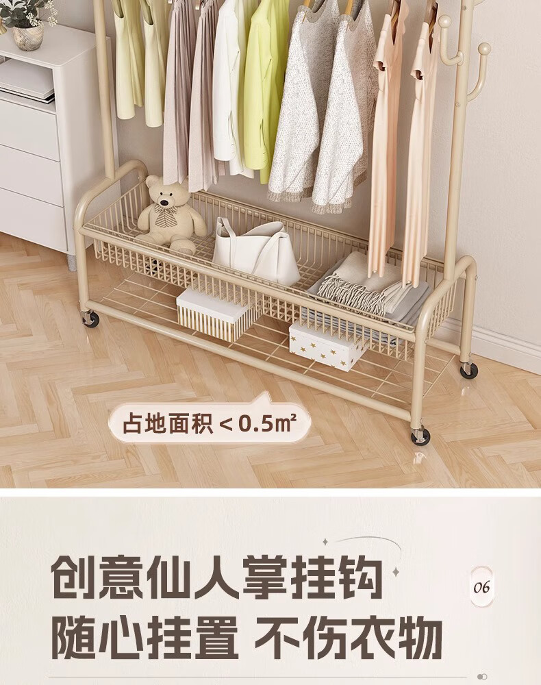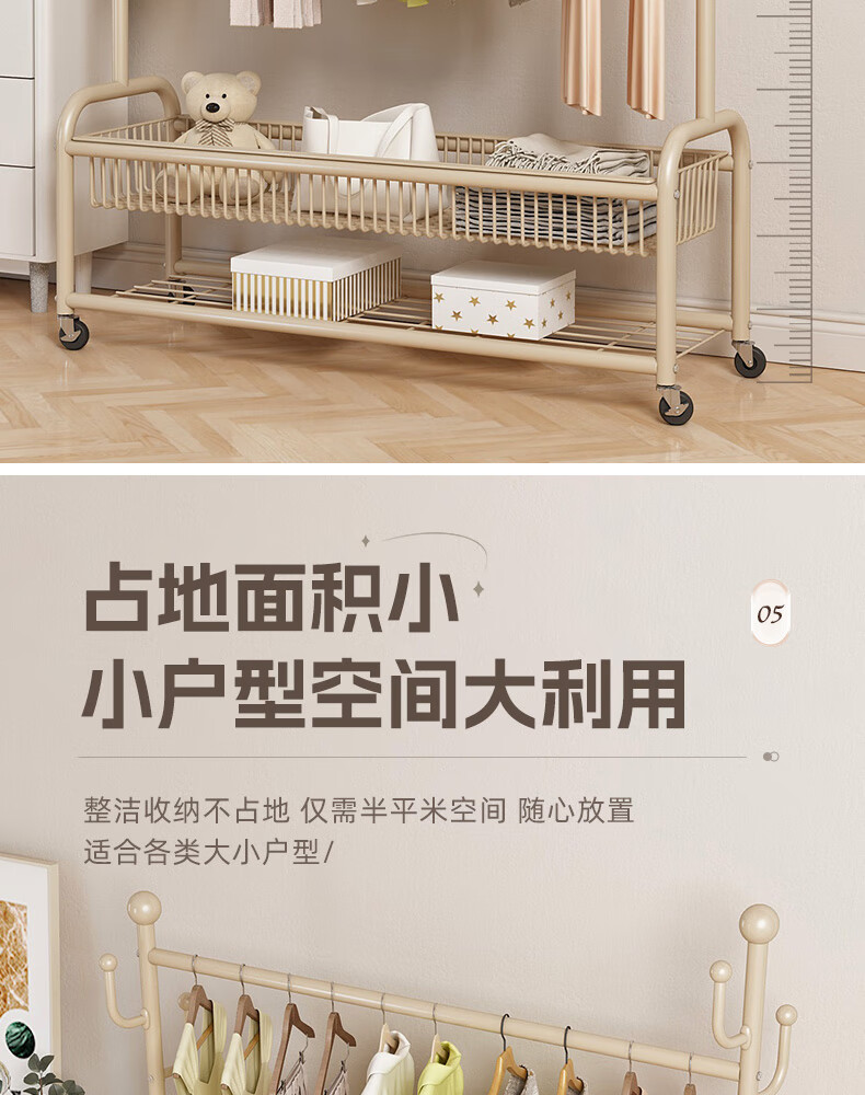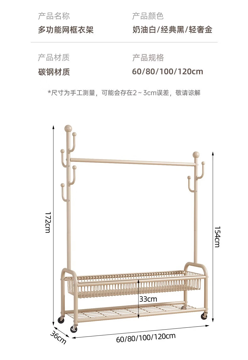 Wooden multifunctional clothes hanger floor-standing bedroom coat rack living room balcony single pole clothes drying mobile storage storage hanger 120cm light luxury gold double-layer mesh basket + 6 hooks + wheels
