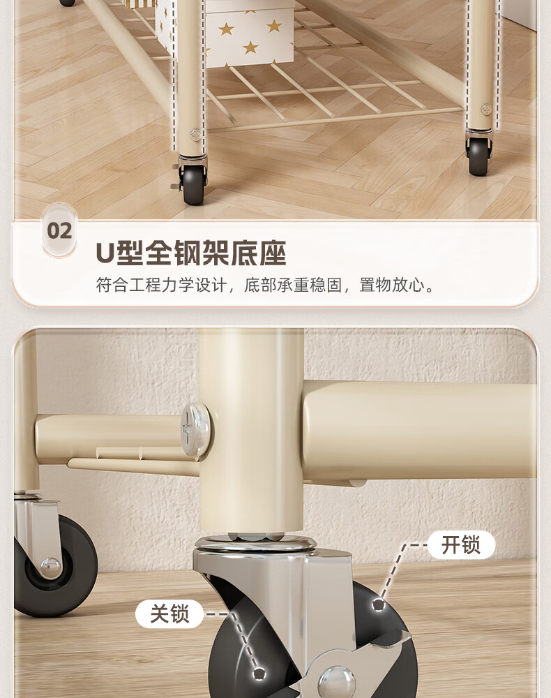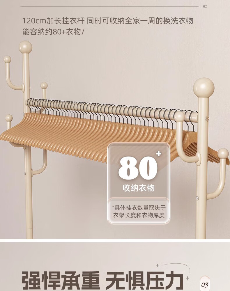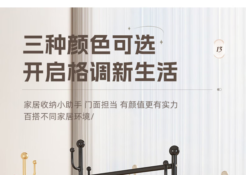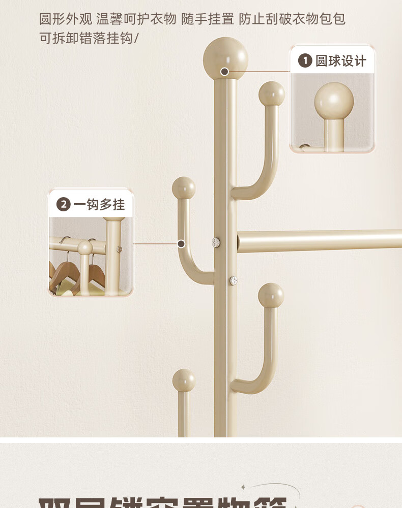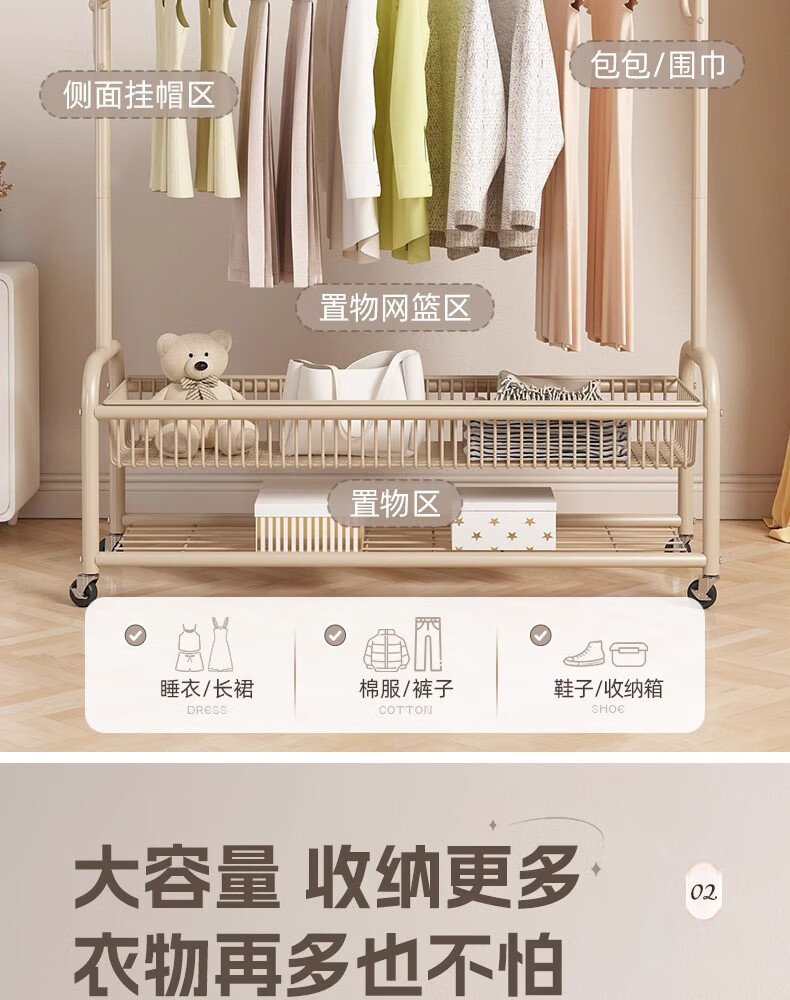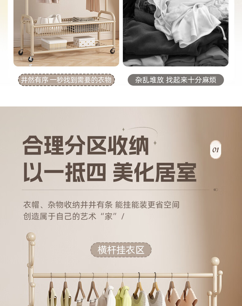 Wooden multifunctional clothes hanger floor-standing bedroom coat rack living room balcony single pole clothes drying mobile storage storage hanger 120cm light luxury gold double-layer mesh basket + 6 hooks + wheels
