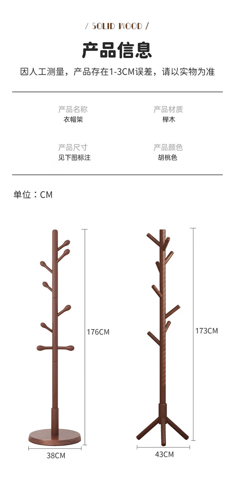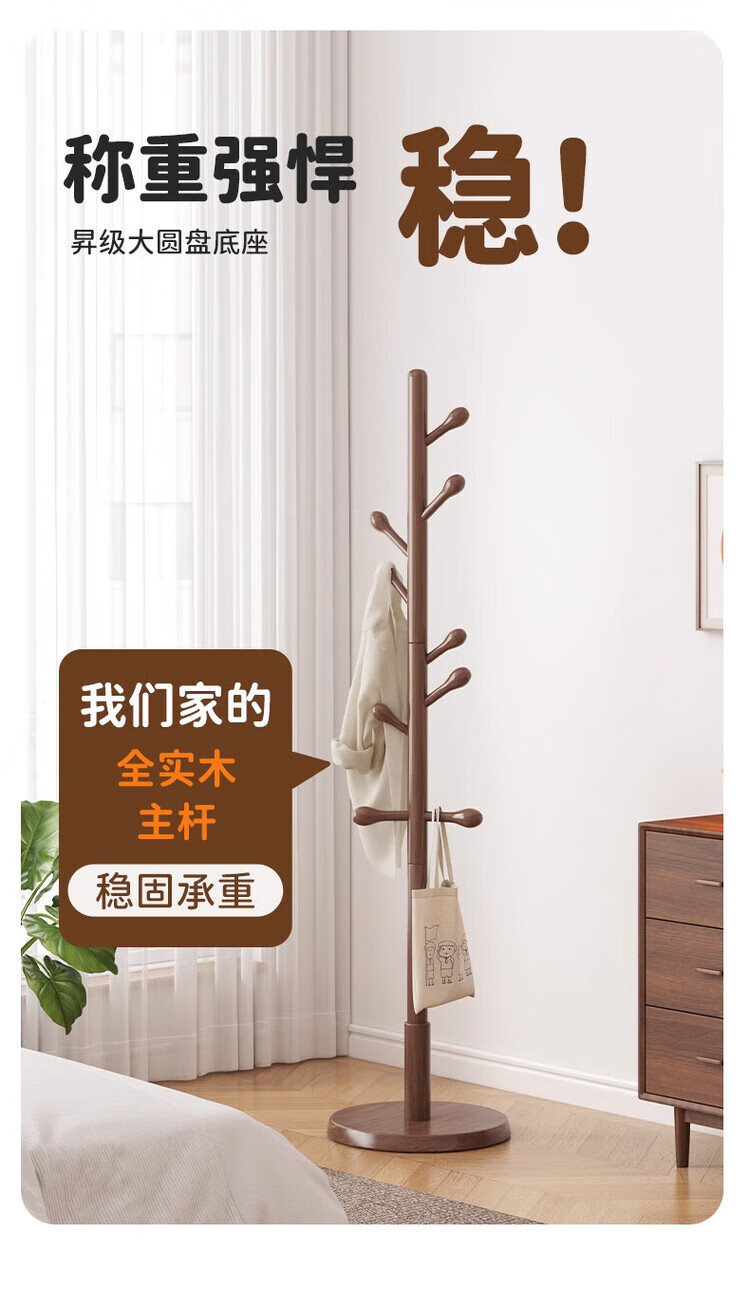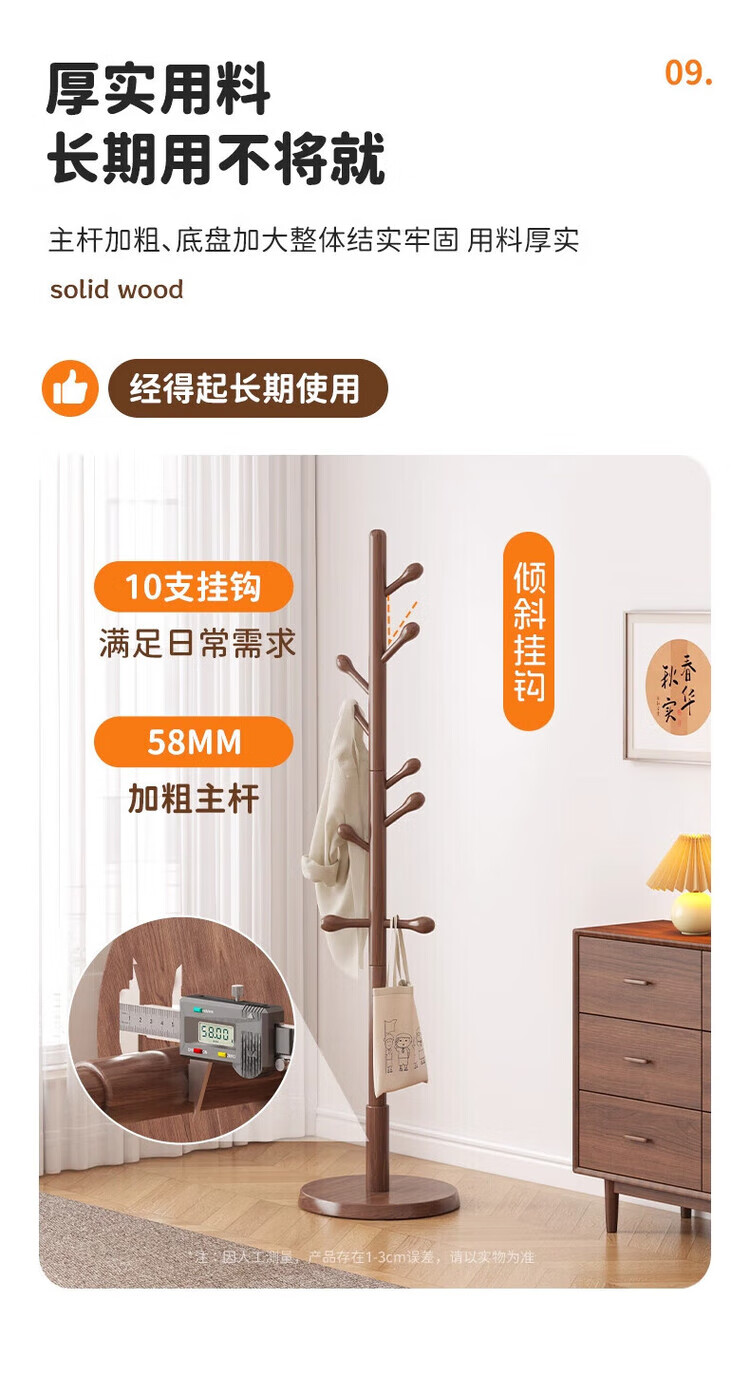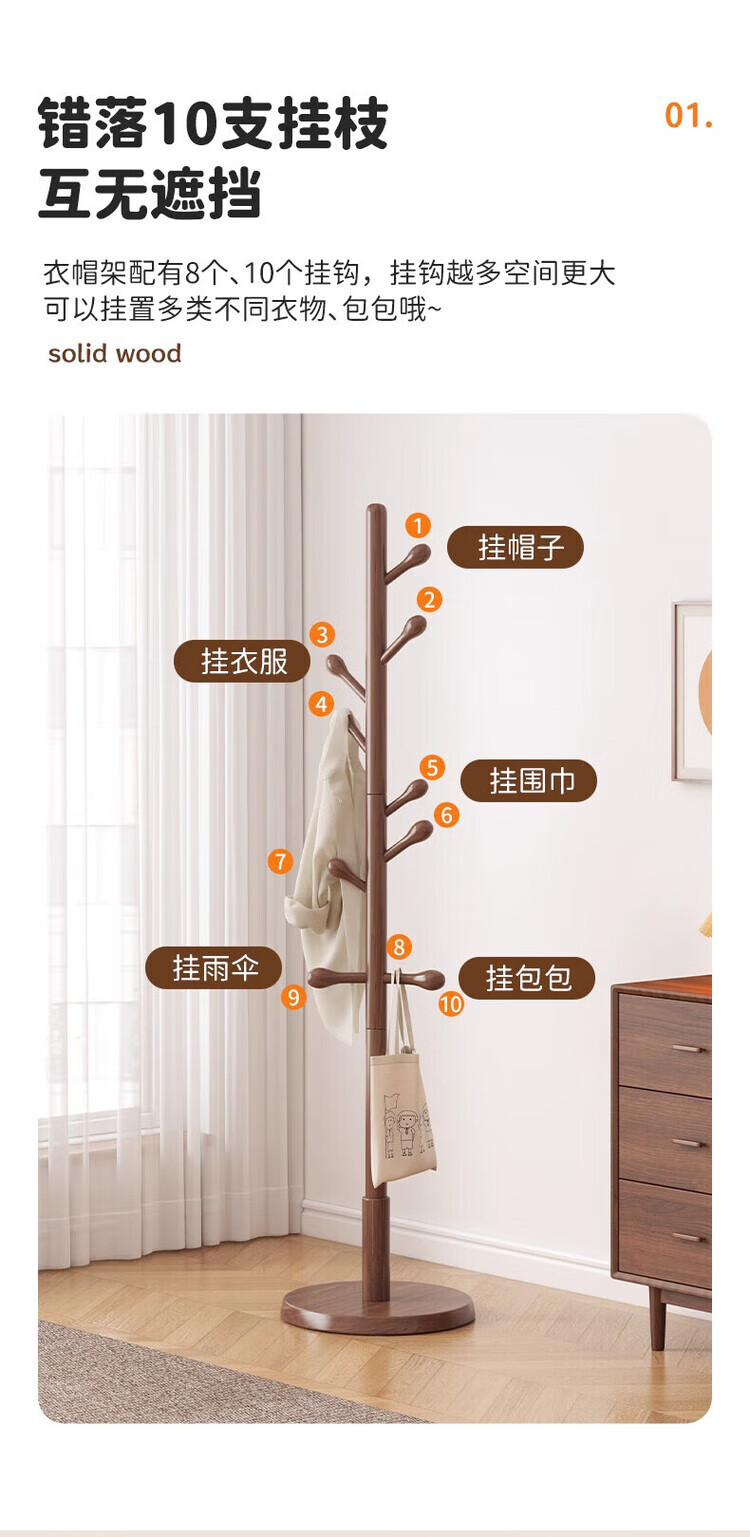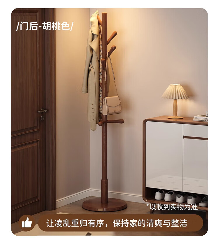 Bedroom clothes rail 2025 new solid wood floor-standing clothes rack does not take up space in the home simple coat rack hanging bag rack thick solid wood walnut color disc style 35CM