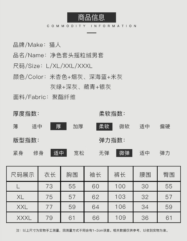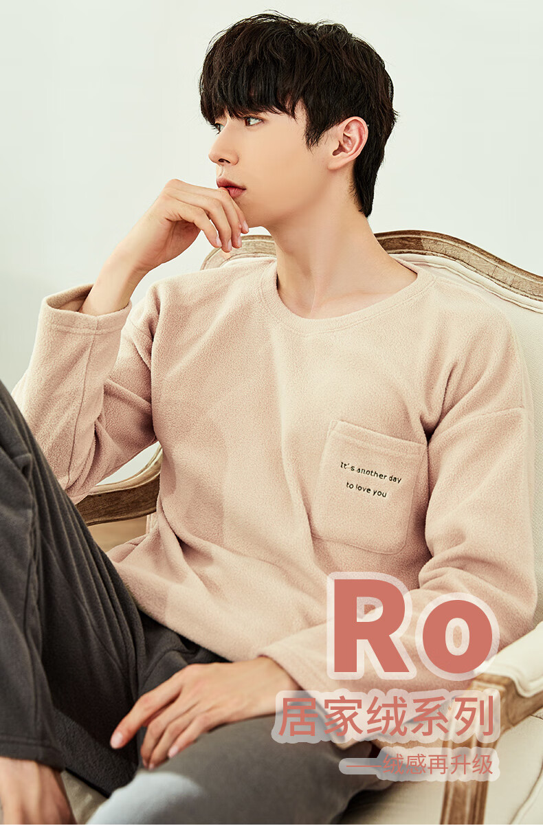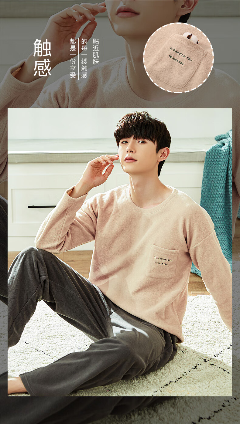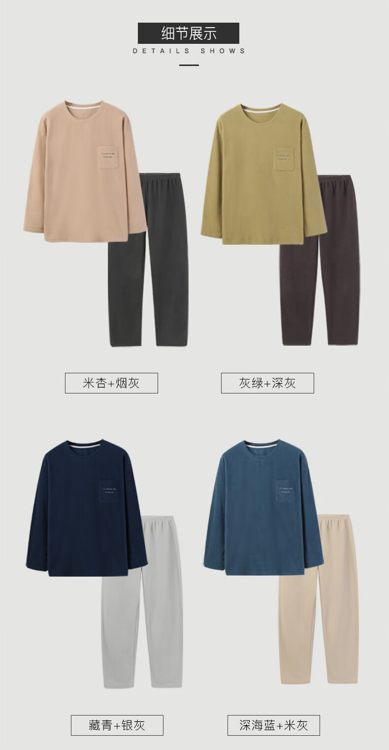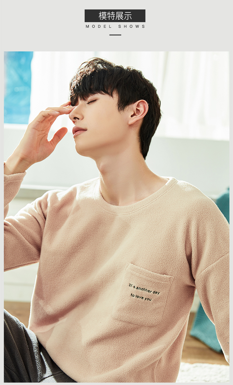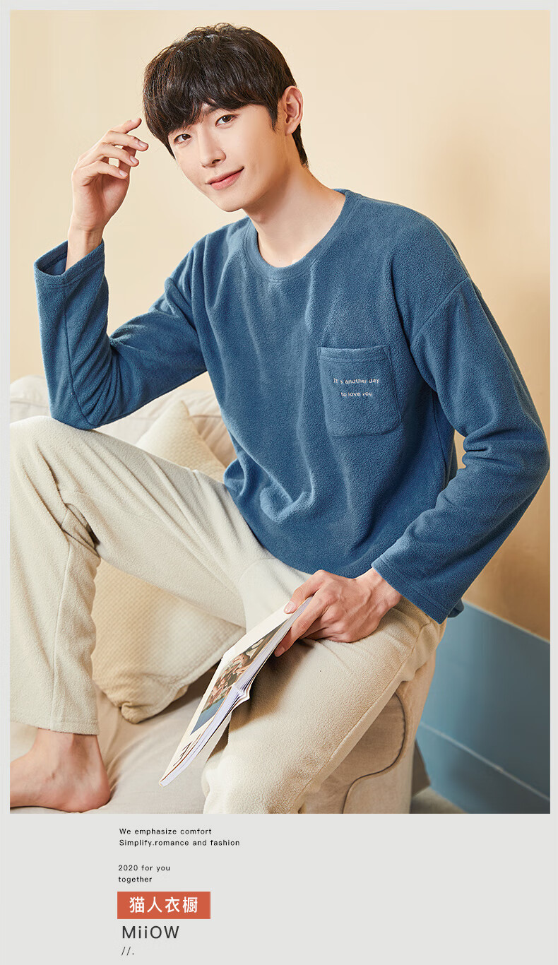 Catman MiiOW Pajamas Men's Solid Color Pullover Polar Fleece Simple Elegant Cartoon Winter Casual Thick Home Clothes Navy + Silver Gray XL