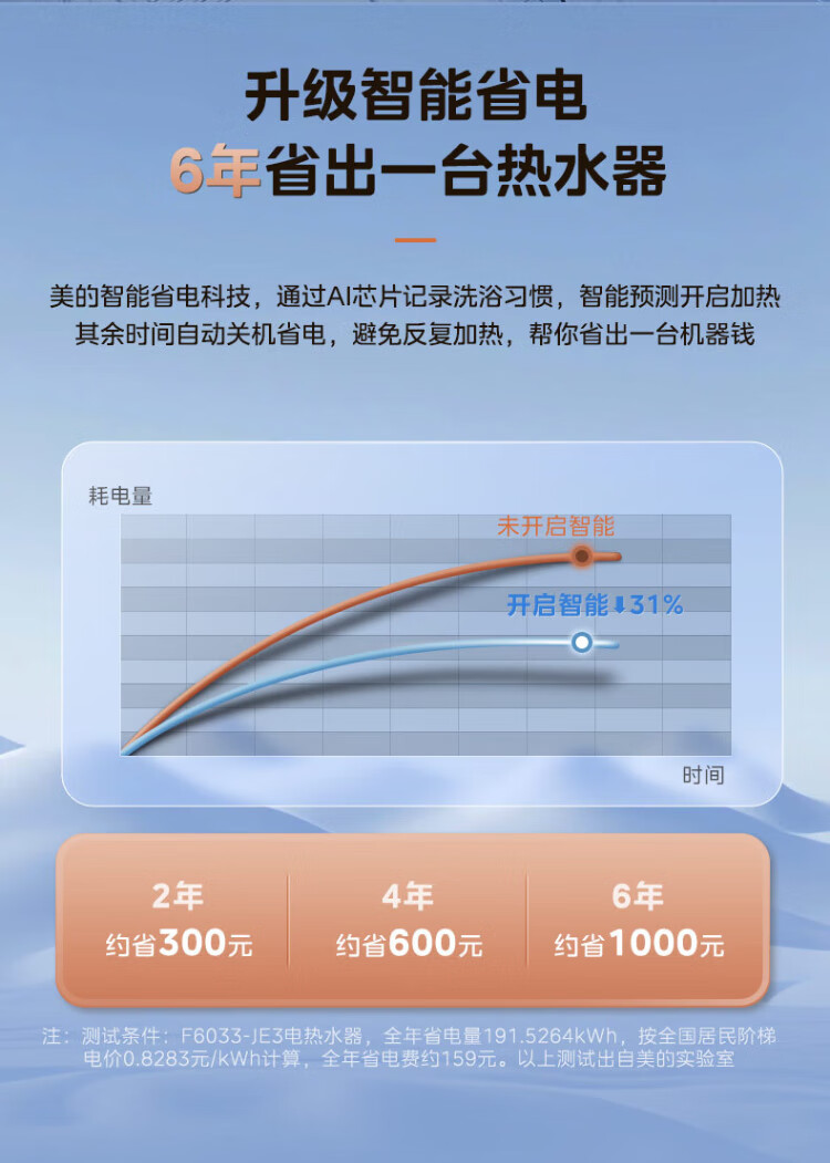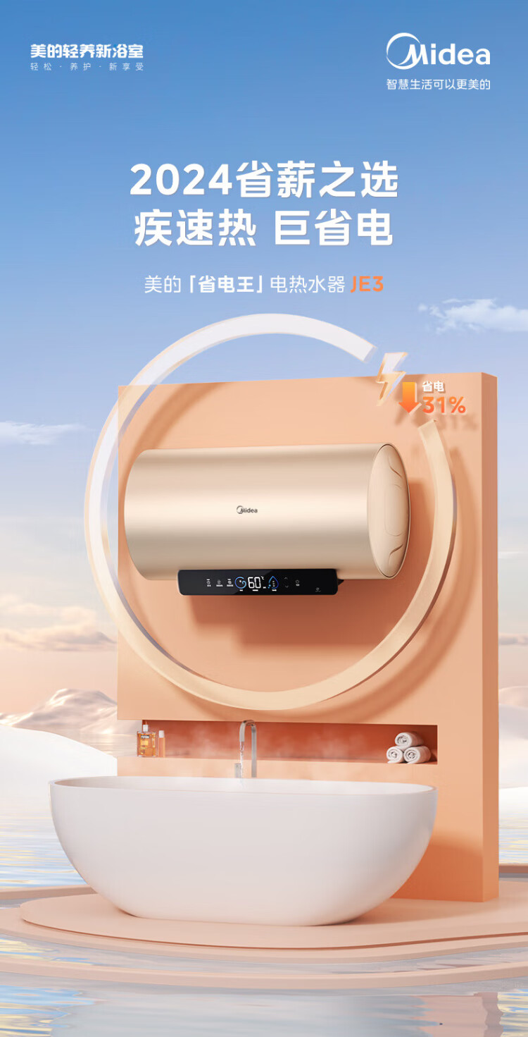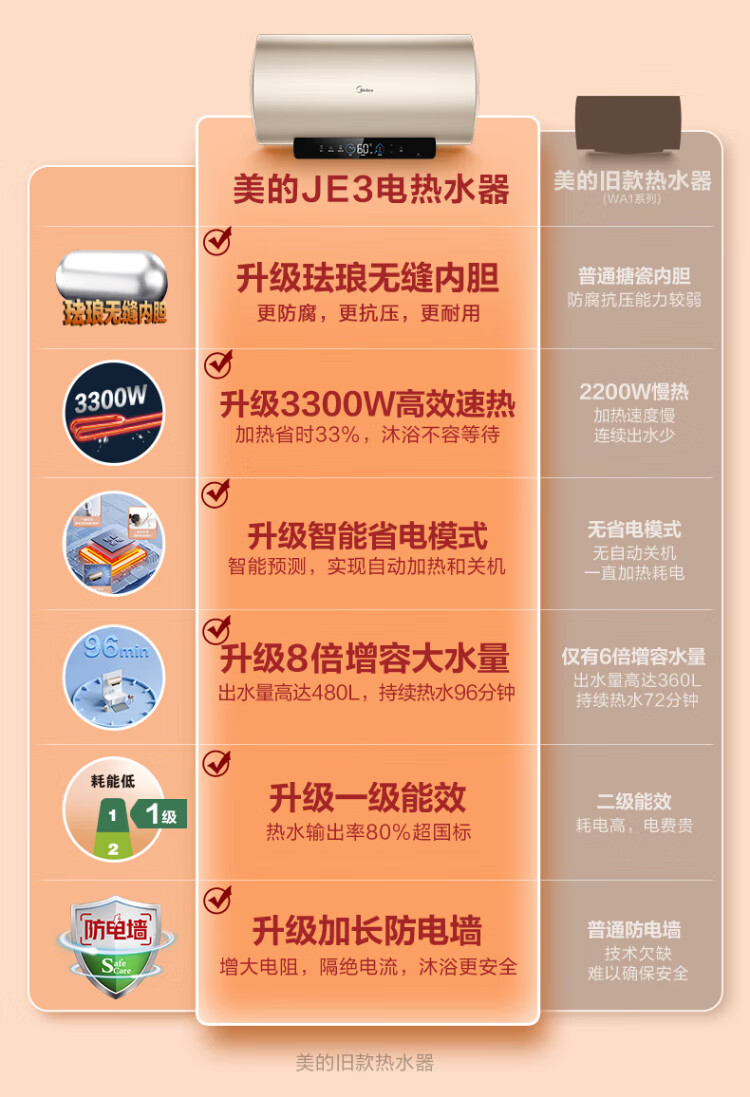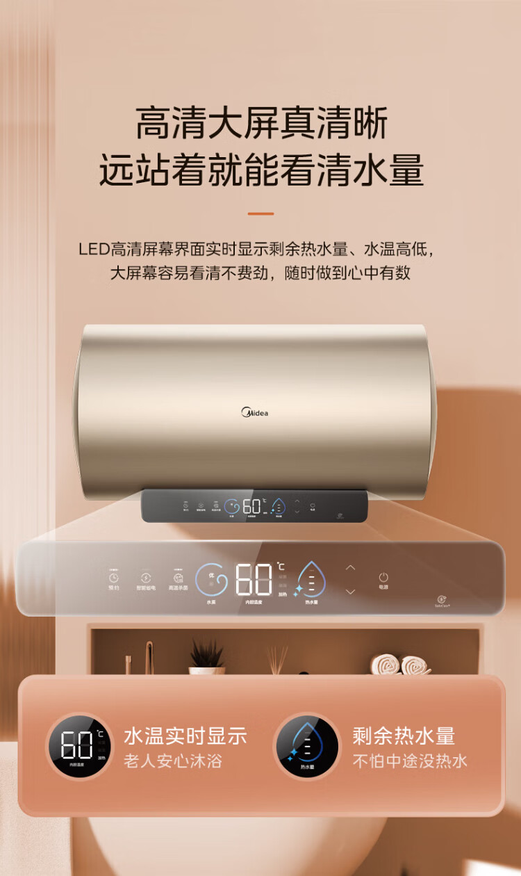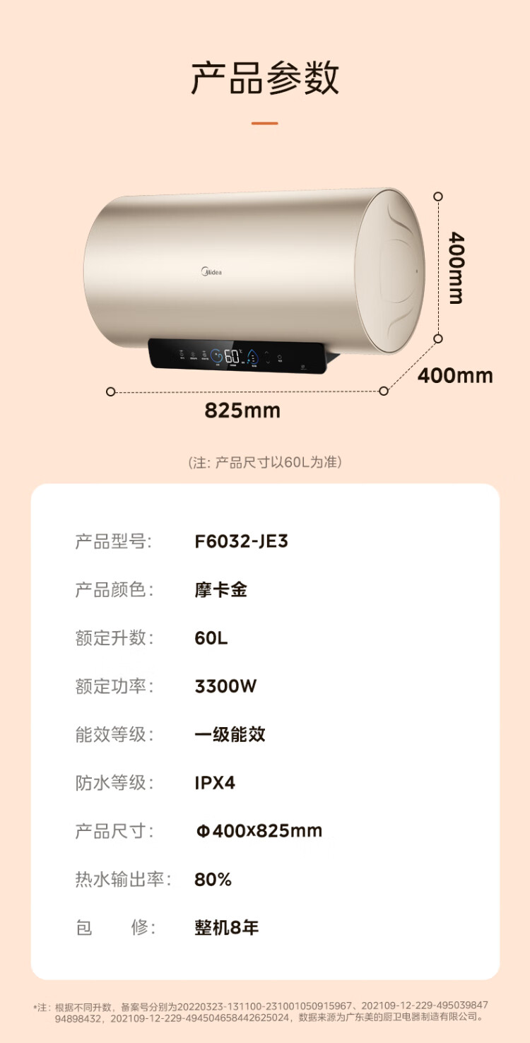 Midea household 60-liter 3300W high-power electric water heater, fast heating, large water volume, long-lasting, no-replacement magnesium rod, enamel seamless inner tank, first-class energy efficiency, intelligent power saving, F6032-JE3 (HE)