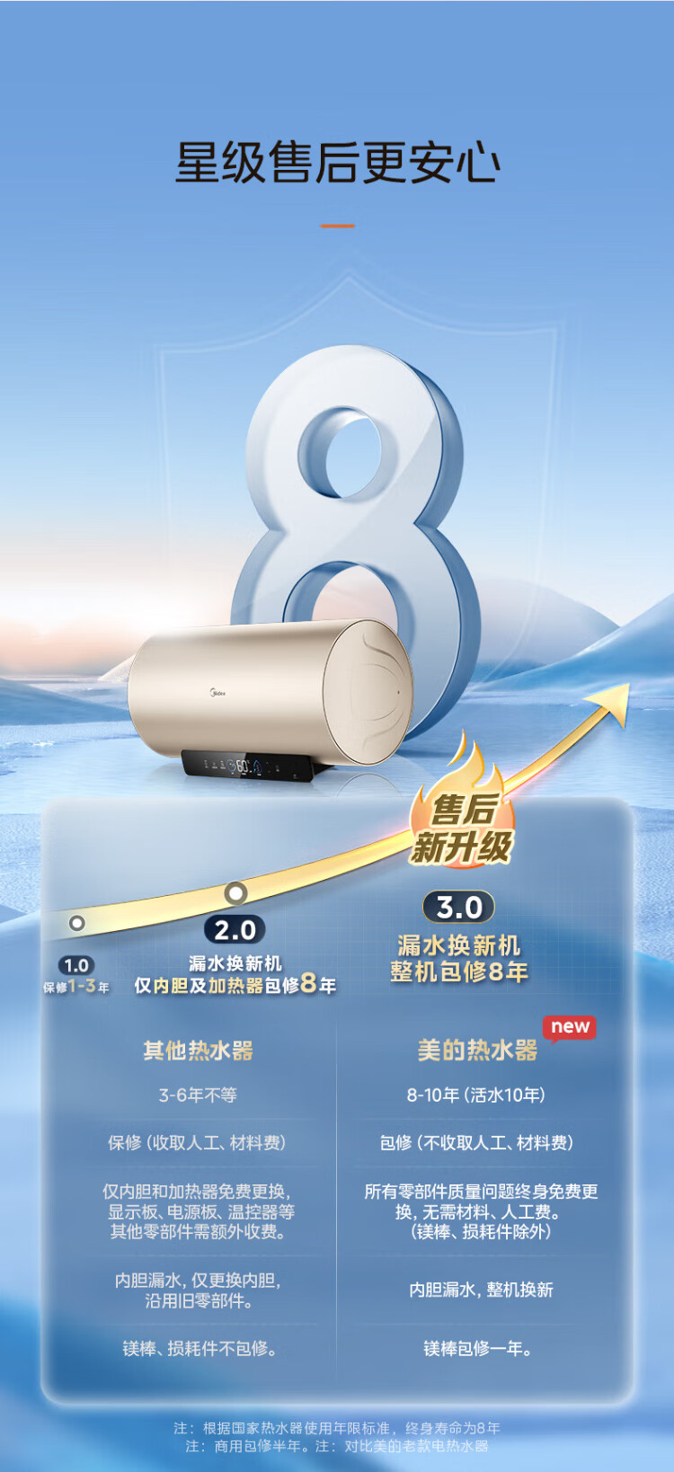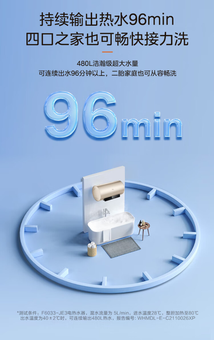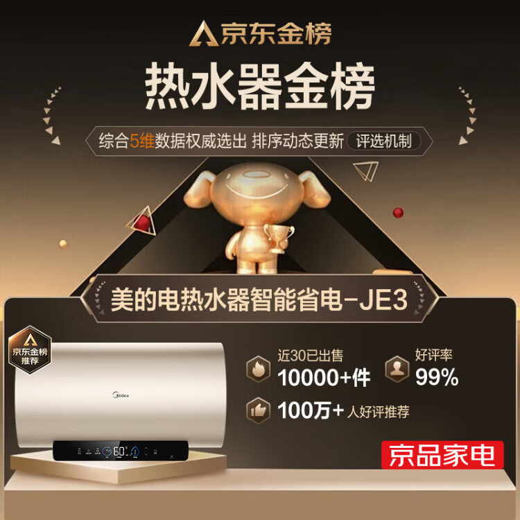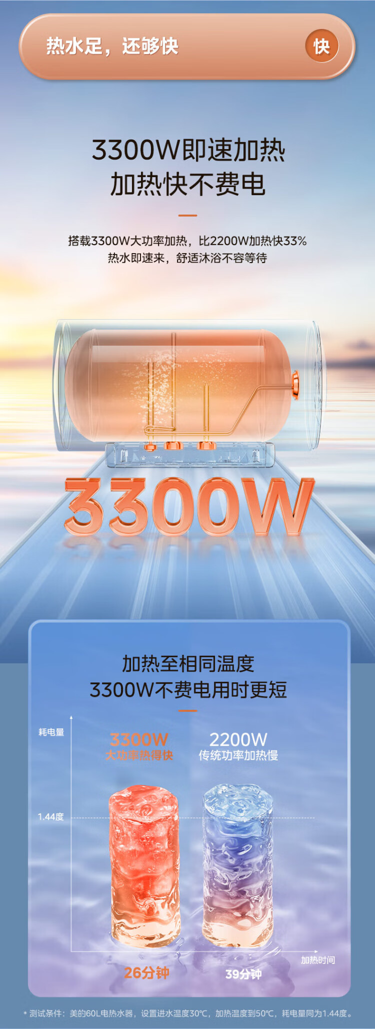 Midea household 60-liter 3300W high-power electric water heater, fast heating, large water volume, long-lasting, no-replacement magnesium rod, enamel seamless inner tank, first-class energy efficiency, intelligent power saving, F6032-JE3 (HE)