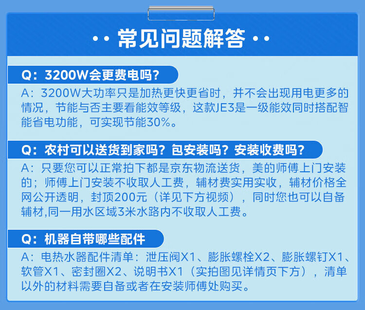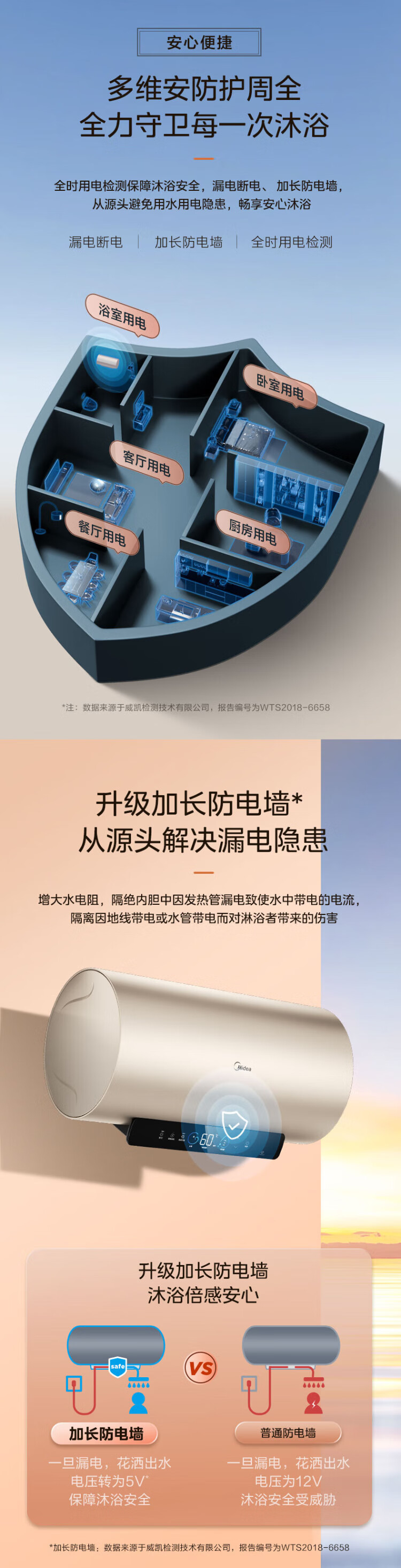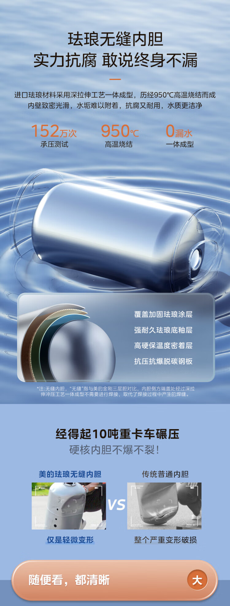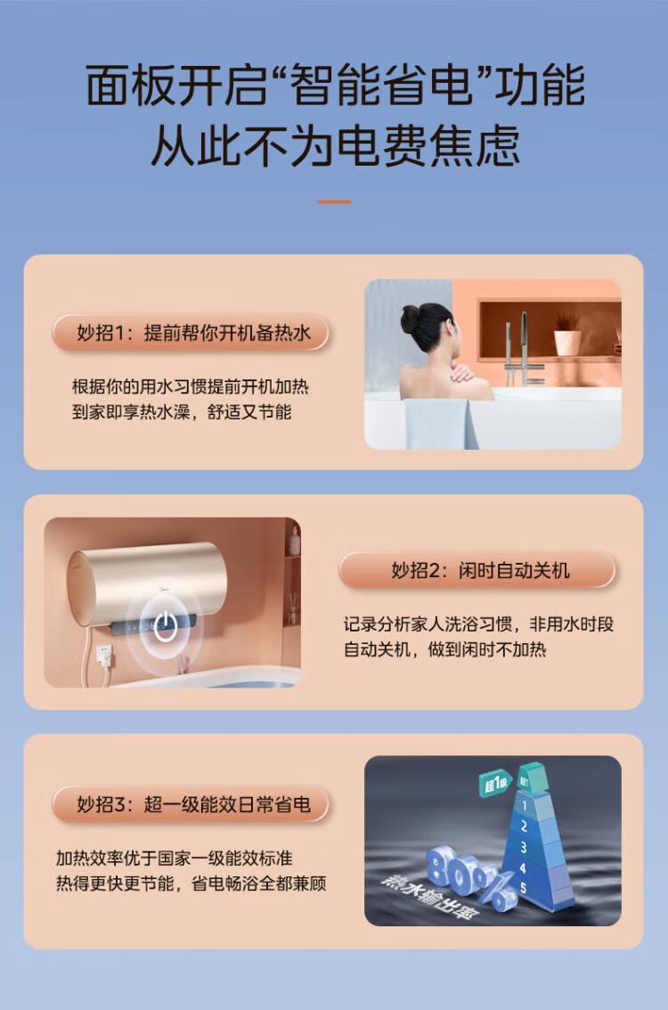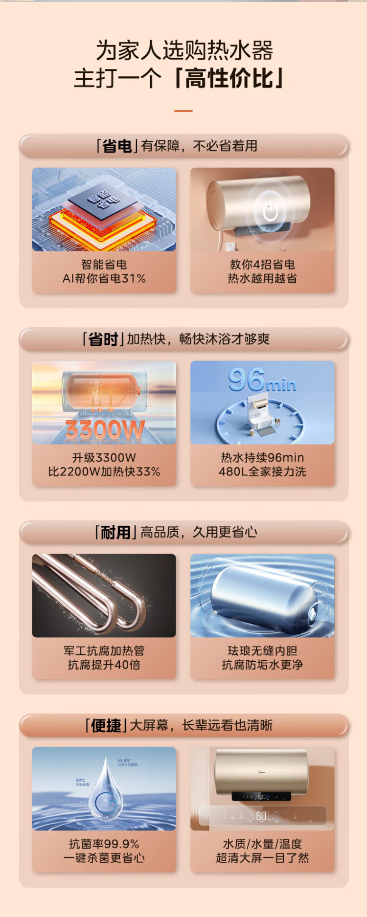 Midea household 60-liter 3300W high-power electric water heater, fast heating, large water volume, long-lasting, no-replacement magnesium rod, enamel seamless inner tank, first-class energy efficiency, intelligent power saving, F6032-JE3 (HE)