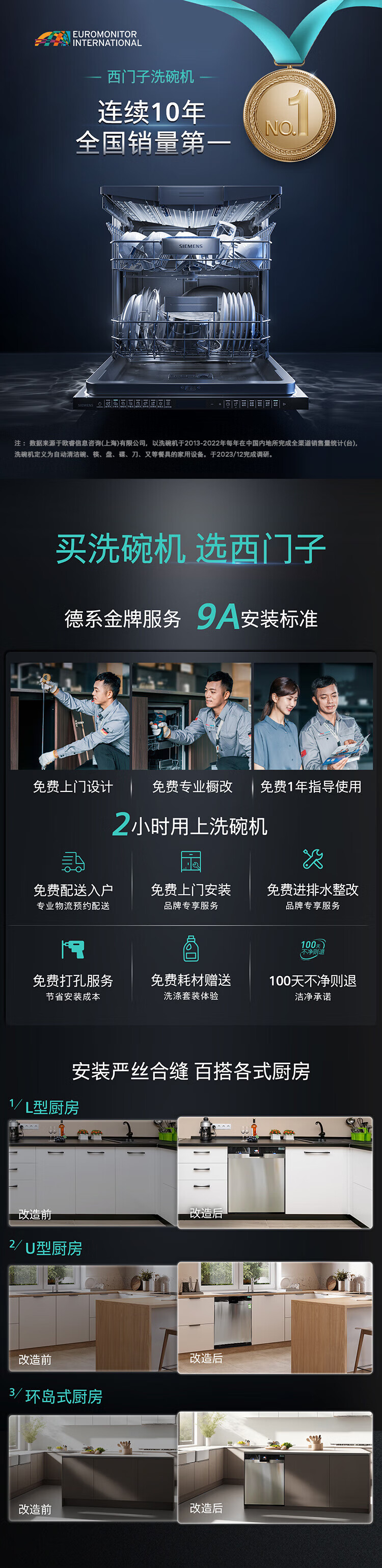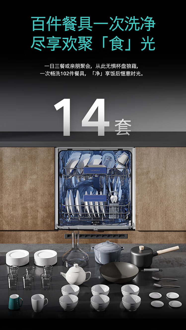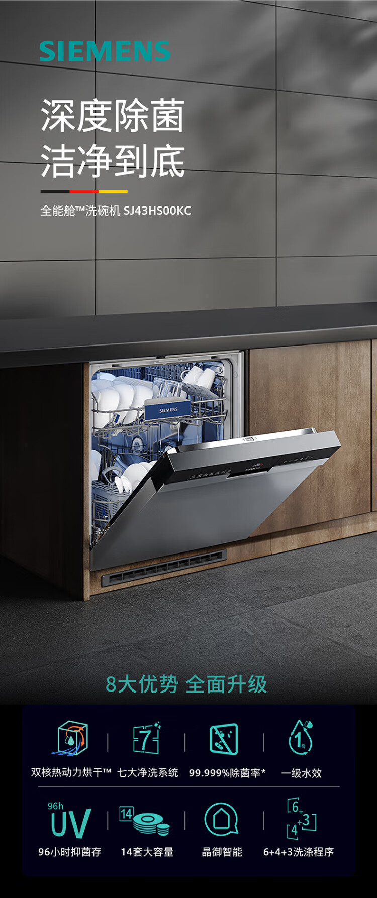 Siemens 14 sets of all-around cabin dishwasher embedded, disinfection, precision eddy current, intelligent dehumidification and drying, 96h storage, intelligent sterilization and disinfection, SJ43HS00KC
