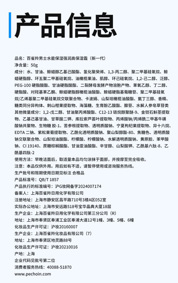 Pechoin Men's Skin Care Cream Water Moisturizing Strong Moisturizing High Moisturizing Cream 50g Quality Domestic Products Mid-Autumn Festival Gift
