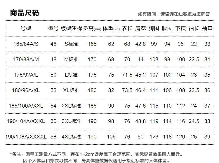 China (cm) 160-165/84-86 165-170 / 88-90 167-172 / 92-96 168-173 / 98-102 170-176 / 106-110