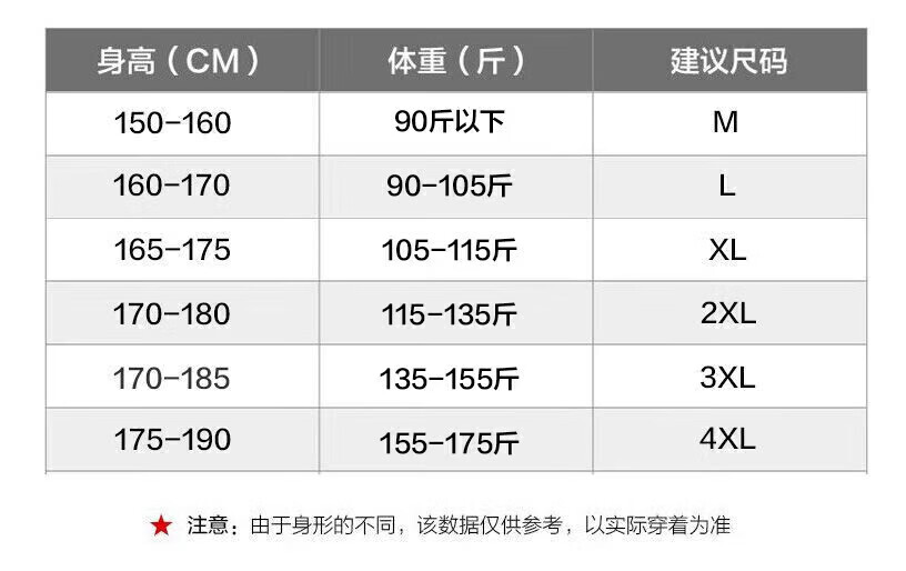 China (cm) 165 / 88-90 170 / 96-98 175 / 108-110 180 / 118-122 185 / 126-130