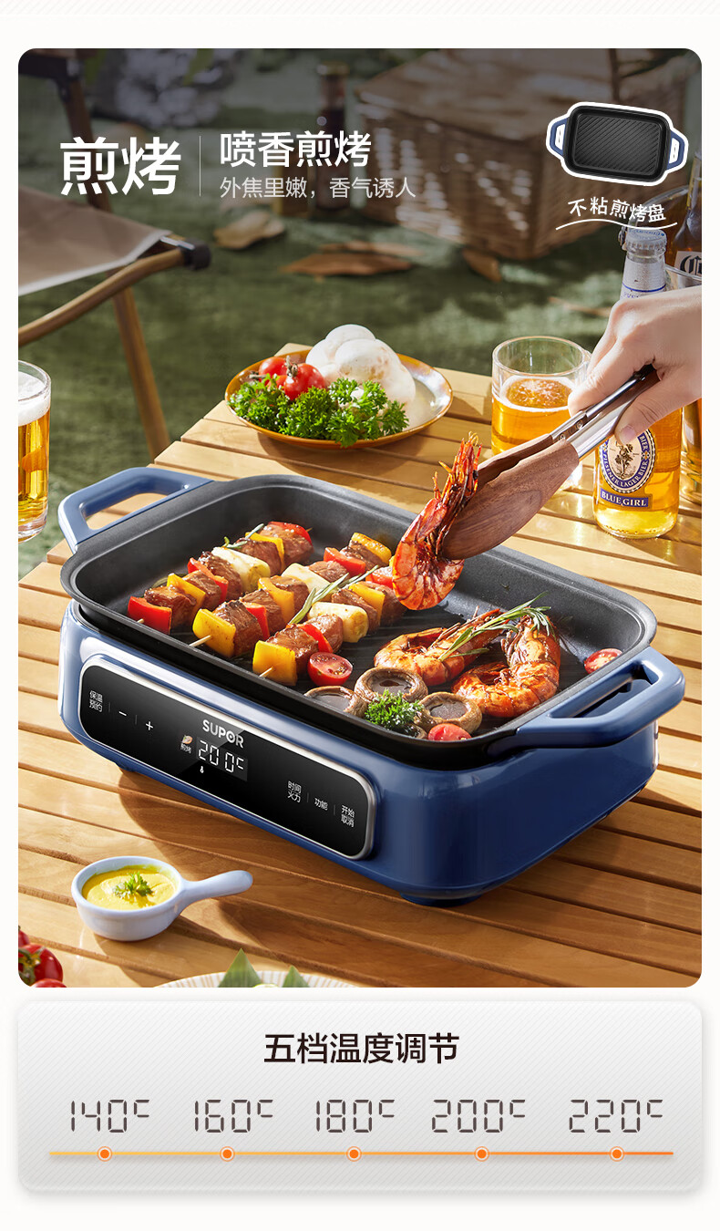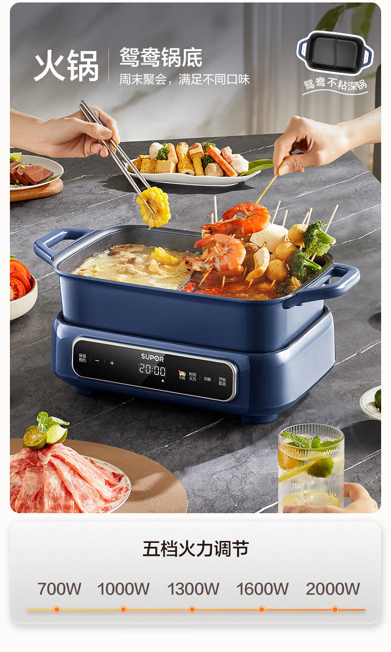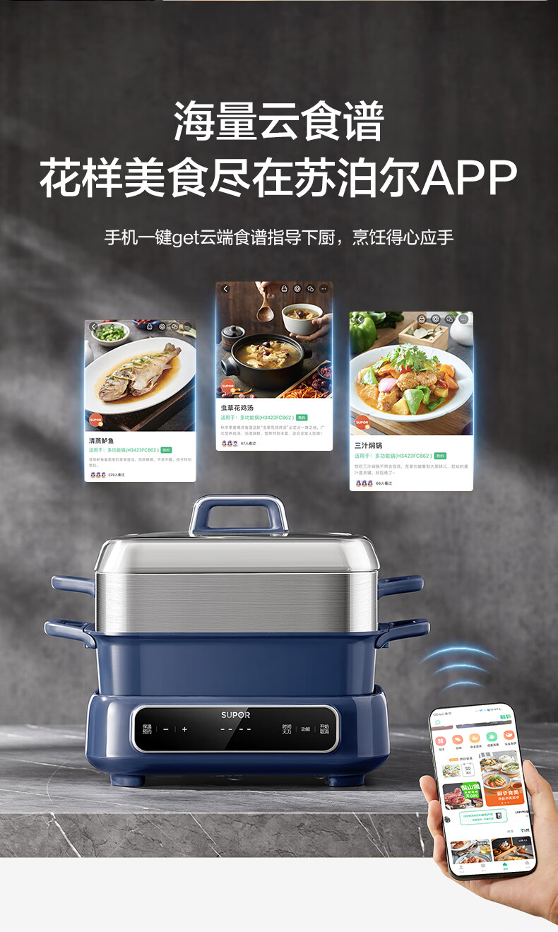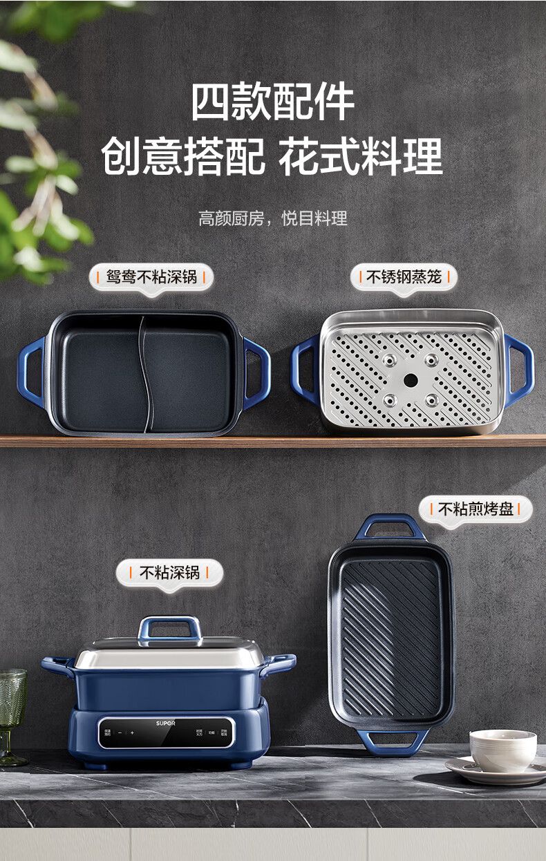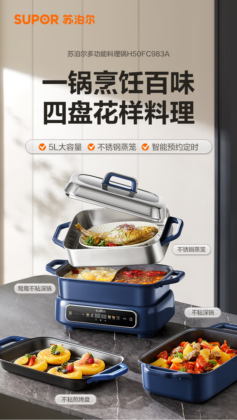 SUPOR household multifunctional meat-shabu-grilled fish barbecue pot smart electric steamer electric cooking pot electric hot pot multi-purpose split non-stick cooking pot electric hot pot H50FC983A