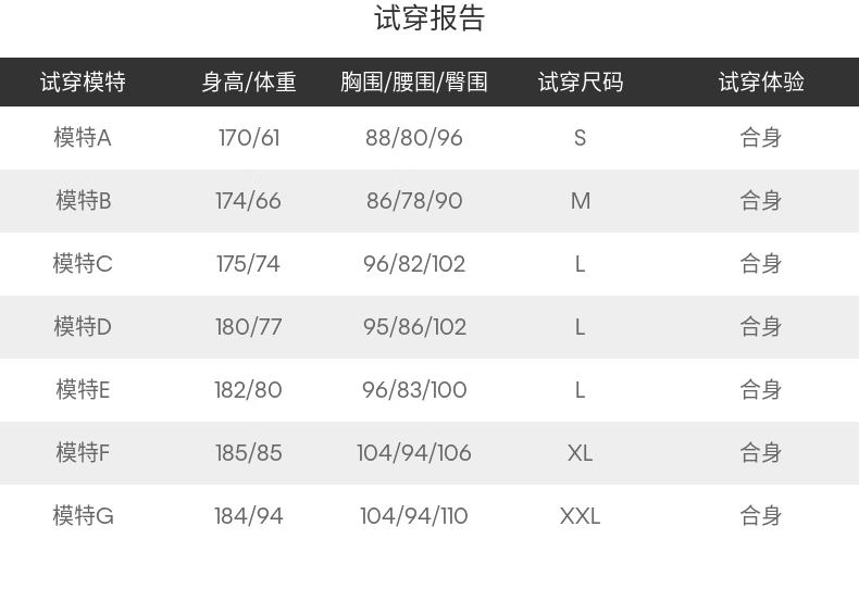 China (cm) 160-165/84-86 165-170 / 88-90 167-172 / 92-96 168-173 / 98-102 170-176 / 106-110