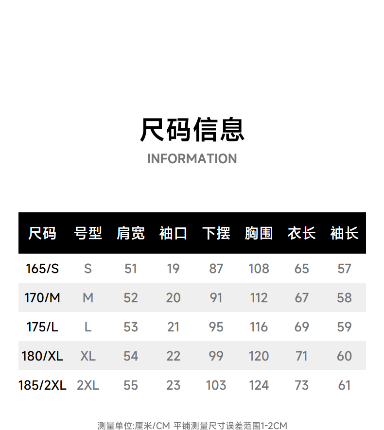 China (cm) 165 / 88-90 170 / 96-98 175 / 108-110 180 / 118-122 185 / 126-130