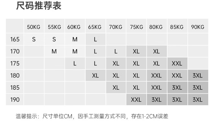 China (cm) 165 / 88-90 170 / 96-98 175 / 108-110 180 / 118-122 185 / 126-130