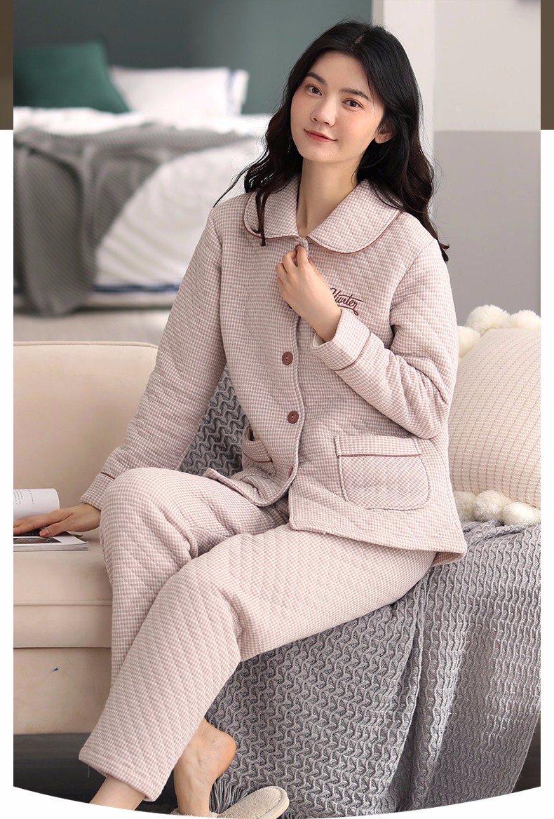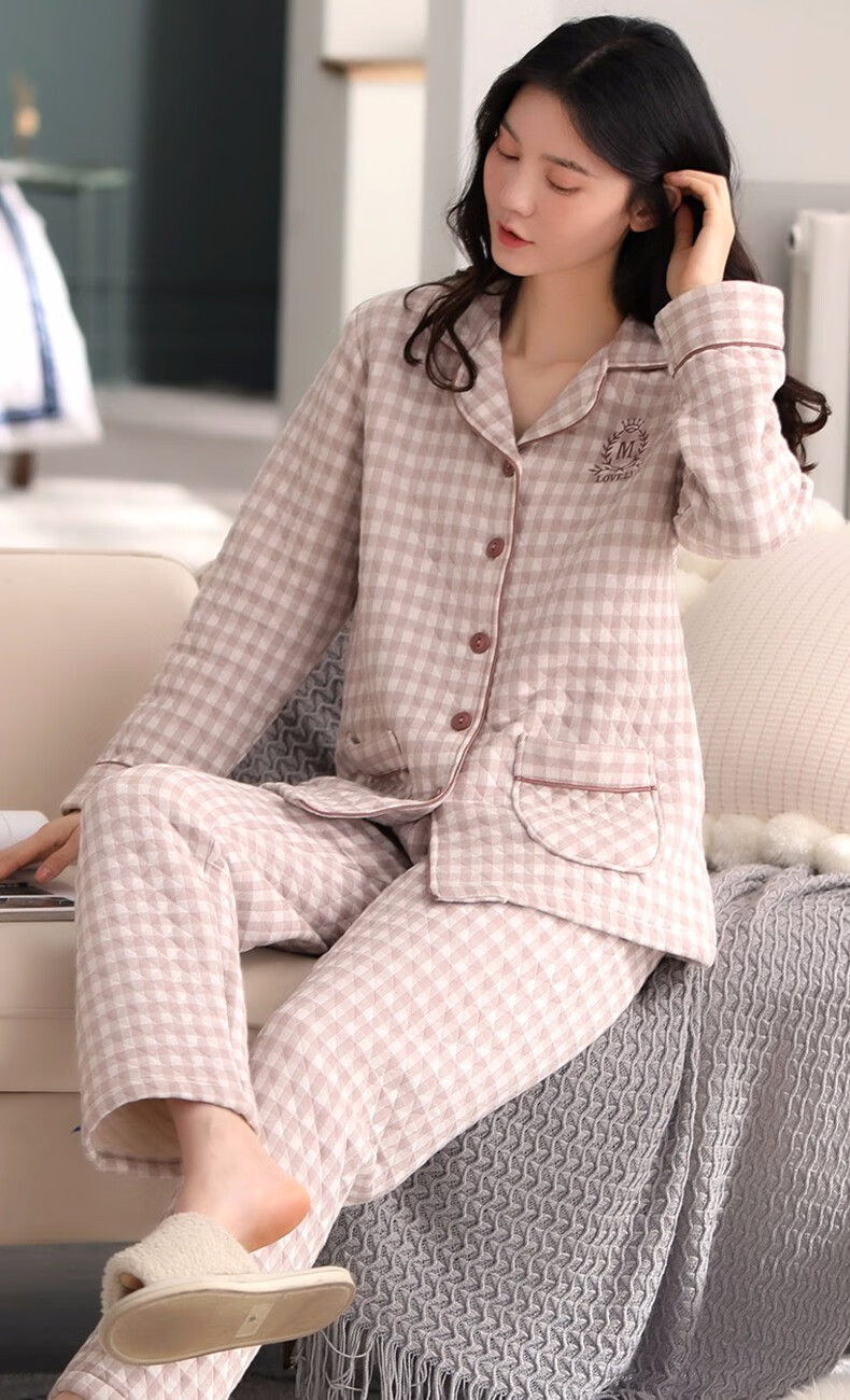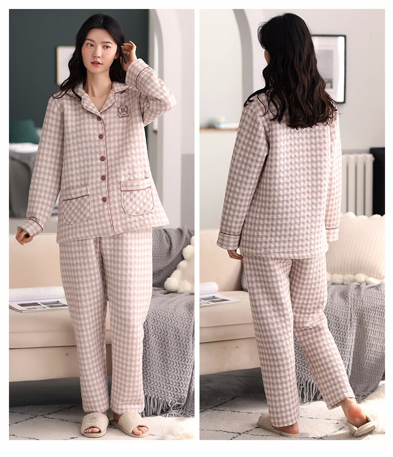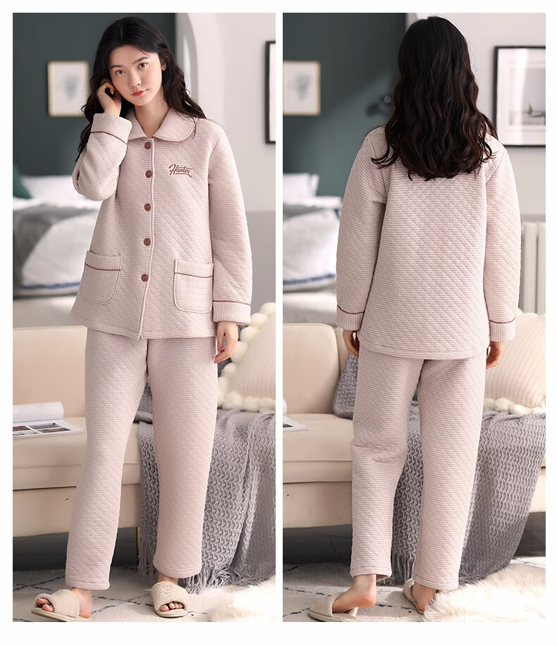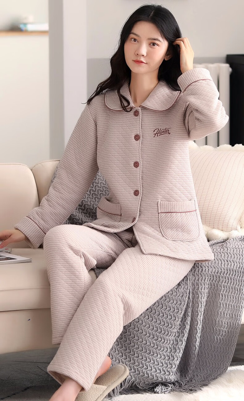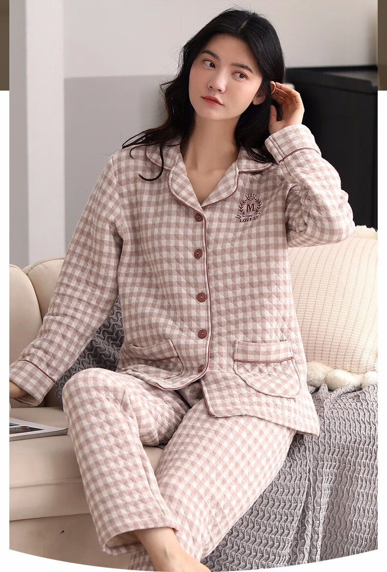 Banxinle (Banxinle) pajamas for middle-aged women, thickened pure cotton sandwich long-sleeved home clothes, winter air cotton thermal insulation, cotton quilted suit LST-88068# light coffee, female L/165