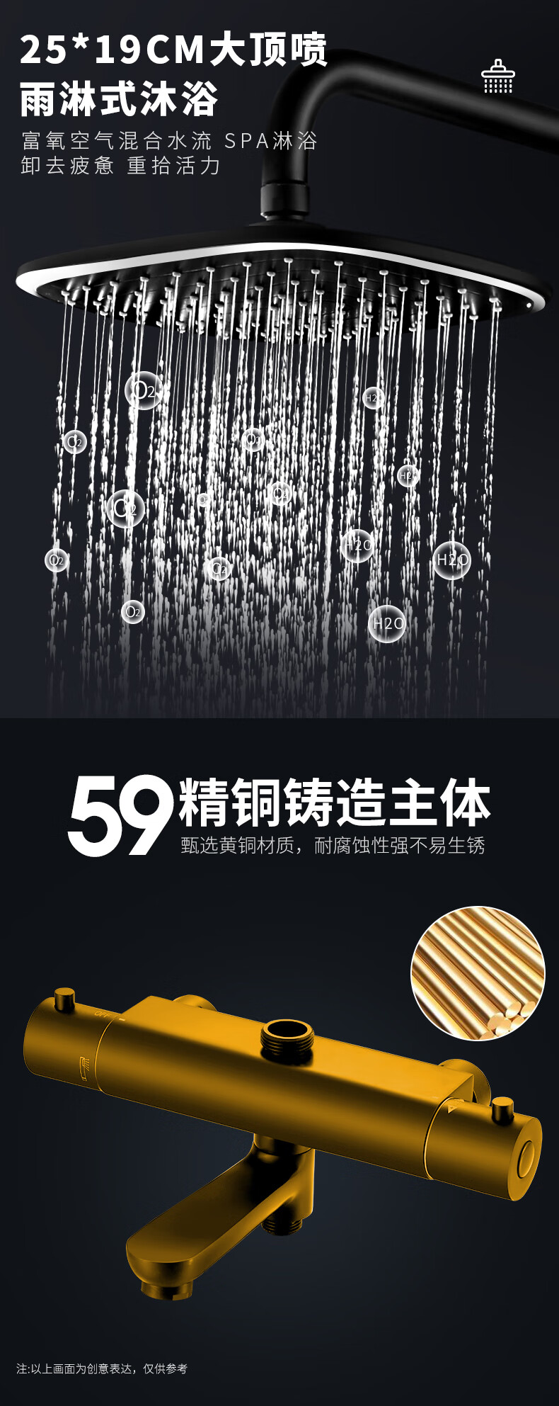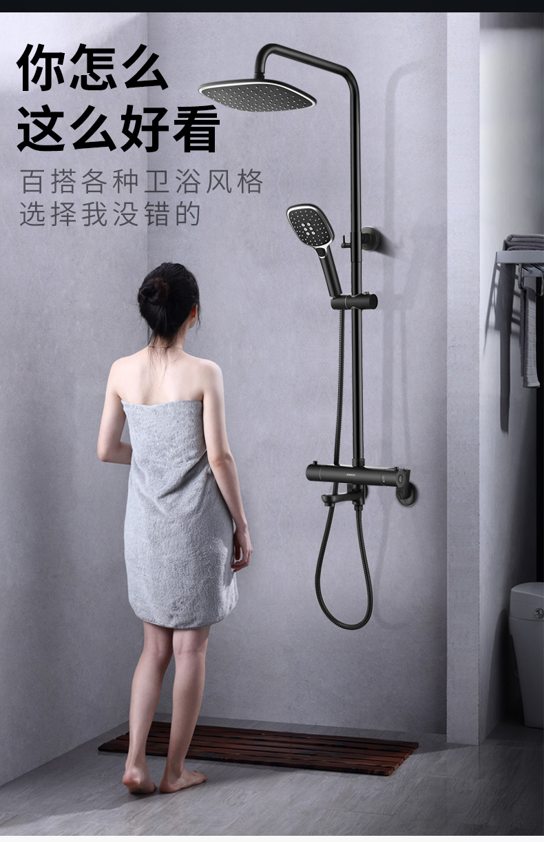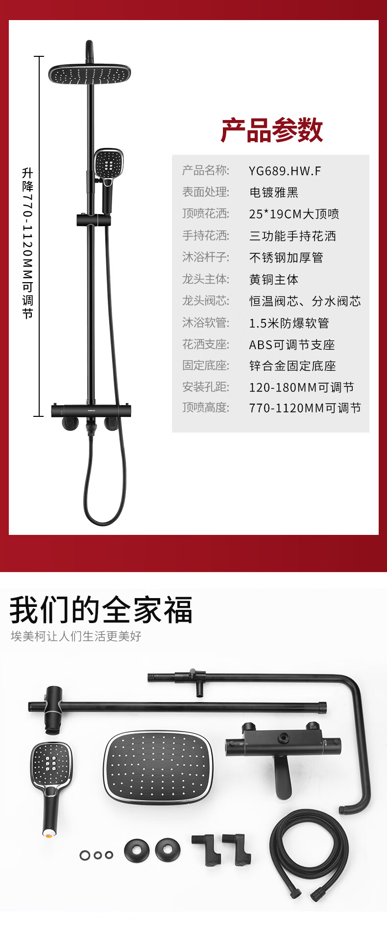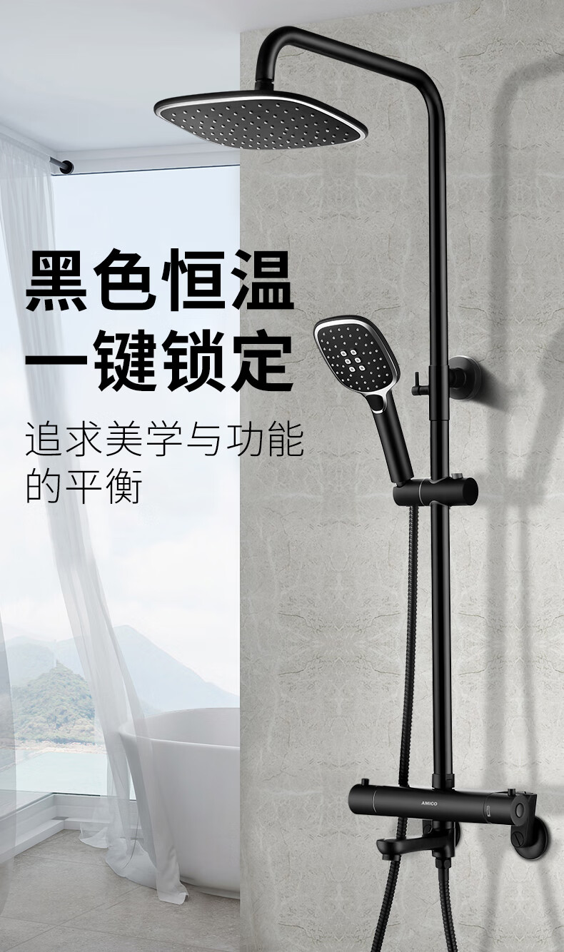 埃美柯黑色花洒YG689F全铜增压淋浴洗澡喷头套装顶喷冷热水恒温水不生水渍方形大出水淋喷头双控水龙头 黑色恒温花洒冷热水套装圆