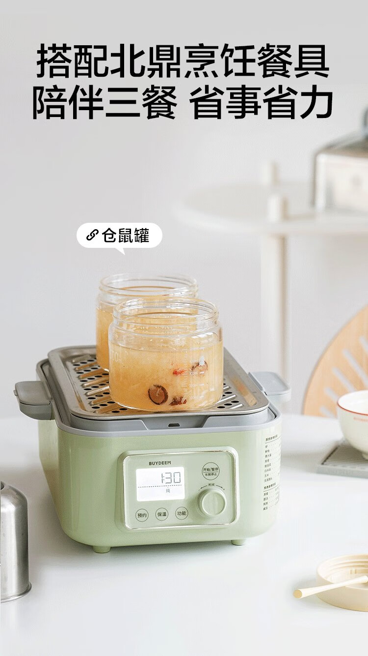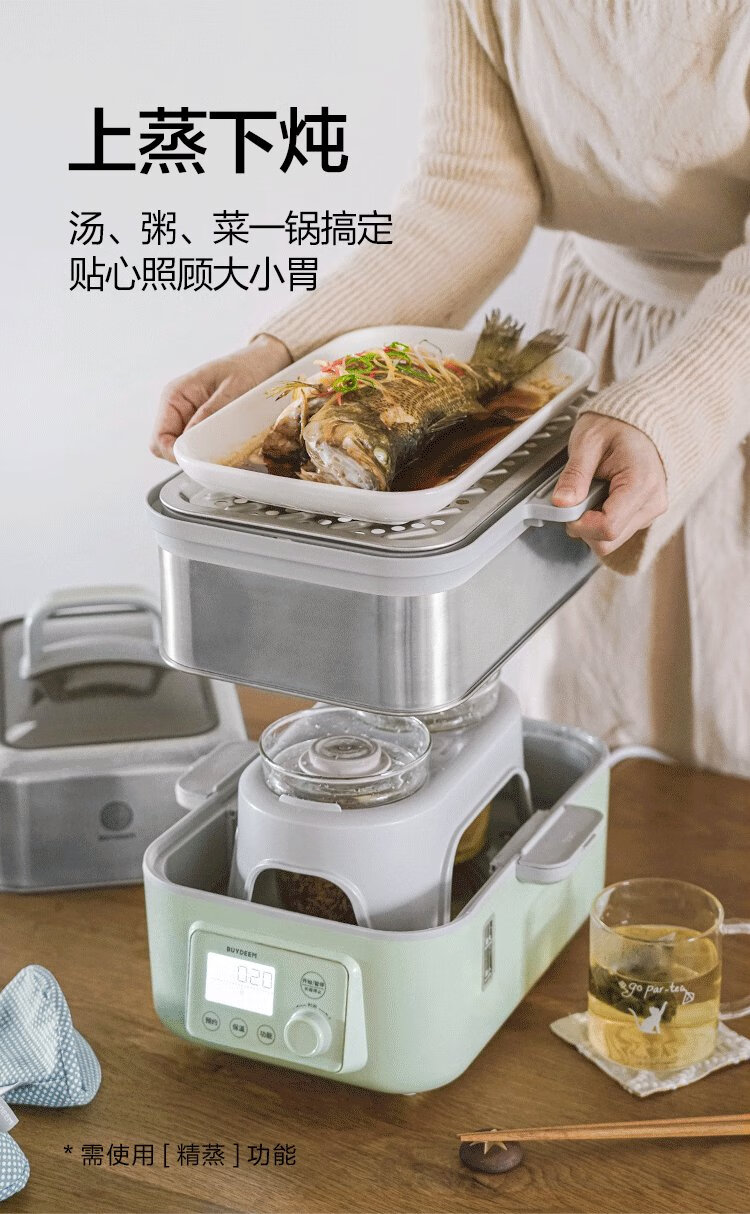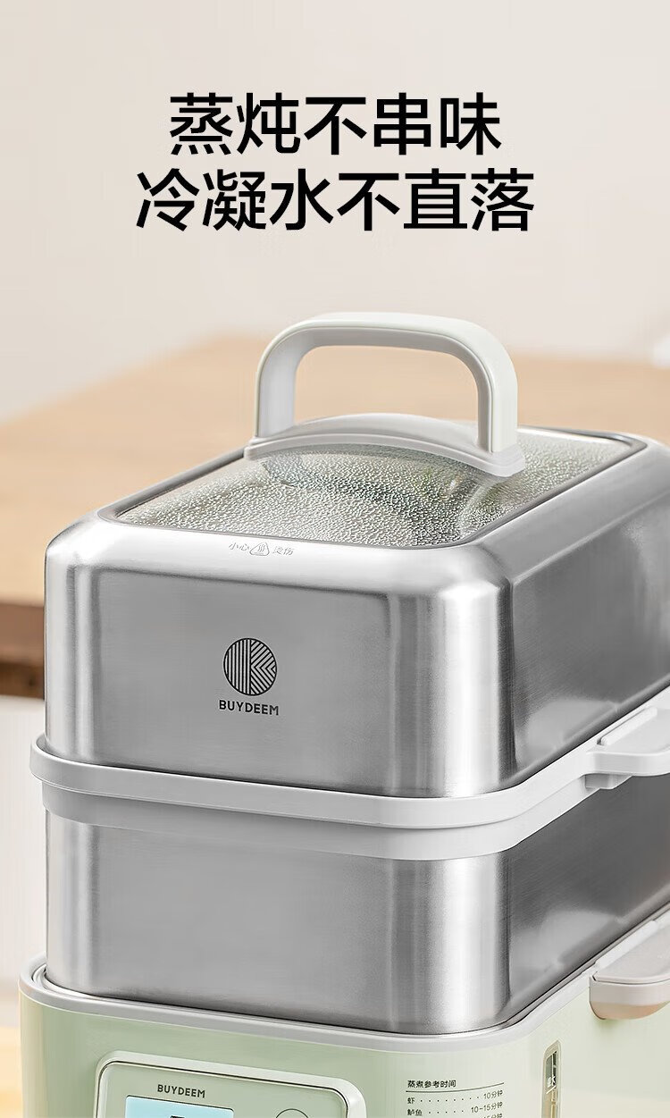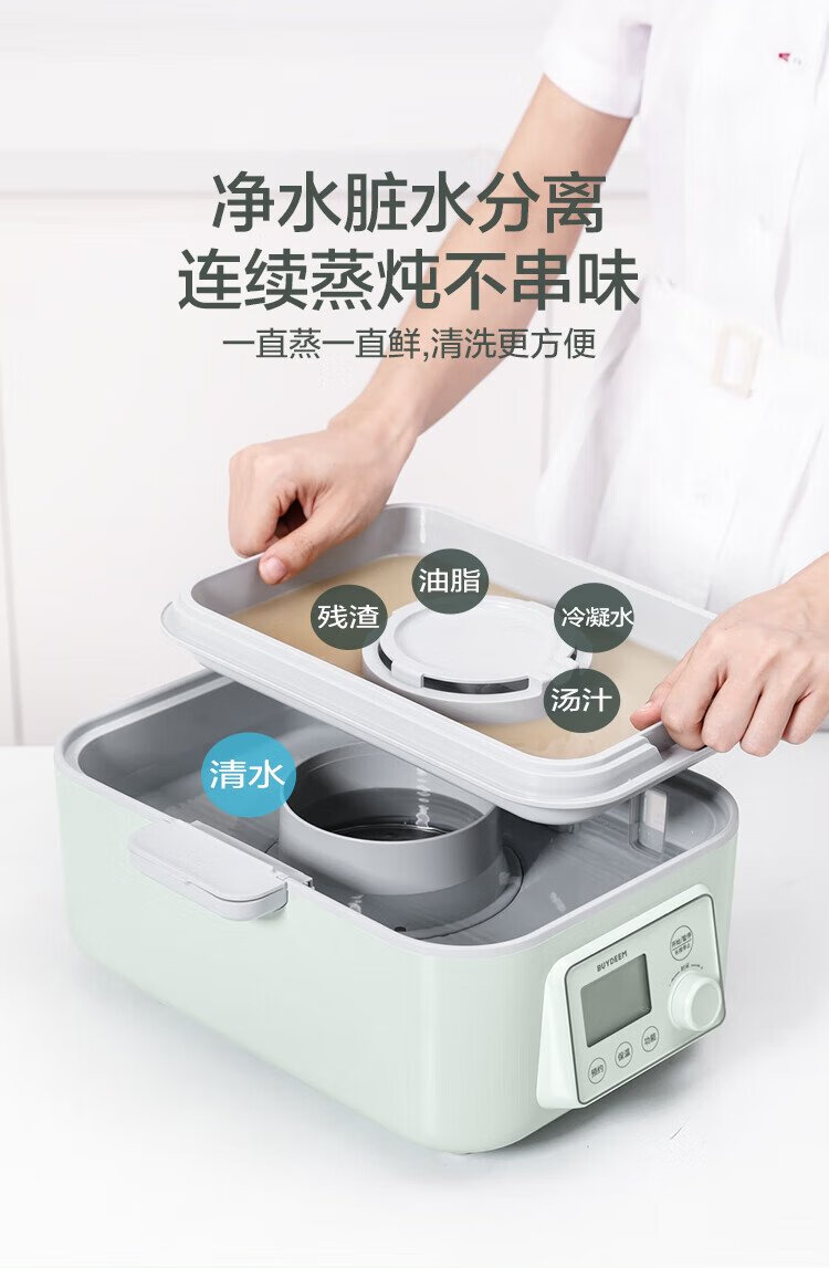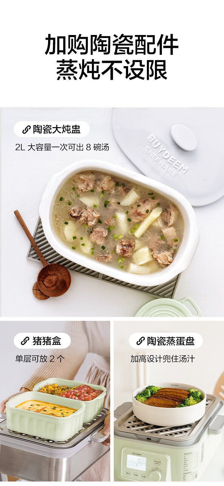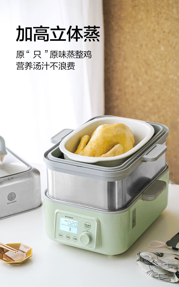Beiding (Buydeem) electric steamer, large-capacity household steamer, stewing and cooking, multi-purpose pot, smart visual electric stewing pot, double-layer timed insulation multi-function pot, stainless steel steamer, G56A shallow fir green, two-layer steamer rack + glass stewed pot + white plate 10L