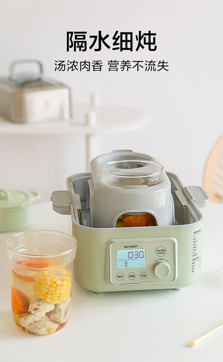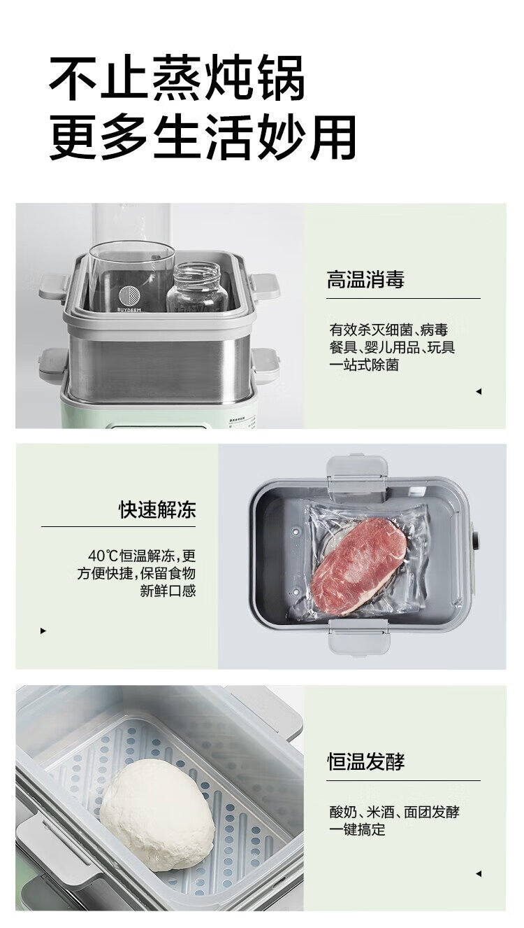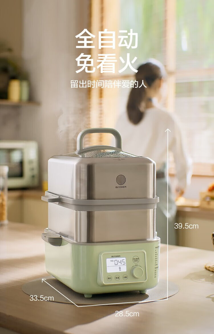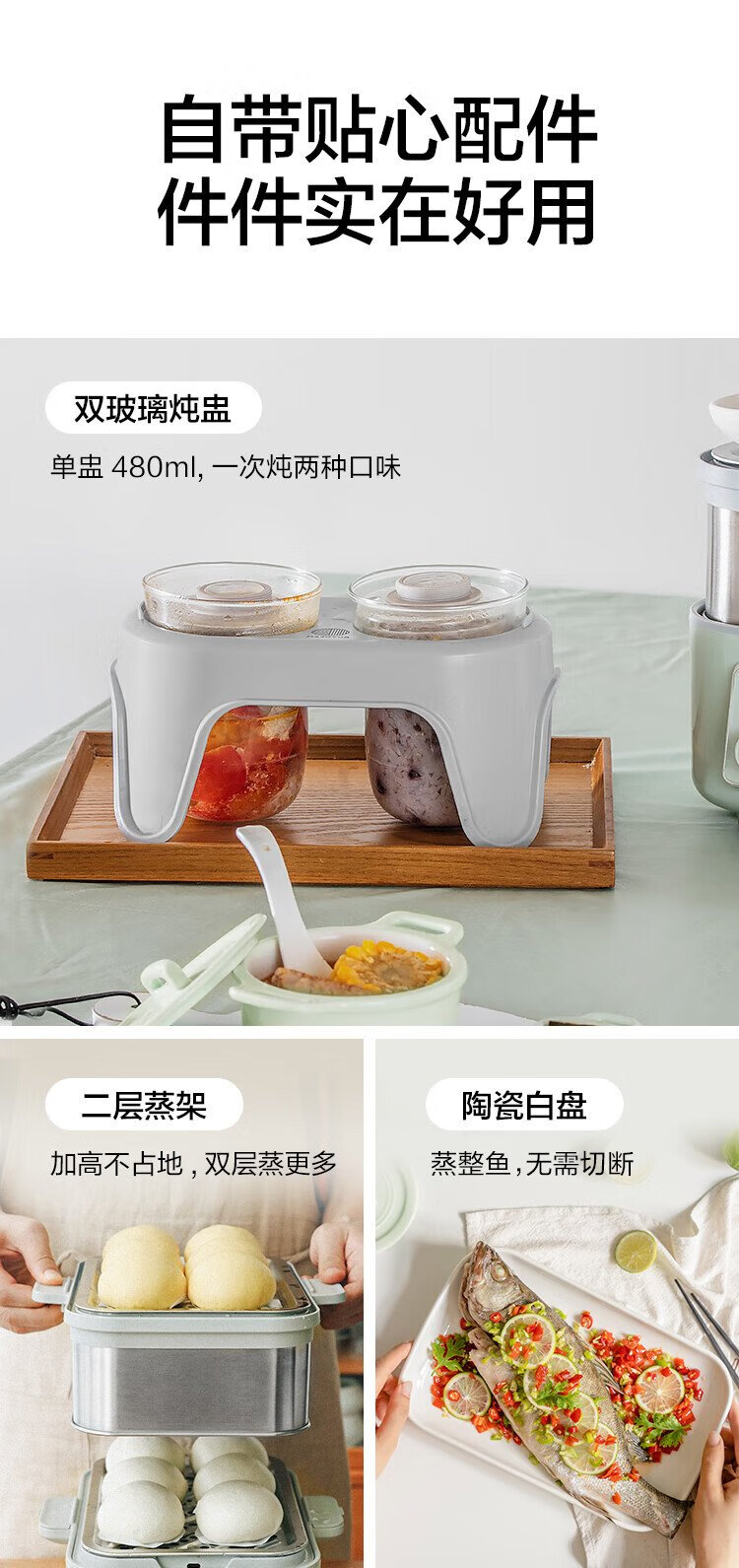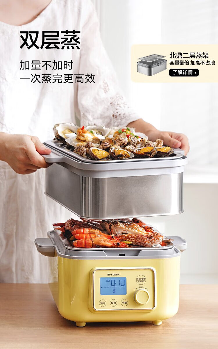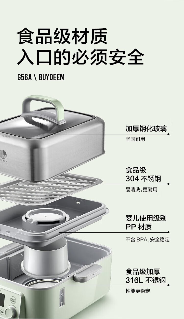 Beiding (Buydeem) electric steamer, large-capacity household steamer, stewing and cooking, multi-purpose pot, smart visual electric stewing pot, double-layer timed insulation multi-function pot, stainless steel steamer, G56A shallow fir green, two-layer steamer rack + glass stewed pot + white plate 10L