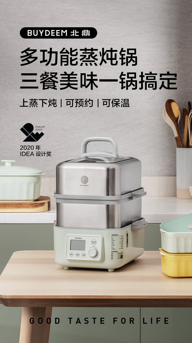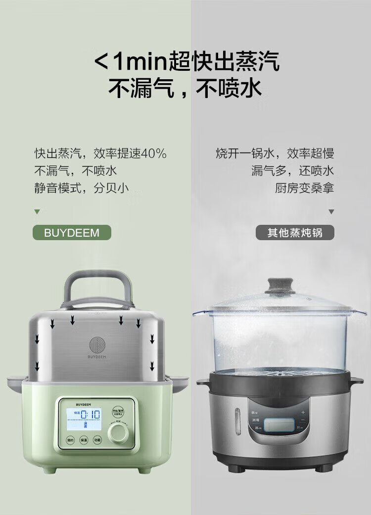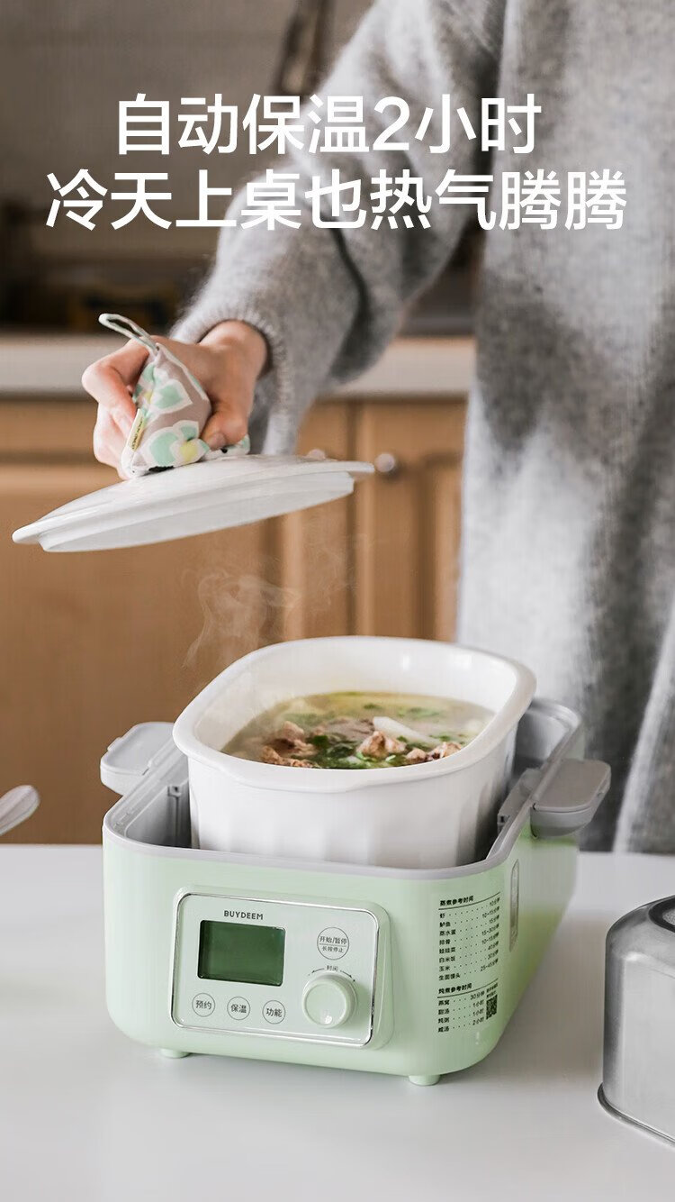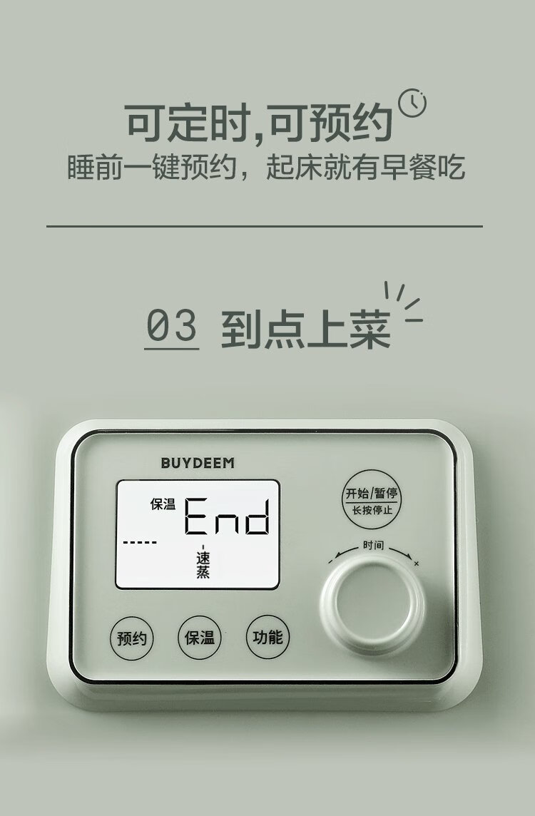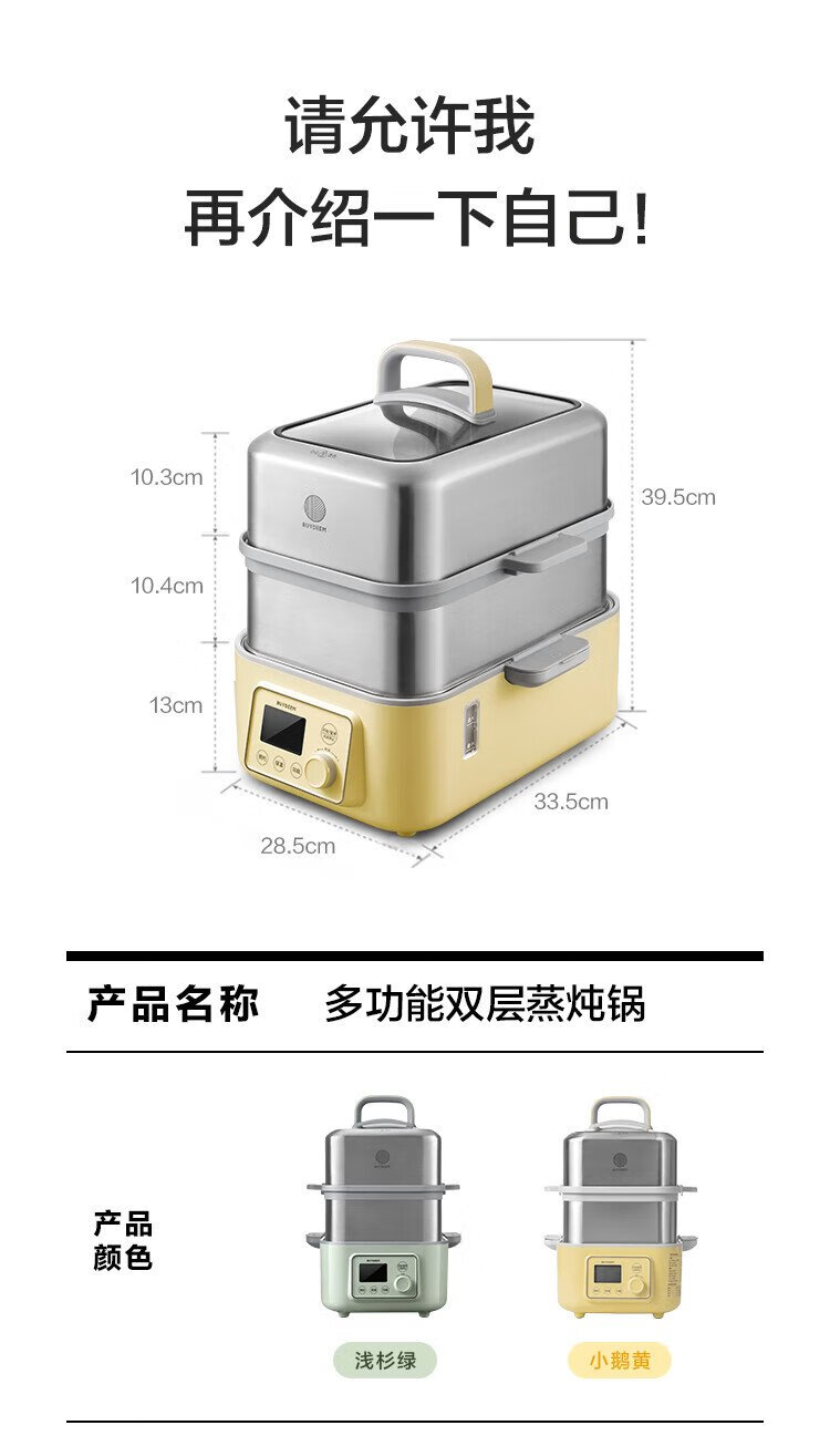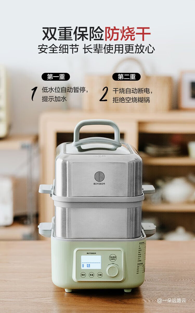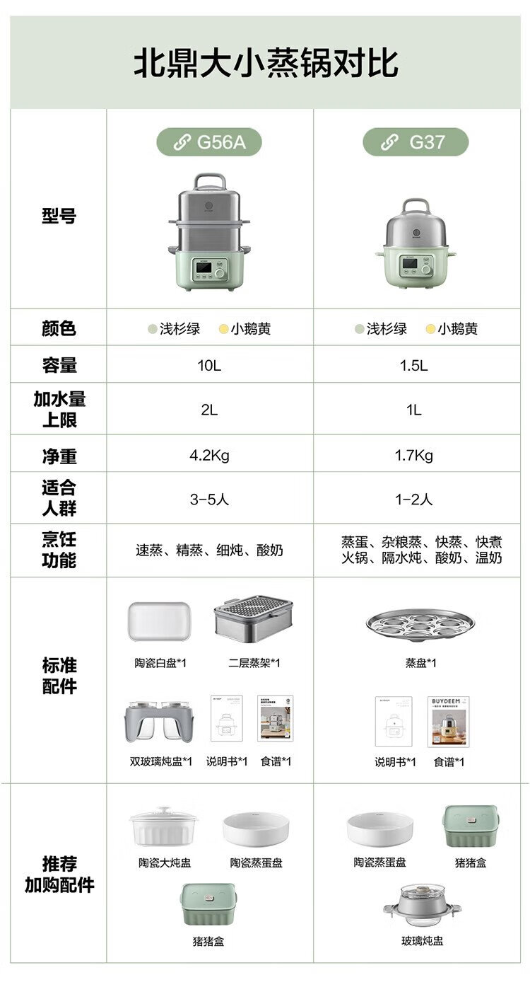 Beiding (Buydeem) electric steamer, large-capacity household steamer, stewing and cooking, multi-purpose pot, smart visual electric stewing pot, double-layer timed insulation multi-function pot, stainless steel steamer, G56A shallow fir green, two-layer steamer rack + glass stewed pot + white plate 10L
