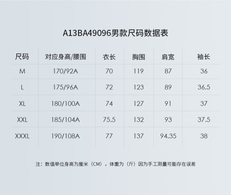 China (cm) 165 / 88-90 170 / 96-98 175 / 108-110 180 / 118-122 185 / 126-130
