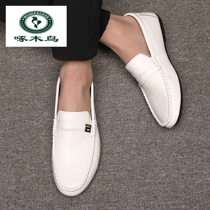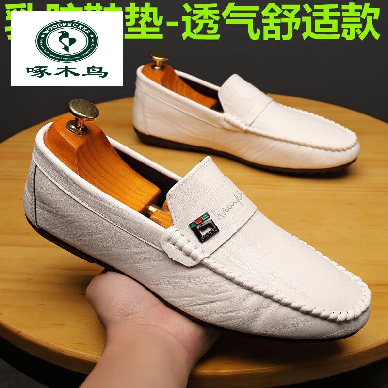 Woodpecker Peas Shoes Men's Spring New Men's Shoes Korean Style Versatile Men's Casual Leather Shoes One-Piece Driving Lazy Shoes 825 White 40 (Wide Feet, Fat Feet, One Size Larger)