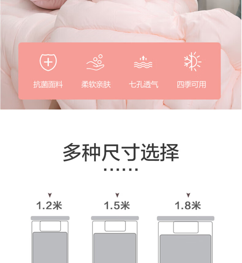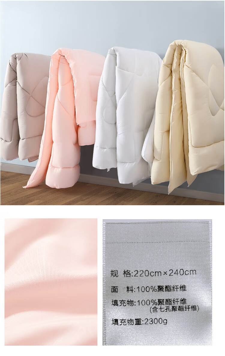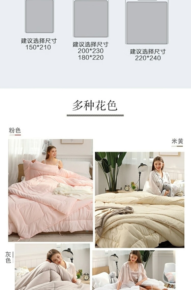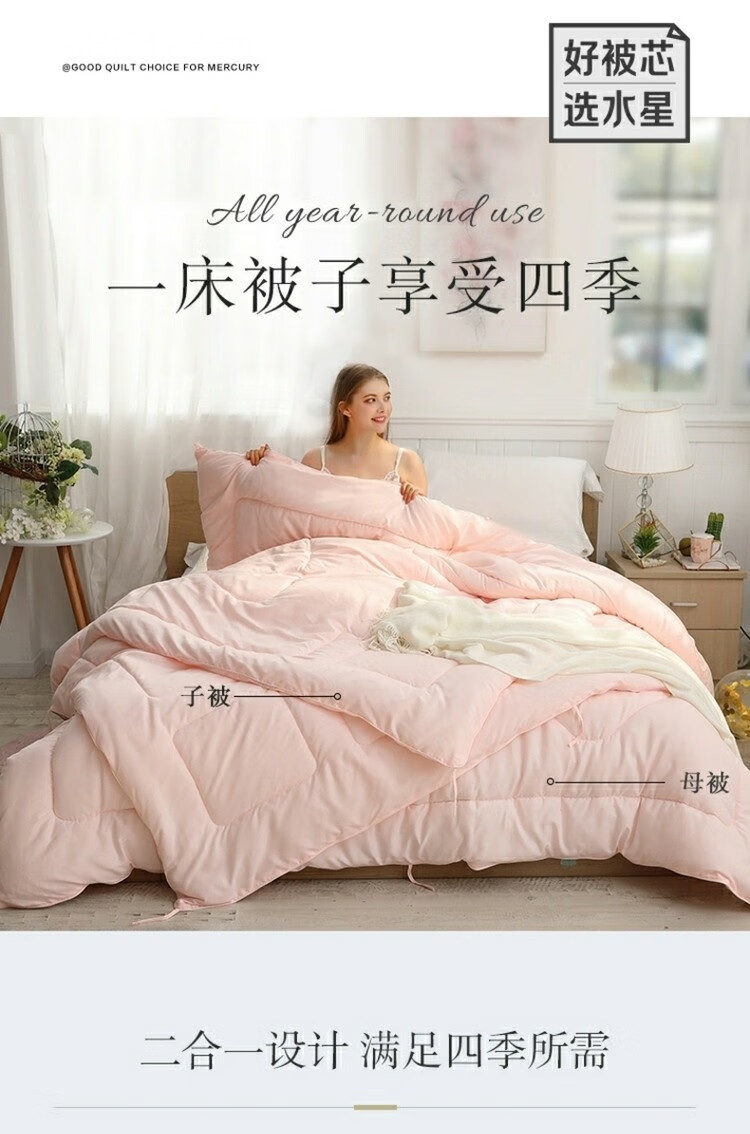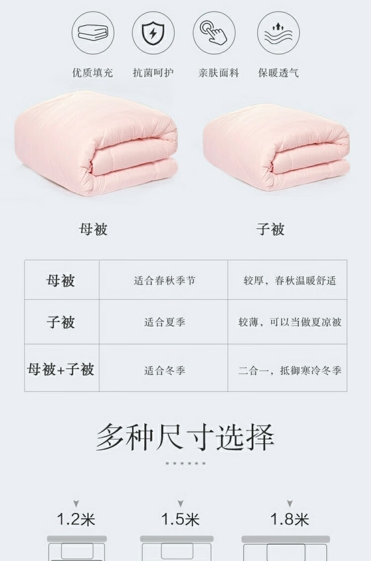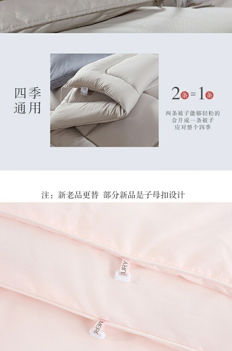 声明:此款产品有多个颜色款式选项,其中颜色选项:二合一款为子母被(通常为一重一轻,一共2条被芯);其他颜色选项:冬被/四季被/夏被均为单条被芯,如有疑问请咨询客服,谢谢~
