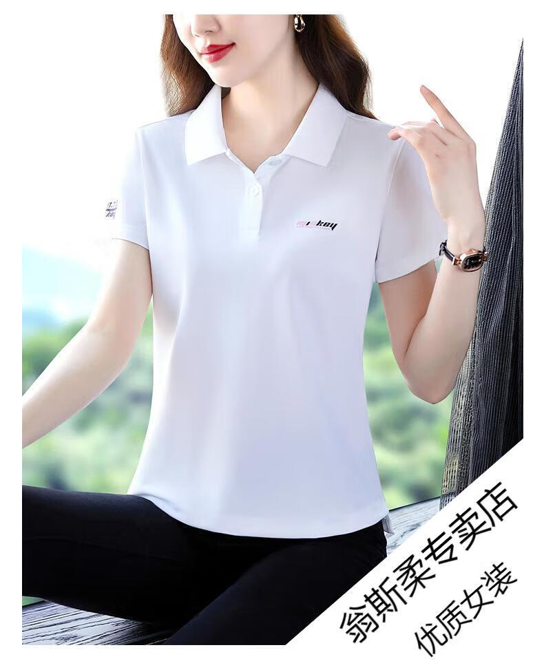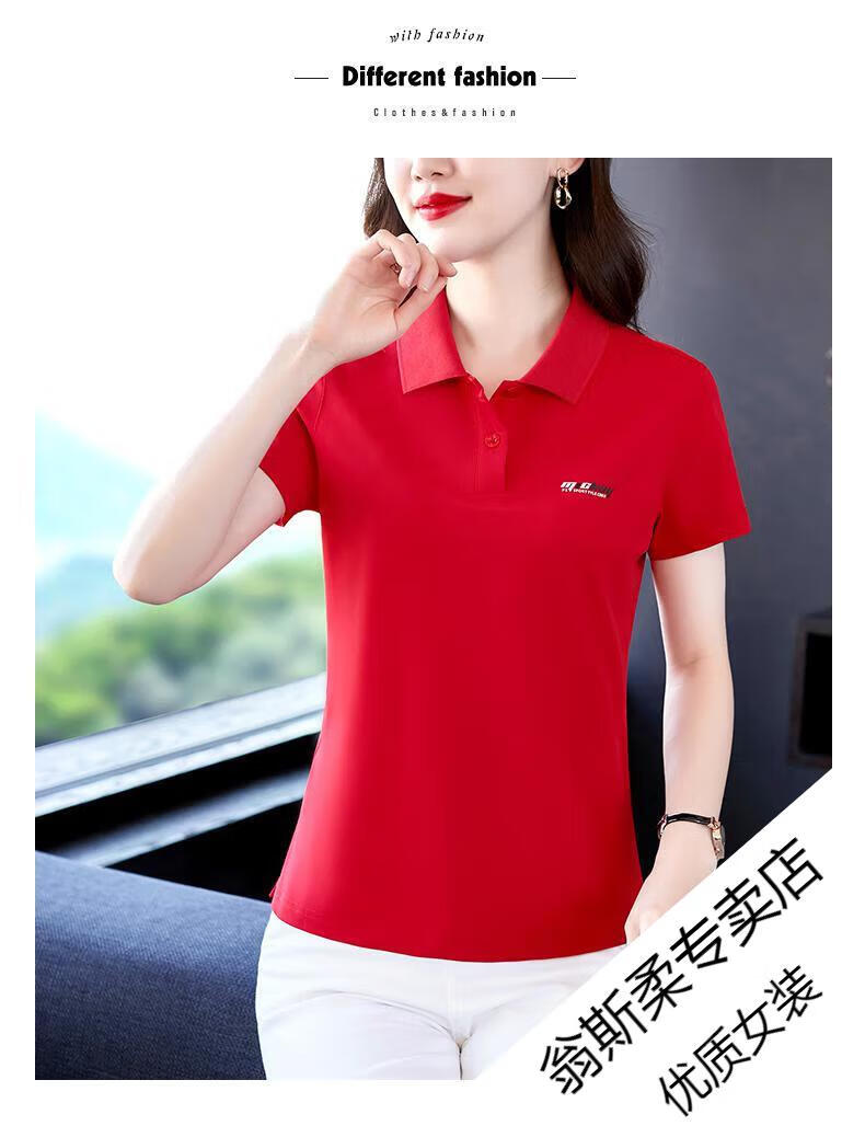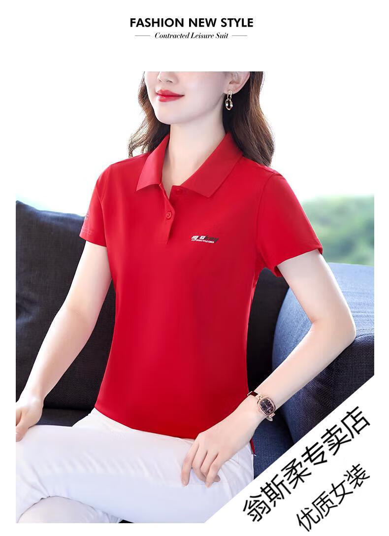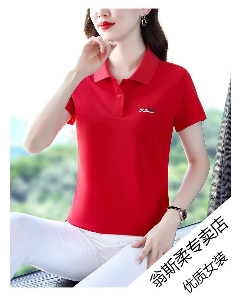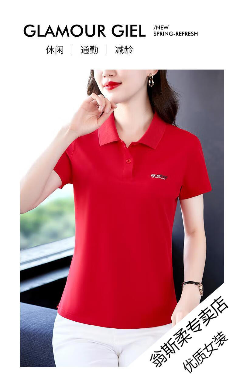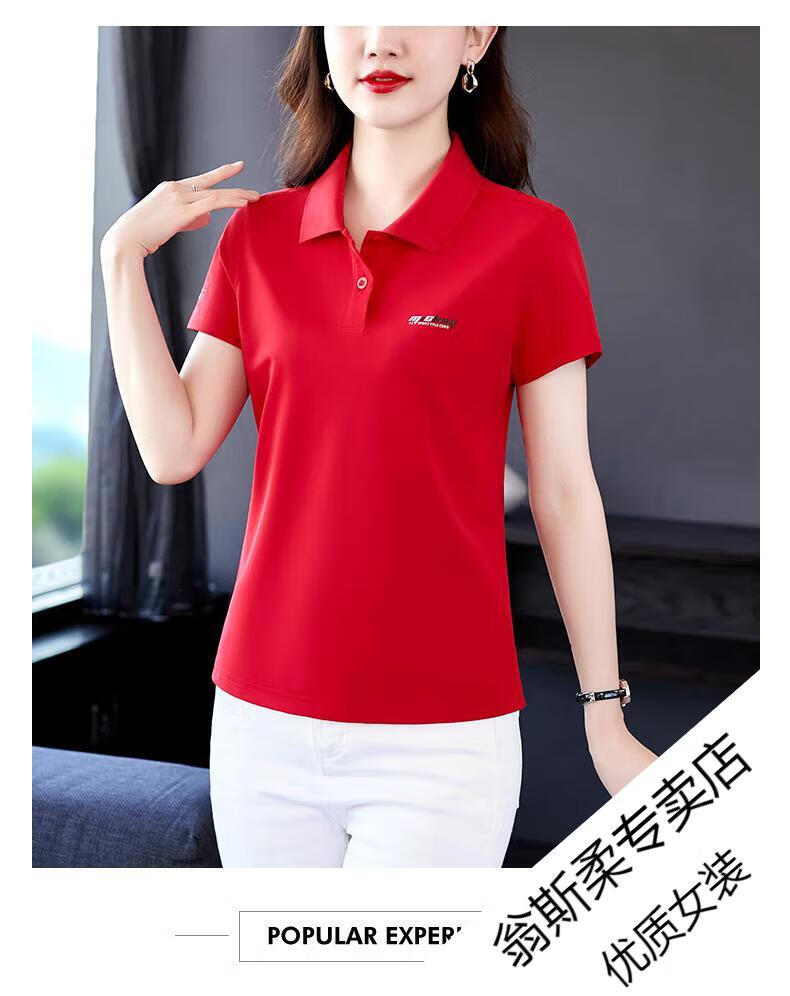 Woodpecker Ice Silk Lapel Casual Short Sleeve T-shirt Women Summer 2025 New Printed Polo Shirt Middle-aged Mom Slim Top Big Red Short/Sleeve XL 110-120Jin Jin equals 0.5 kg