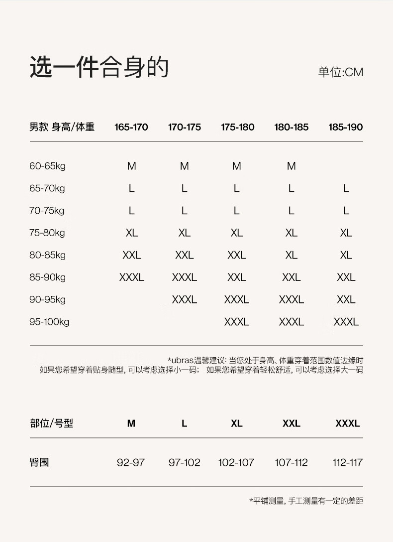 China (cm) 160-165/84-86 165-170 / 88-90 167-172 / 92-96 168-173 / 98-102 170-176 / 106-110