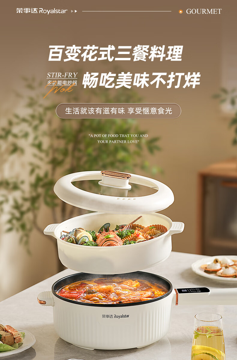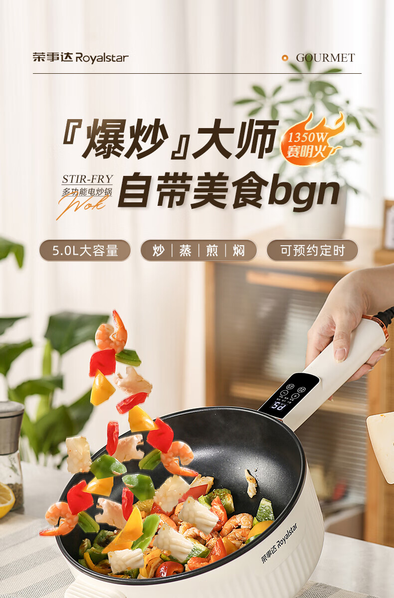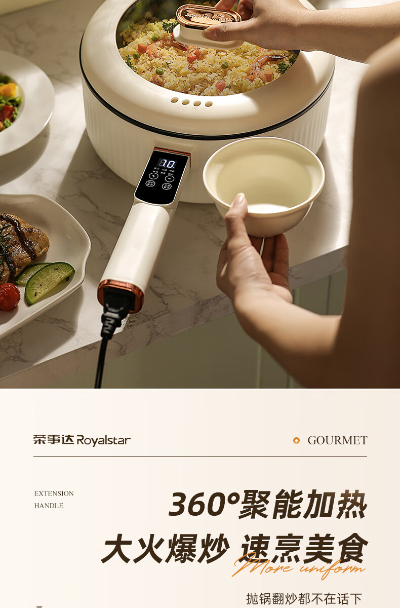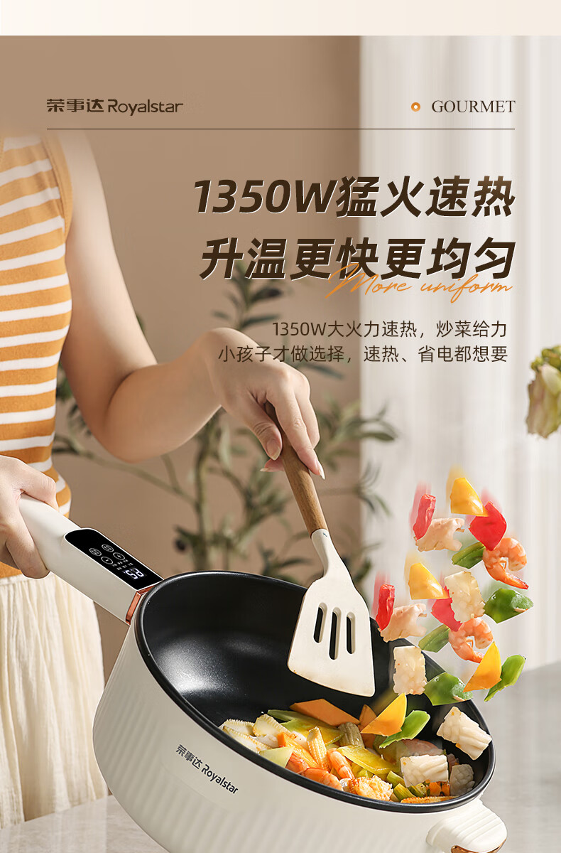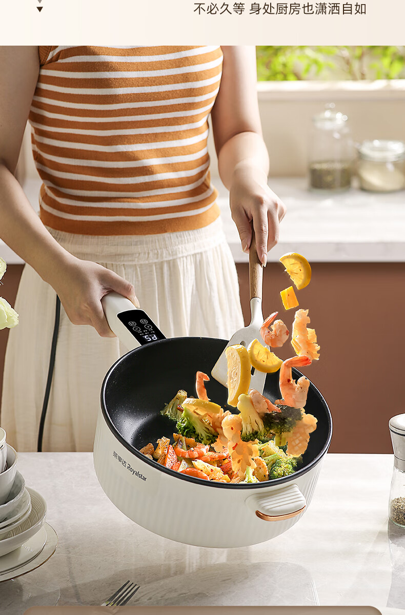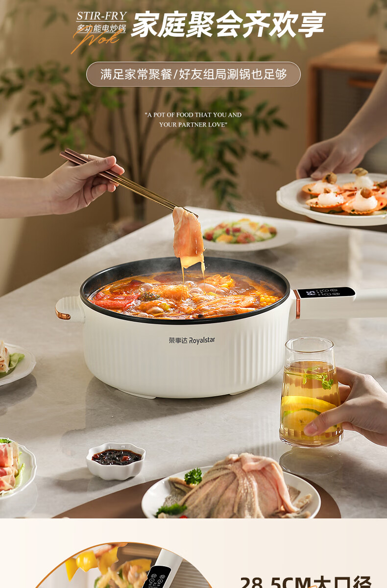 Royalstar electric wok, electric cooking pot, electric hot pot, multi-functional household electric hot pot, multi-purpose pot, one pot, multi-purpose small household appliances, steaming, frying, all-in-one cooking pot, non-stick pot, plug-in Royalstar electric wok with wooden spatula, extra thick version, 4.5L+ steamer mechanical version, for 3 to 5 people