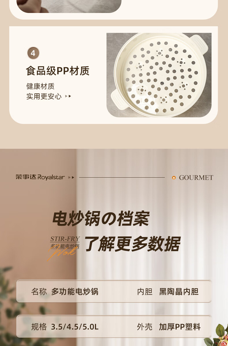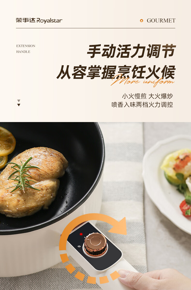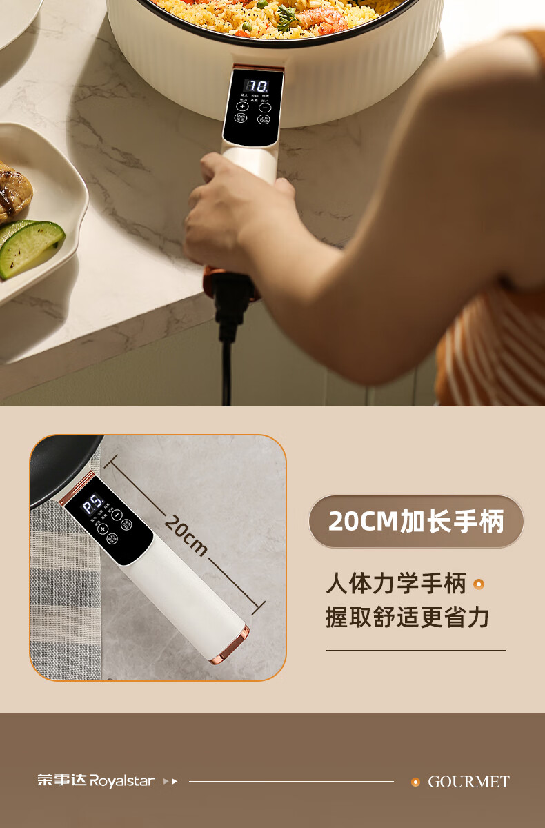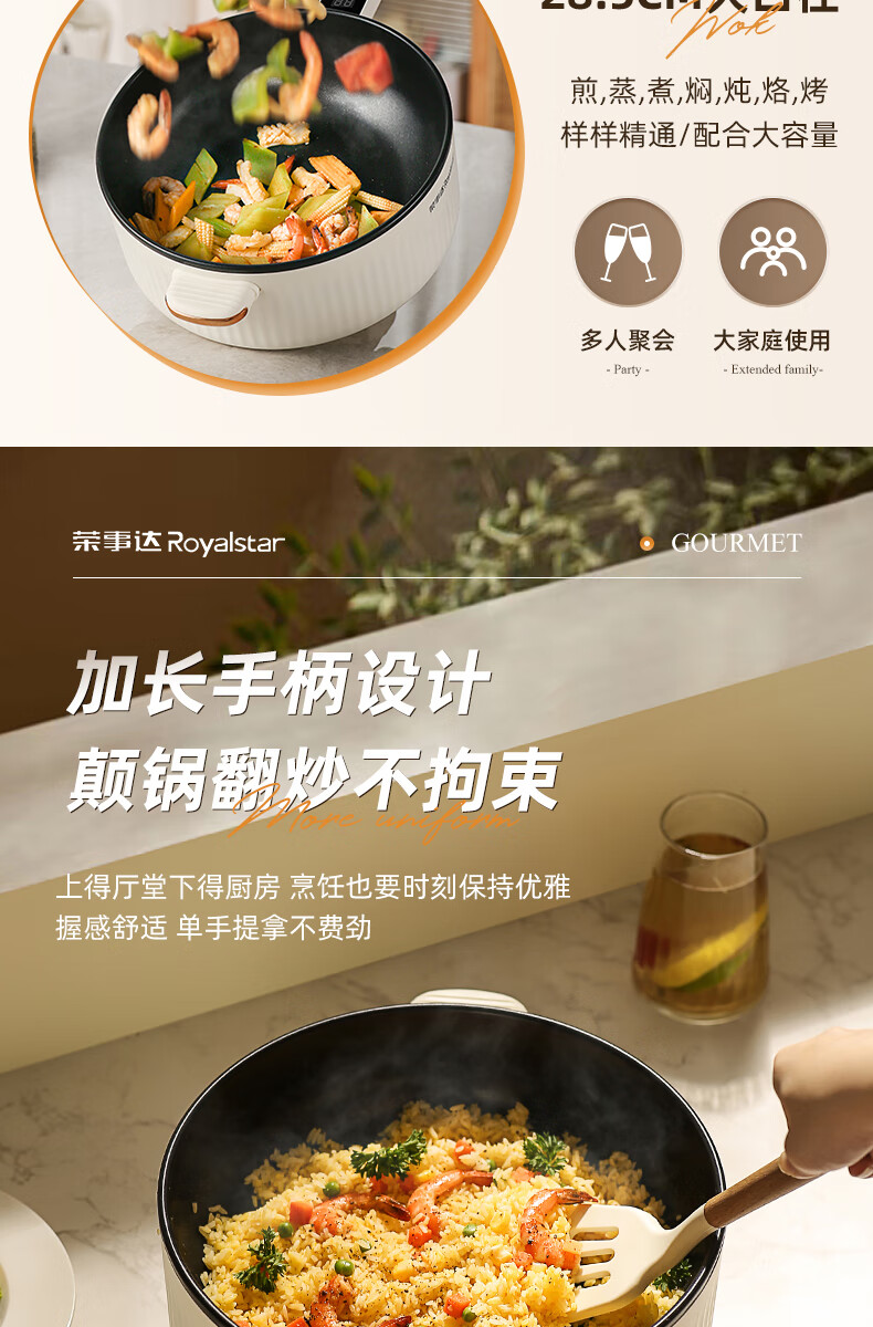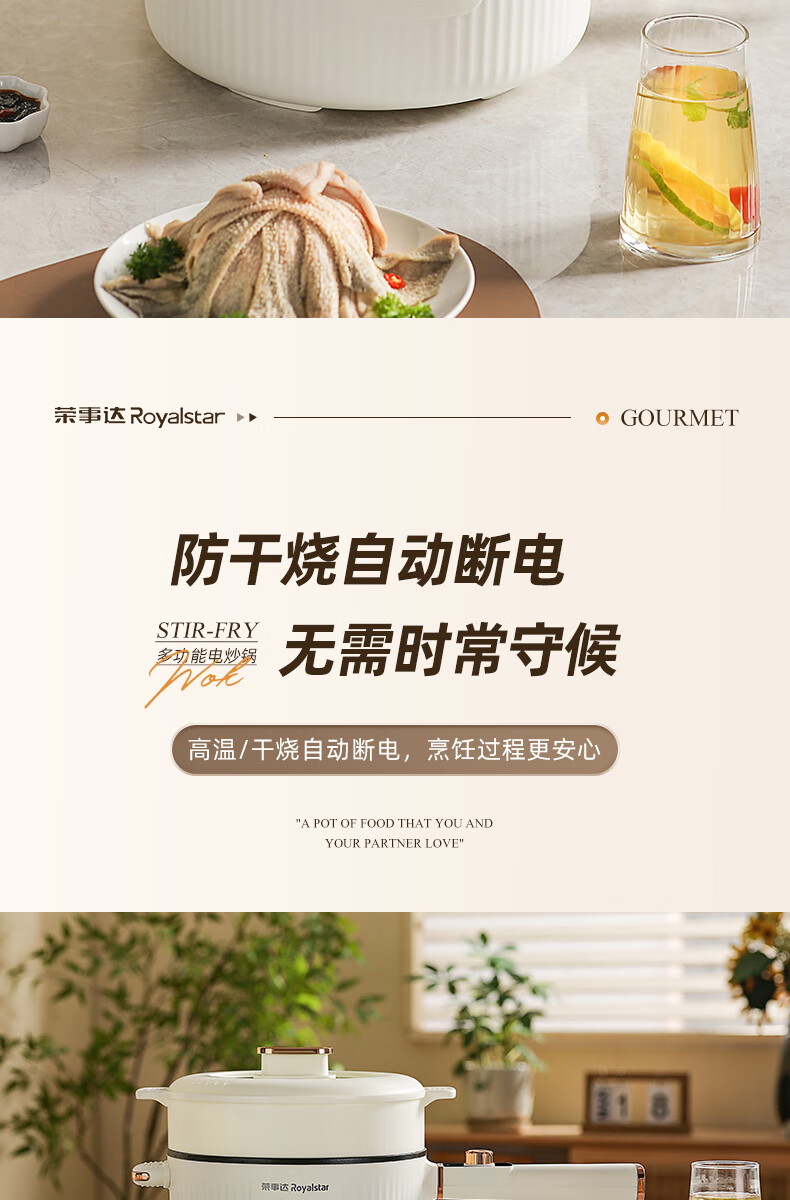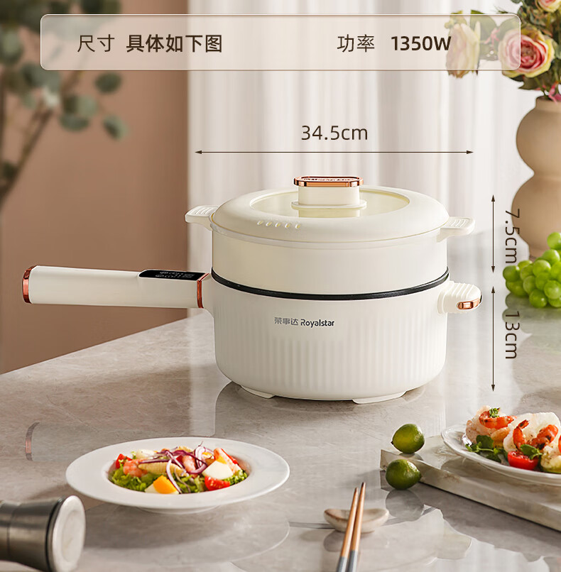 Royalstar electric wok, electric cooking pot, electric hot pot, multi-functional household electric hot pot, multi-purpose pot, one pot, multi-purpose small household appliances, steaming, frying, all-in-one cooking pot, non-stick pot, plug-in Royalstar electric wok with wooden spatula, extra thick version, 4.5L+ steamer mechanical version, for 3 to 5 people