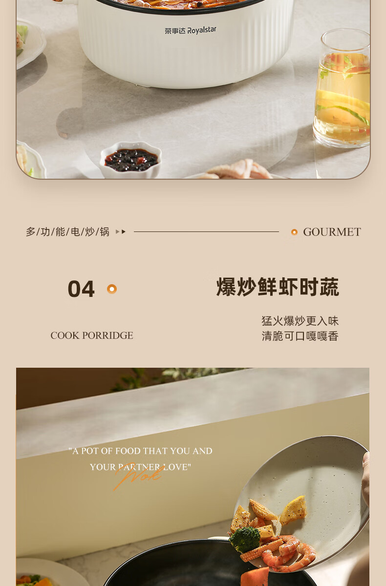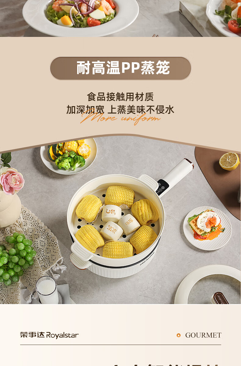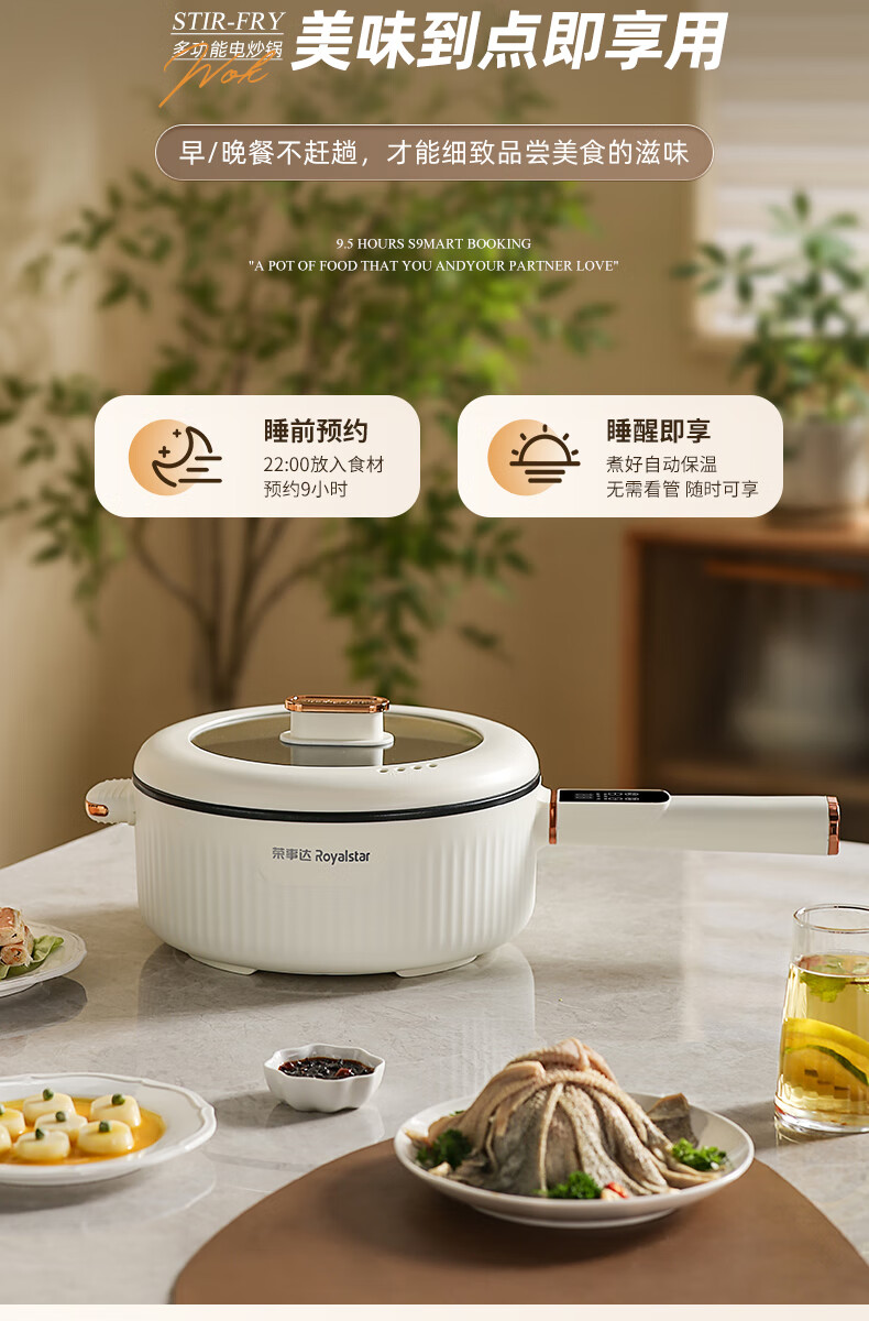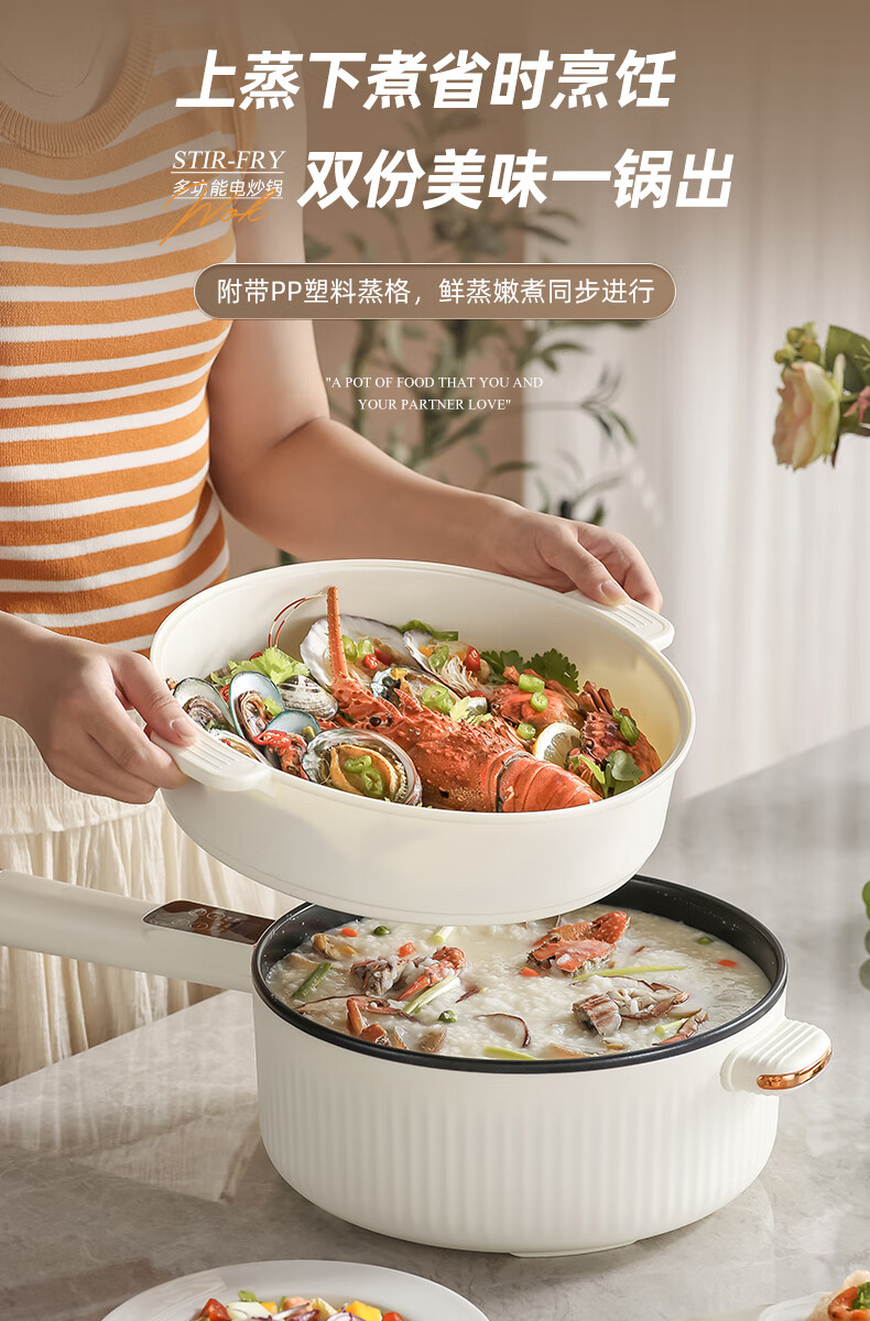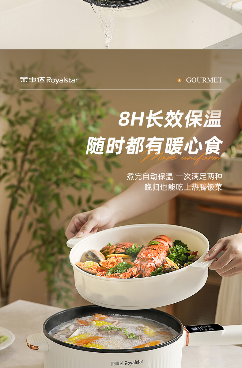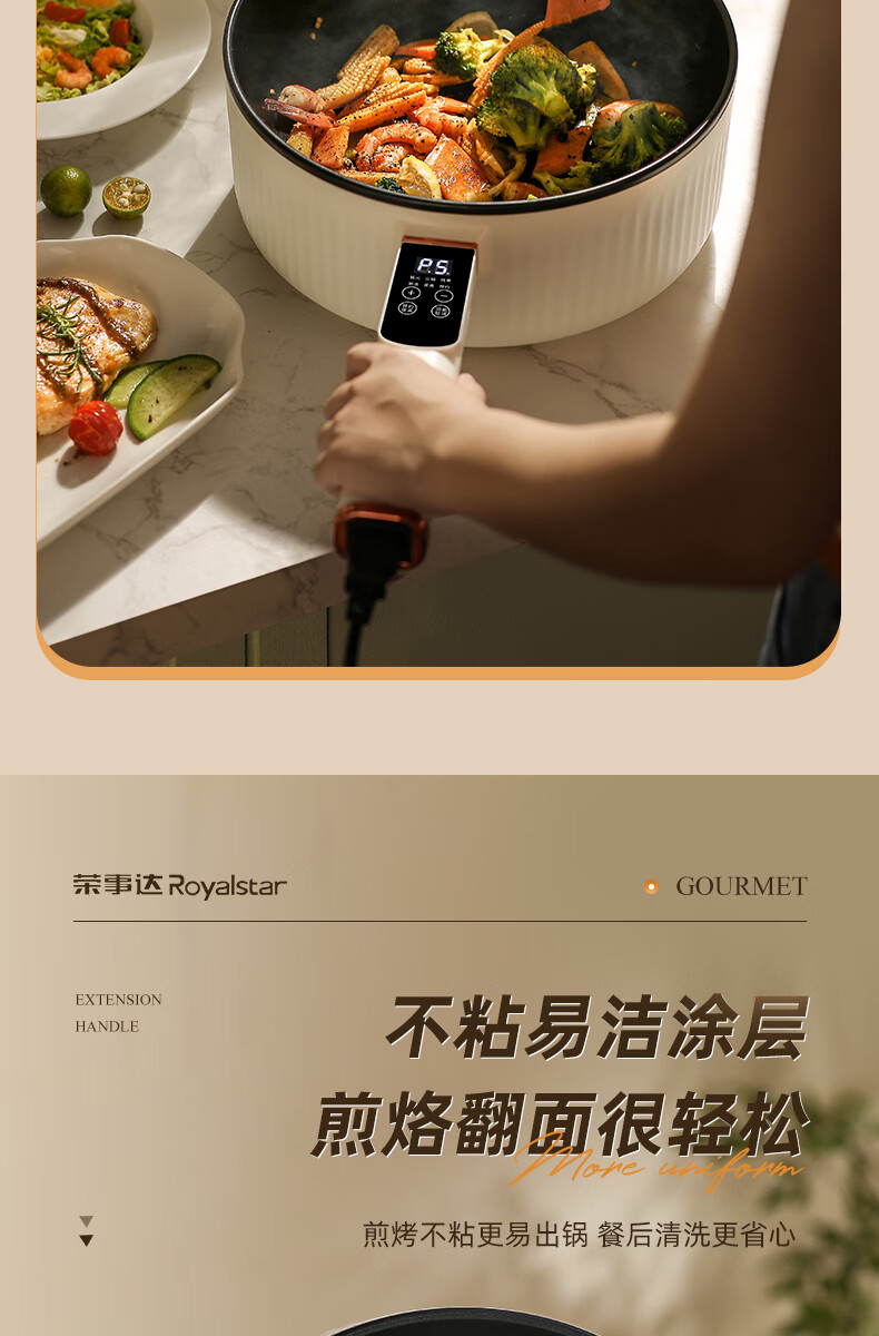 Royalstar electric wok, electric cooking pot, electric hot pot, multi-functional household electric hot pot, multi-purpose pot, one pot, multi-purpose small household appliances, steaming, frying, all-in-one cooking pot, non-stick pot, plug-in Royalstar electric wok with wooden spatula, extra thick version, 4.5L+ steamer mechanical version, for 3 to 5 people