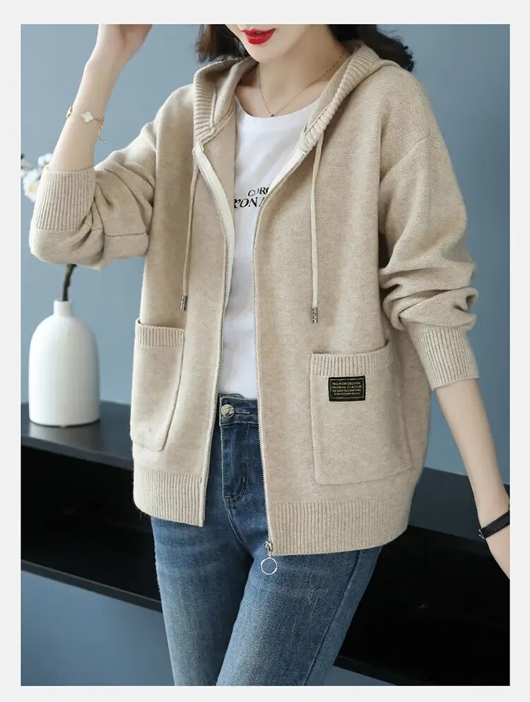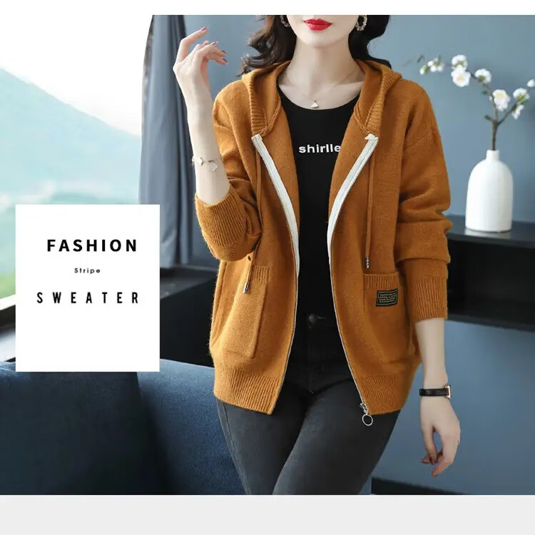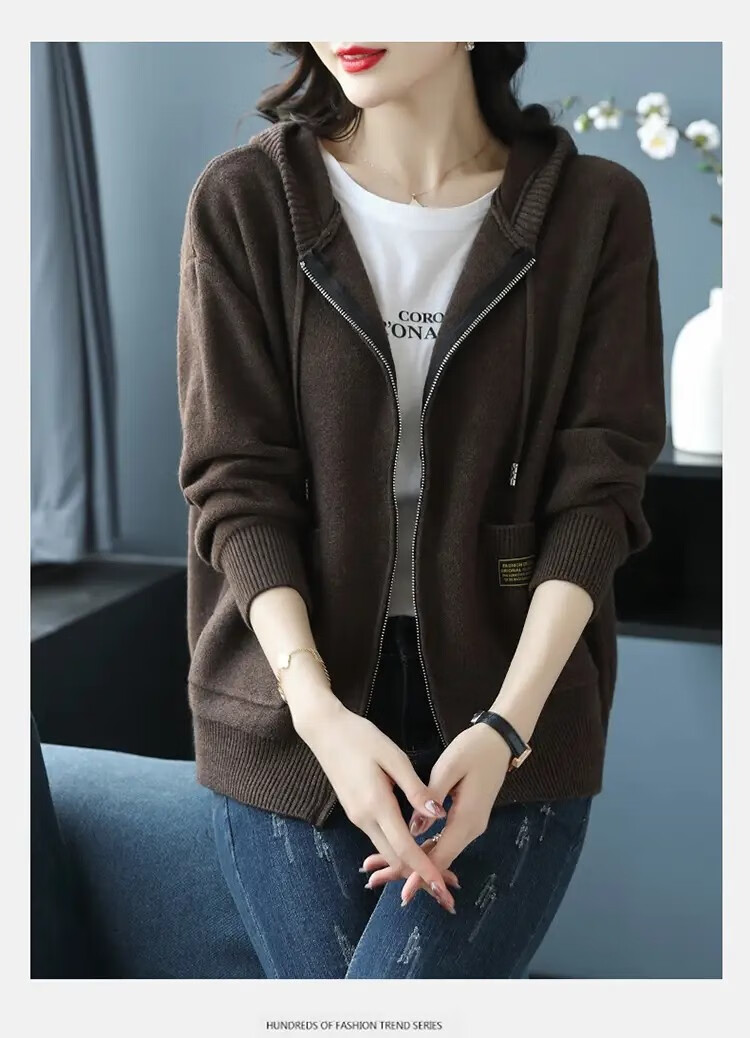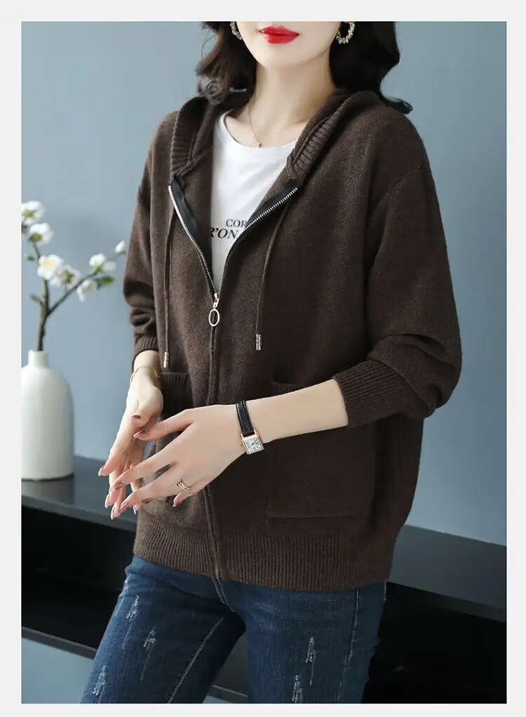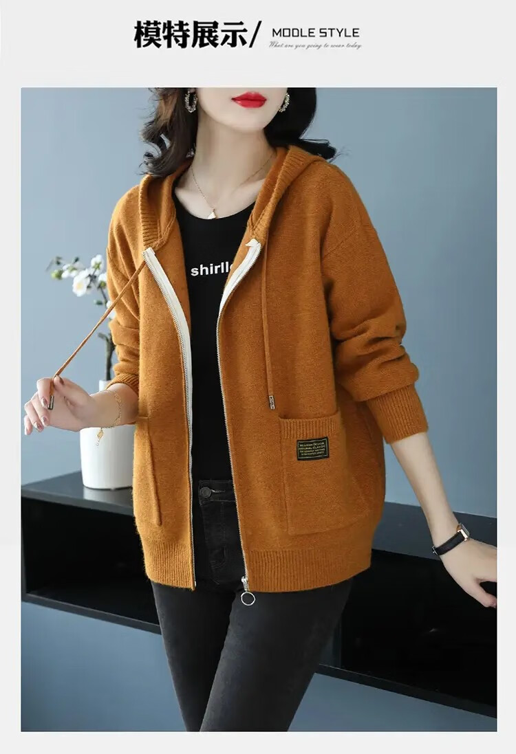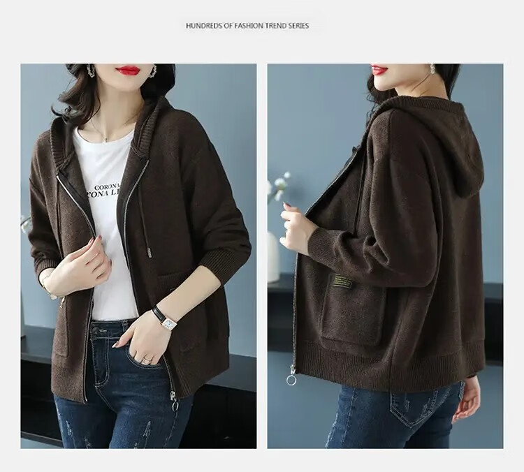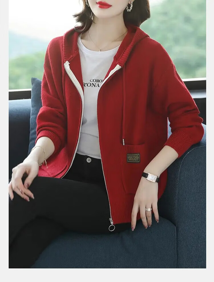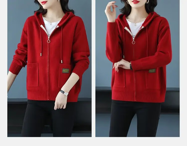Red Dragonfly hooded sweater short coat for women spring and autumn new fashion fashion outer warm loose hooded knitted cardigan brown long sleeves one size