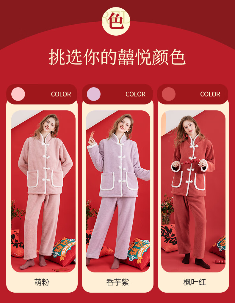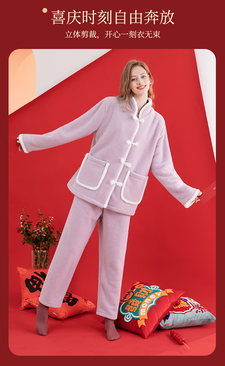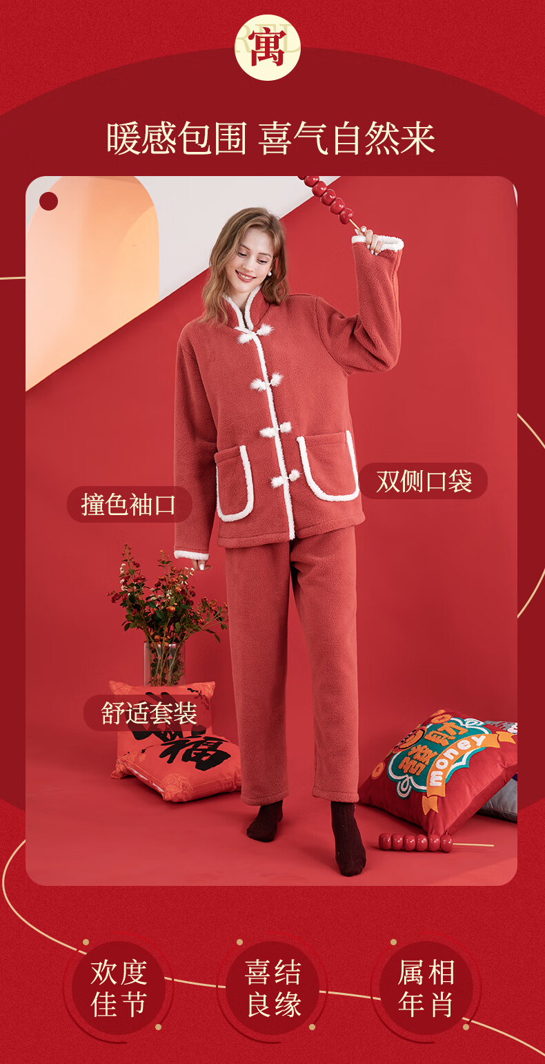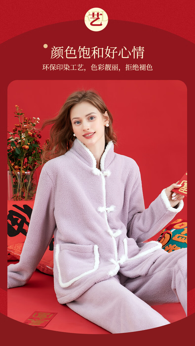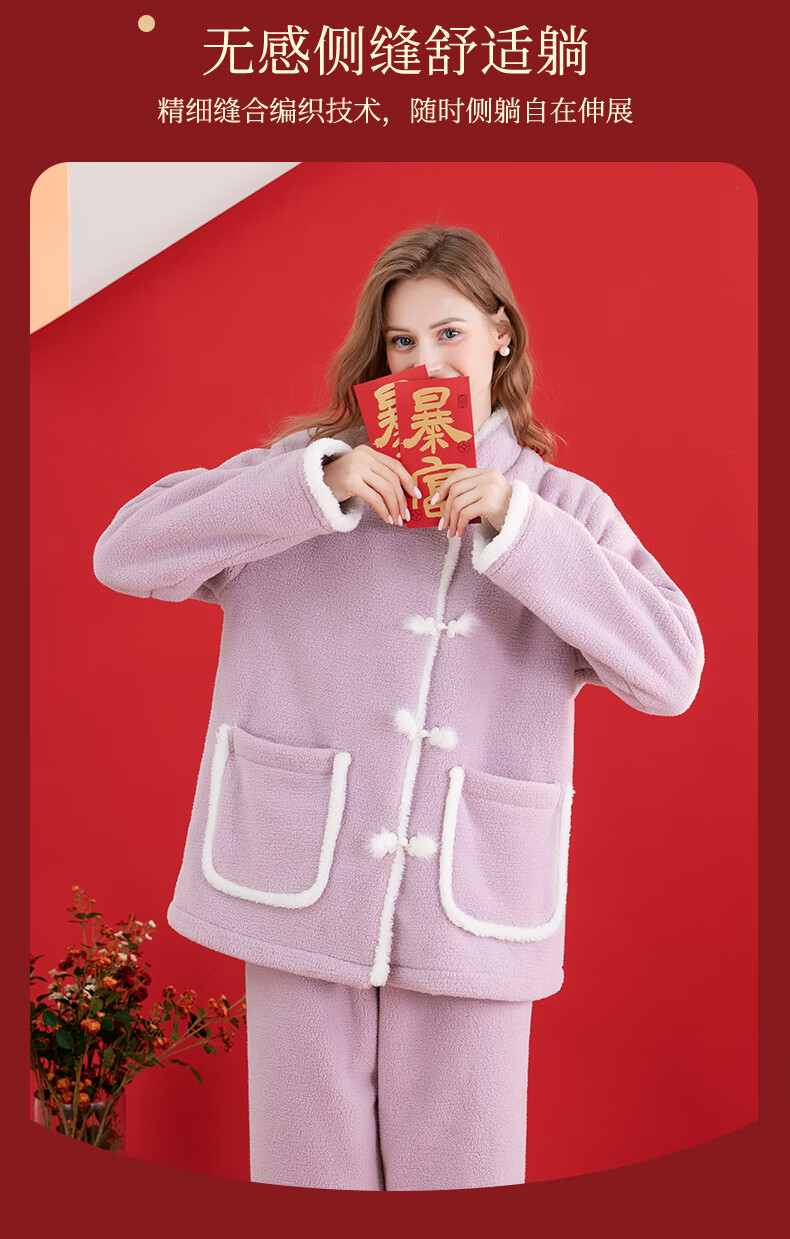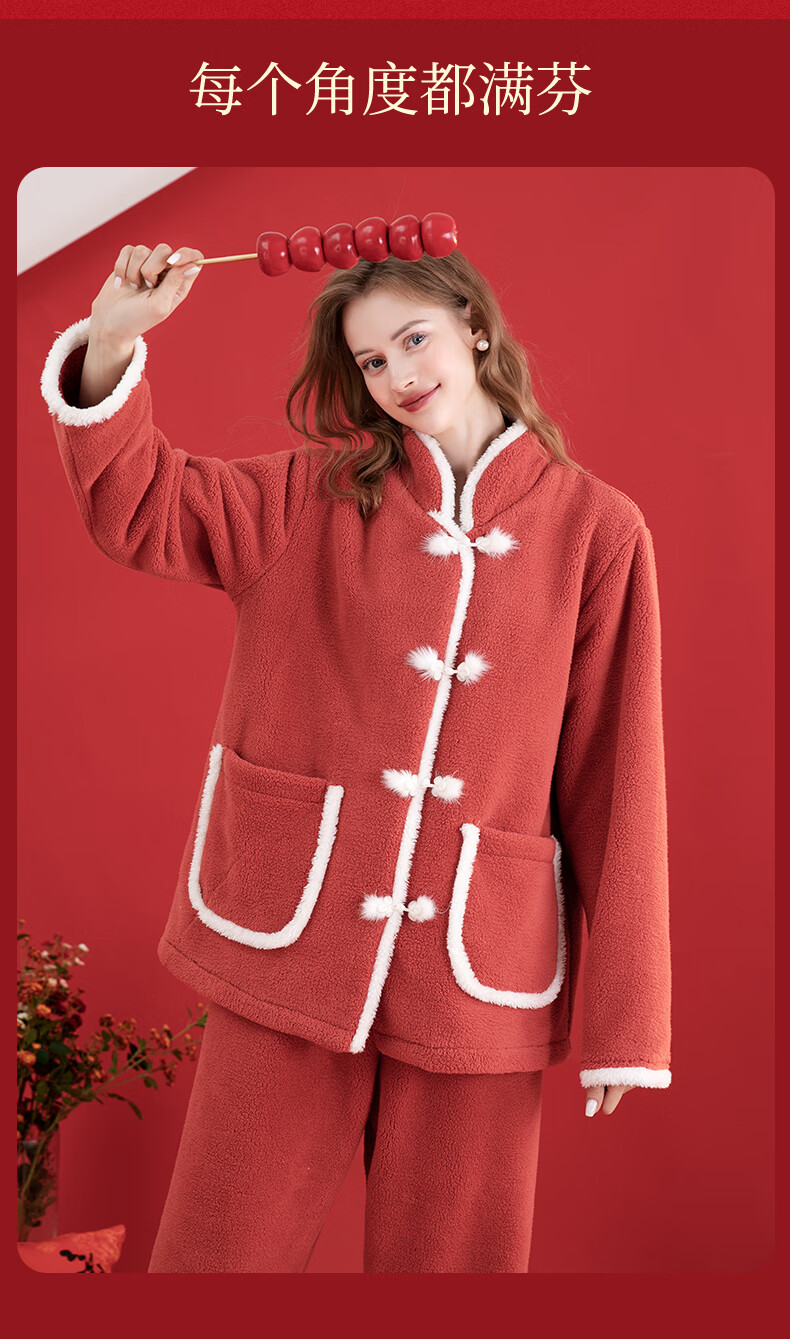 Fenton Pajamas Women's Autumn and Winter Coral Velvet Thickened Stand-up Collar Long Sleeve Imitation Sherpa Festive Chinese Pajamas Home Clothing New Year Maple Leaf Red XL