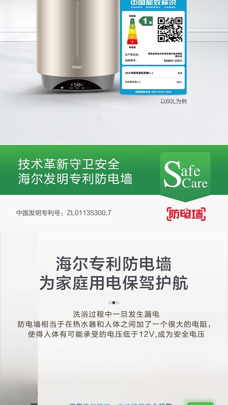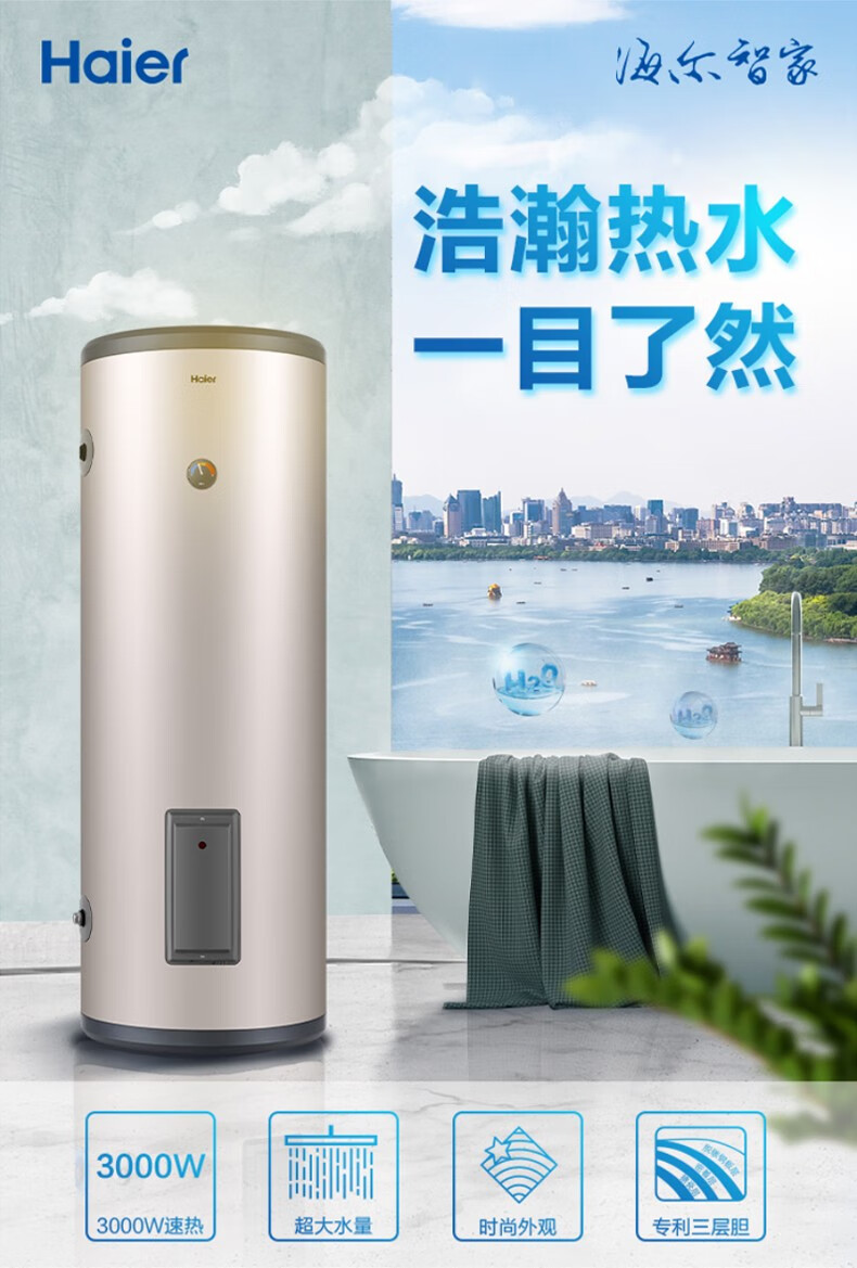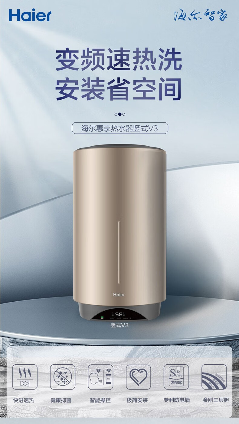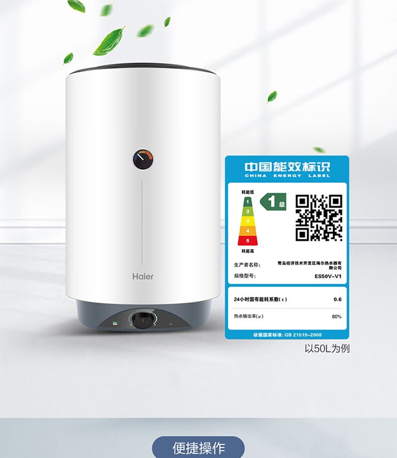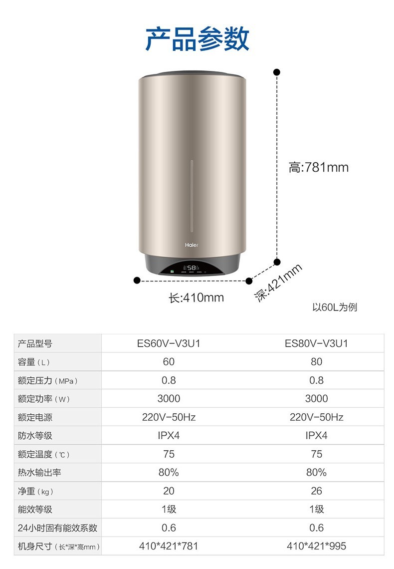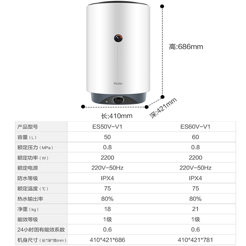 Haier вертикальный вертикальный электрический водонагреватель бытовой вертикальный вертикальный заводской парикмахерская ванна общежитие коммерческий центральный электрический водонагреватель для всего дома накопительный водонагреватель 60л 3000Вт 60л ES60V-V3U1
