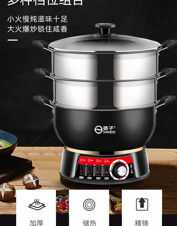 Yangzi electric wok multi-functional household electric hot pot non-stick electric pot steaming and stewing all-in-one plug-in cooking pot dormitory electric cooking pot for 1-10 people timed version pottery crystal non-stick pot 30CM four lights double steamer thickened and deepened