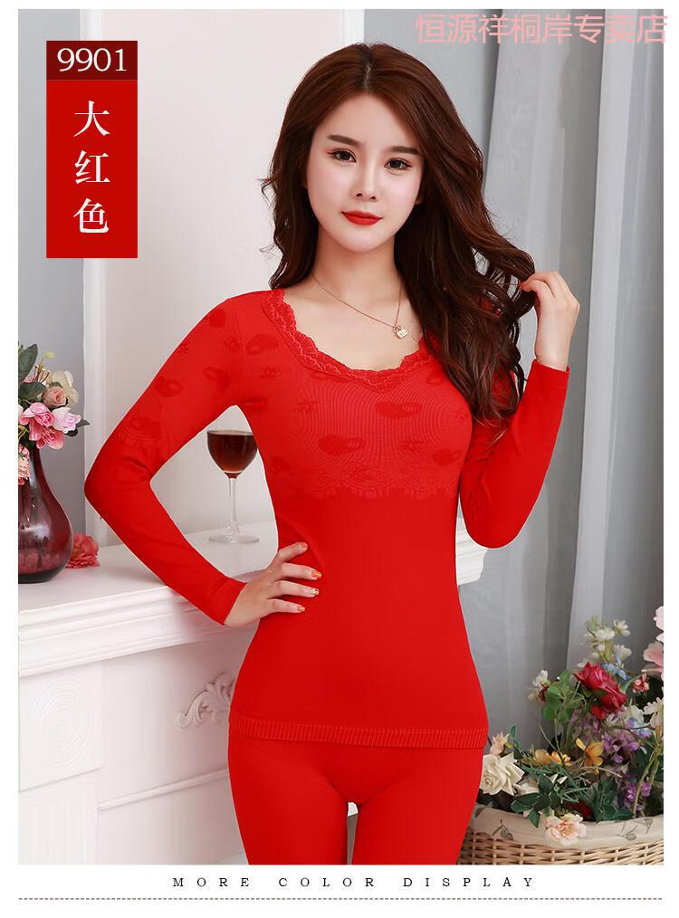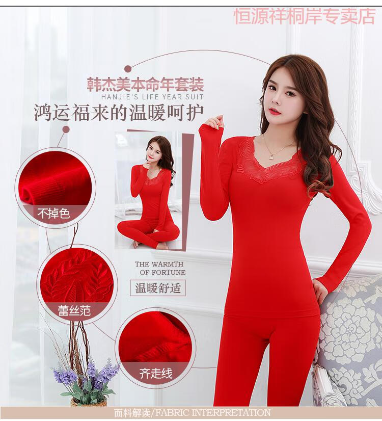Hengyuanxiang (hengyuanxiang) red zodiac year autumn clothes and long pants suit for women and men for marriage, plus velvet red horse year warm body underwear 9906 red female L 80-110 Jin Jin equals 0.5 kg