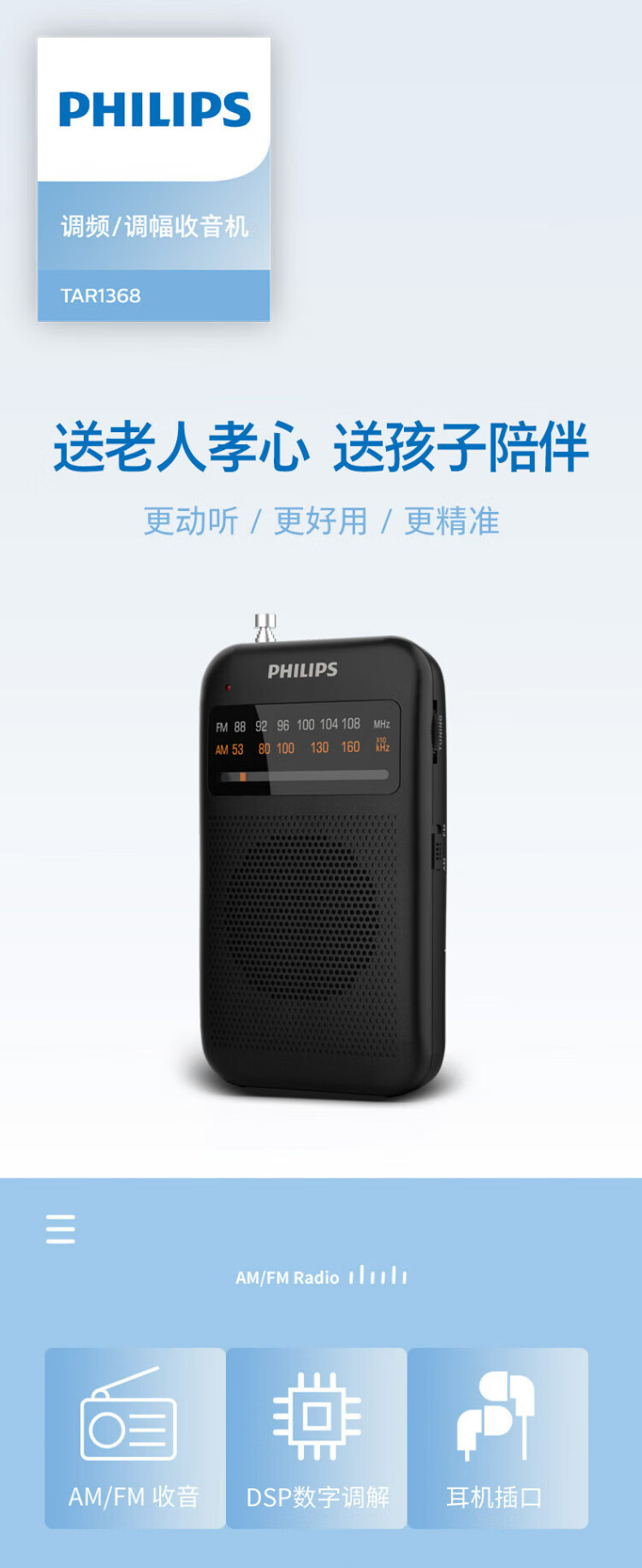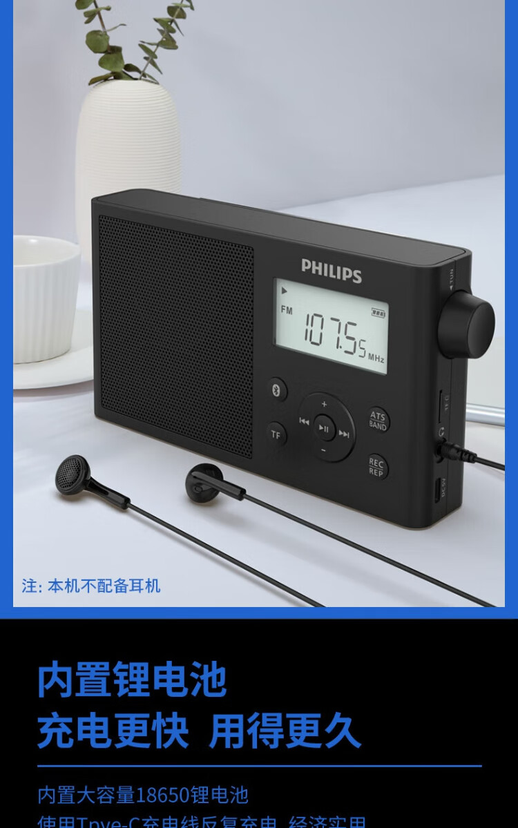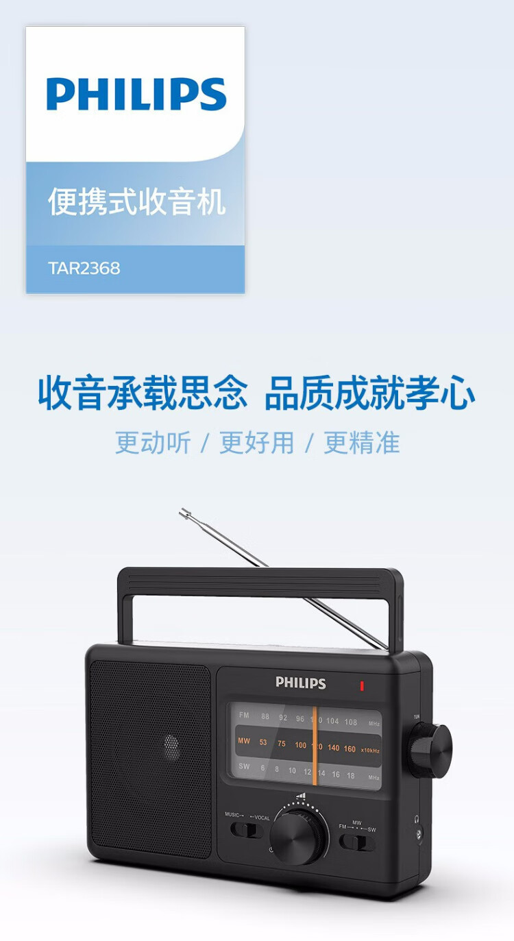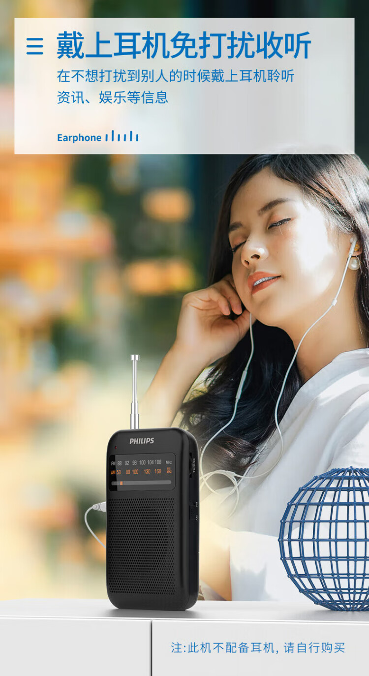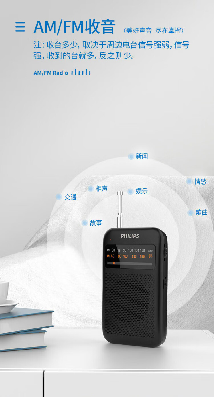 Philips TAR1368 portable small mini pocket radio broadcast FM radio for the elderly with long battery life outdoor artifact as a gift for parents TAR1368 comes with headphones + dual band