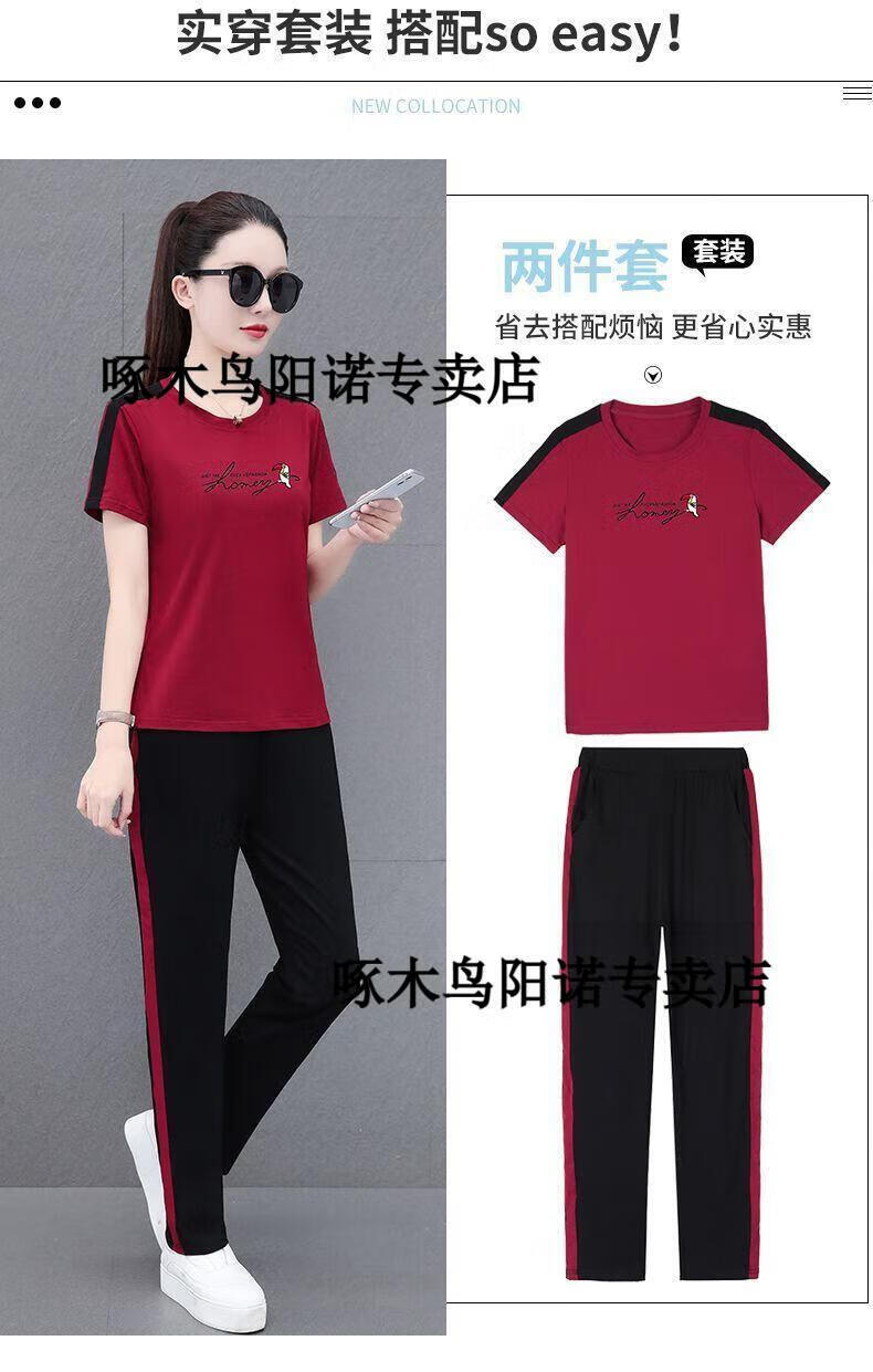 Woodpecker Sports Suit Women's Pure Cotton Casual Suit Women's Short Sleeve 2025 Summer New Style Middle-aged Mother's Wear Two-piece Set WK690 Maroon Cropped Pants Pure Cotton XL (110Jin Jin is equal to 0.5kg -125Jin Jin is equal to 0.5kg)