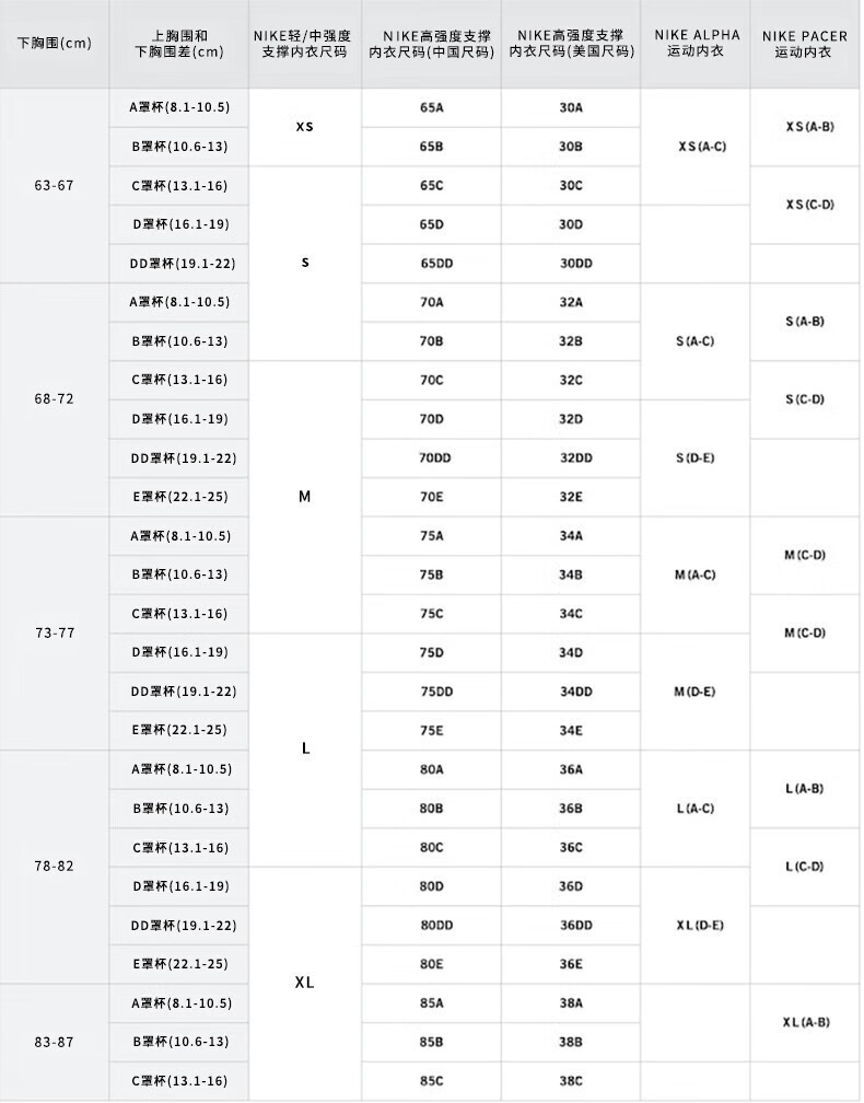 China (cm) 160-165/84-86 165-170 / 88-90 167-172 / 92-96 168-173 / 98-102 170-176 / 106-110